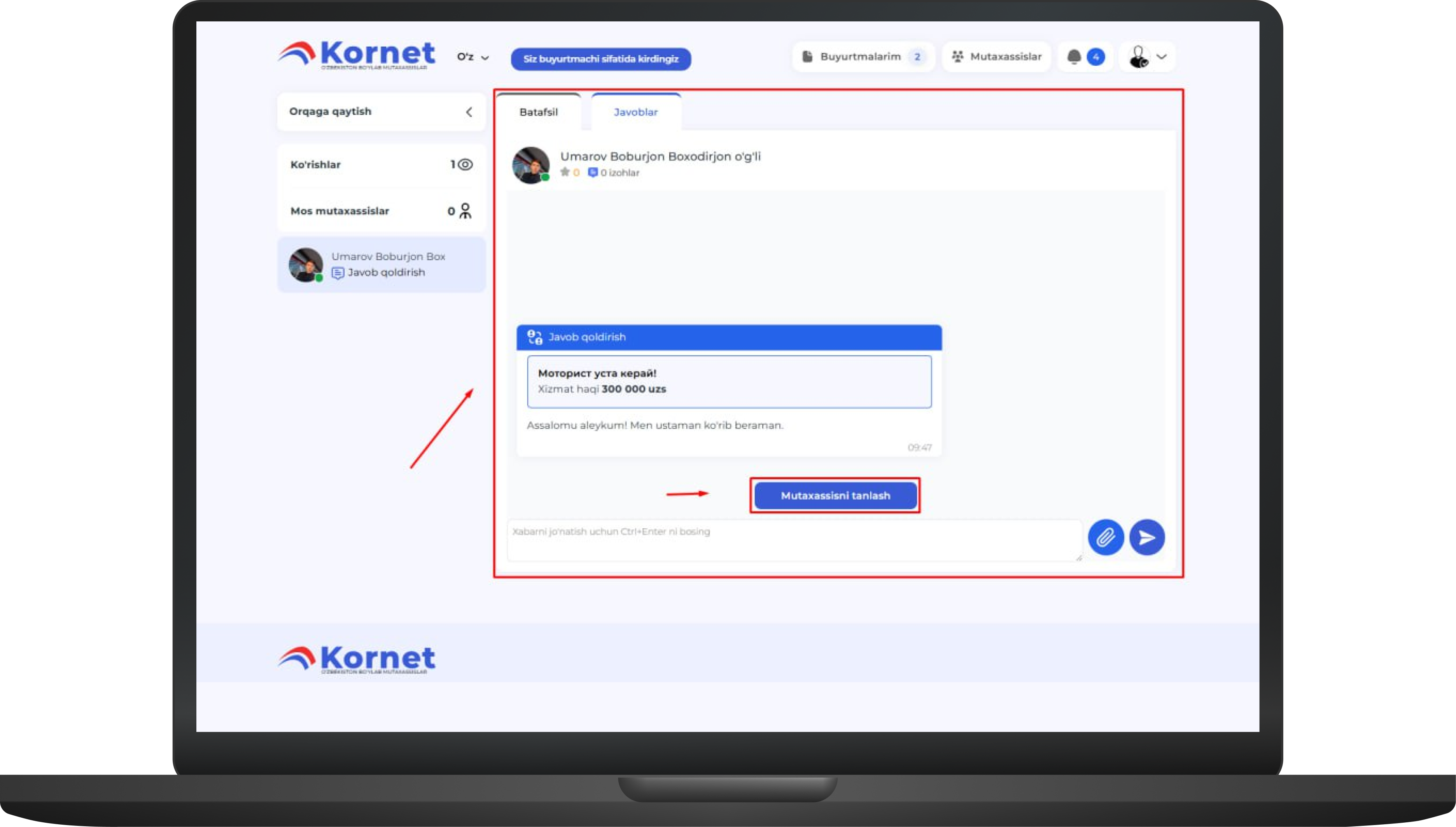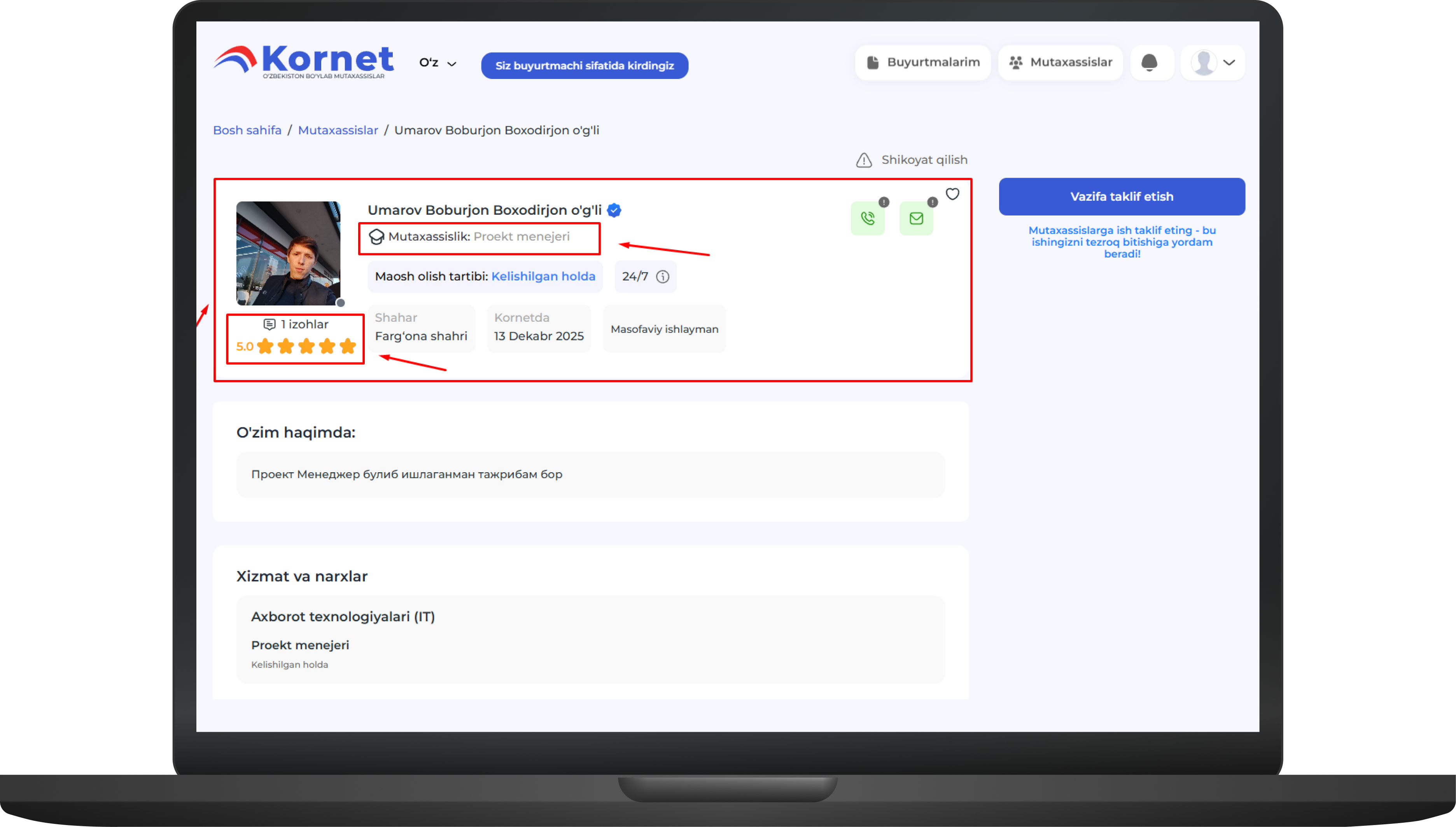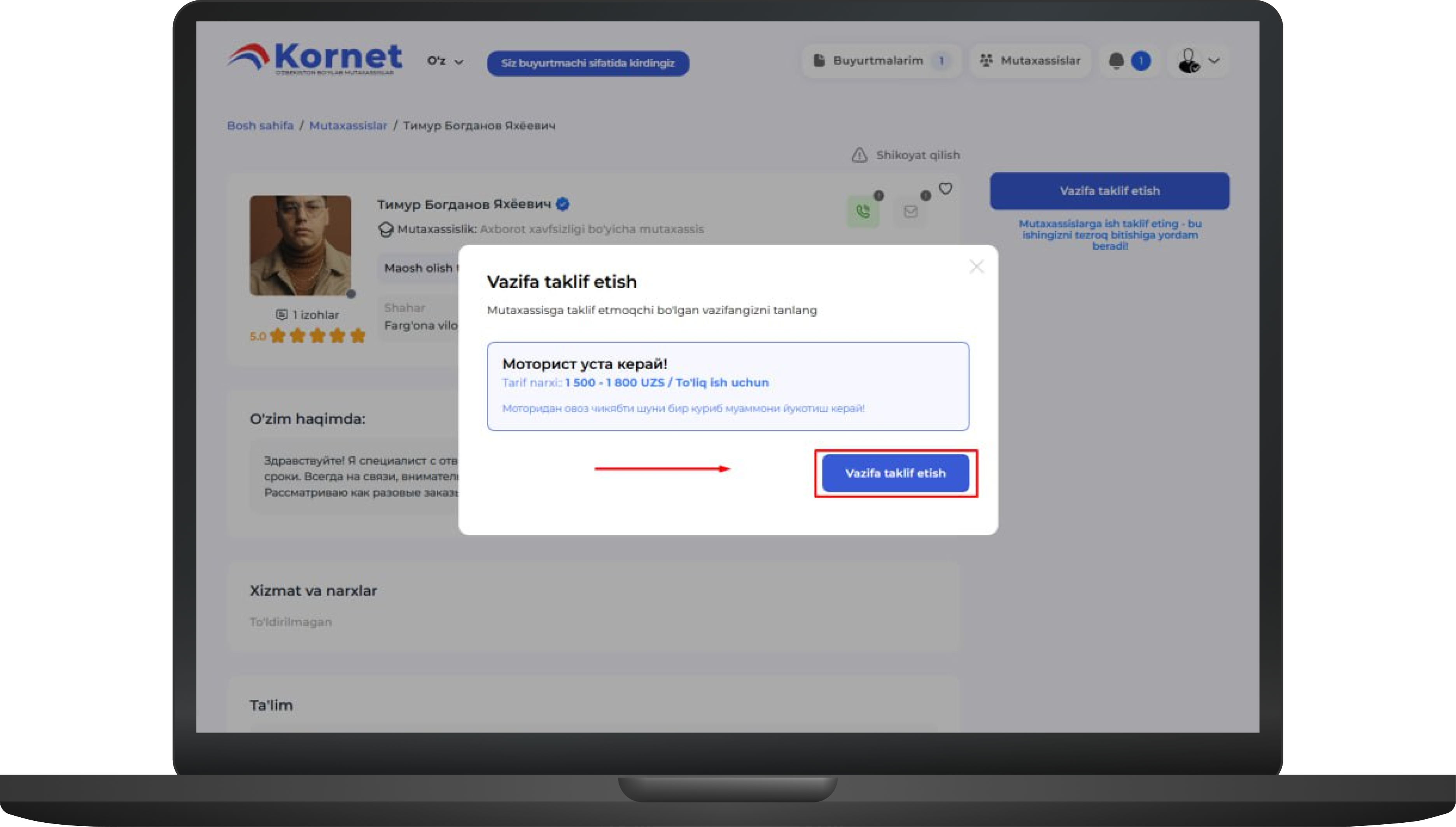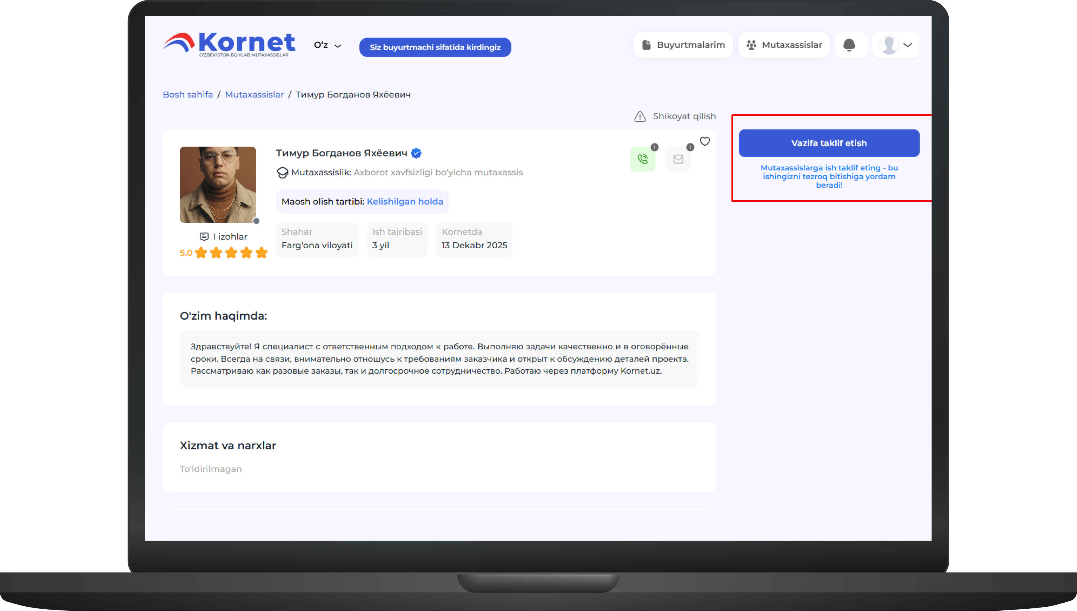 Topshiriq faollashtirilgandan so‘ng, sizga ushbu sohadagi mutaxassislardan “JAVOBLAR” (takliflar) kela boshlaydi. Taklif olish bosqichi — eng mas’uliyatli jarayondir, chunki aynan shu yerda siz rejalashtirishdan real mutaxassisni tanlashga o‘tasiz. kornet.uz saytida takliflar olish jarayoni haqida nimalarni bilish muhim: Bu qanday sodir bo‘ladi: Bildirishnomalar: Mutaxassis o‘z xizmatlarini taklif qilganda, siz (sozlamalarga qarab sayt, ilova yoki SMS/Telegram orqali) xabarnoma olasiz. Raqobat: Aniq tavsiflangan va mos narx belgilangan yaxshi buyurtmalarga, odatda, dastlabki 15–30 daqiqa ichida bir nechta takliflar tushadi. Mutaxassis taklifida nimalarga e’tibor berish kerak: Tanlovda xato qilmaslik uchun har bir nomzodni uchta mezon bo‘yicha tahlil qiling: Reyting va Sharhlar: Bu ustaning «yuzi». Boshqa mijozlar nima deb yozganini ko‘rib chiqing. Muddatlar kechiktirilganmi? Ish sifatli bajarilganmi? Portfolio:kornet.uz’dagi tajribali mutaxassislar ko‘pincha o‘zlarining real ishlari fotosuratlarini yuklashadi. Agar vazifa murakkab bo‘lsa (ta’mirlash, dizayn), ularni albatta o‘rganib chiqing. Taklif matni: Usta qanday javob berayotganiga e’tibor bering. Agar u shunchaki «qilaman» deb yozsa, bu bir holat. Agar u sizning topshirig‘ingiz bo‘yicha aniqlashtiruvchi savollar bersa — demak, u tavsifni diqqat bilan o‘qigan va ishga chin dildan qiziqmoqda.image.png1.74 MB