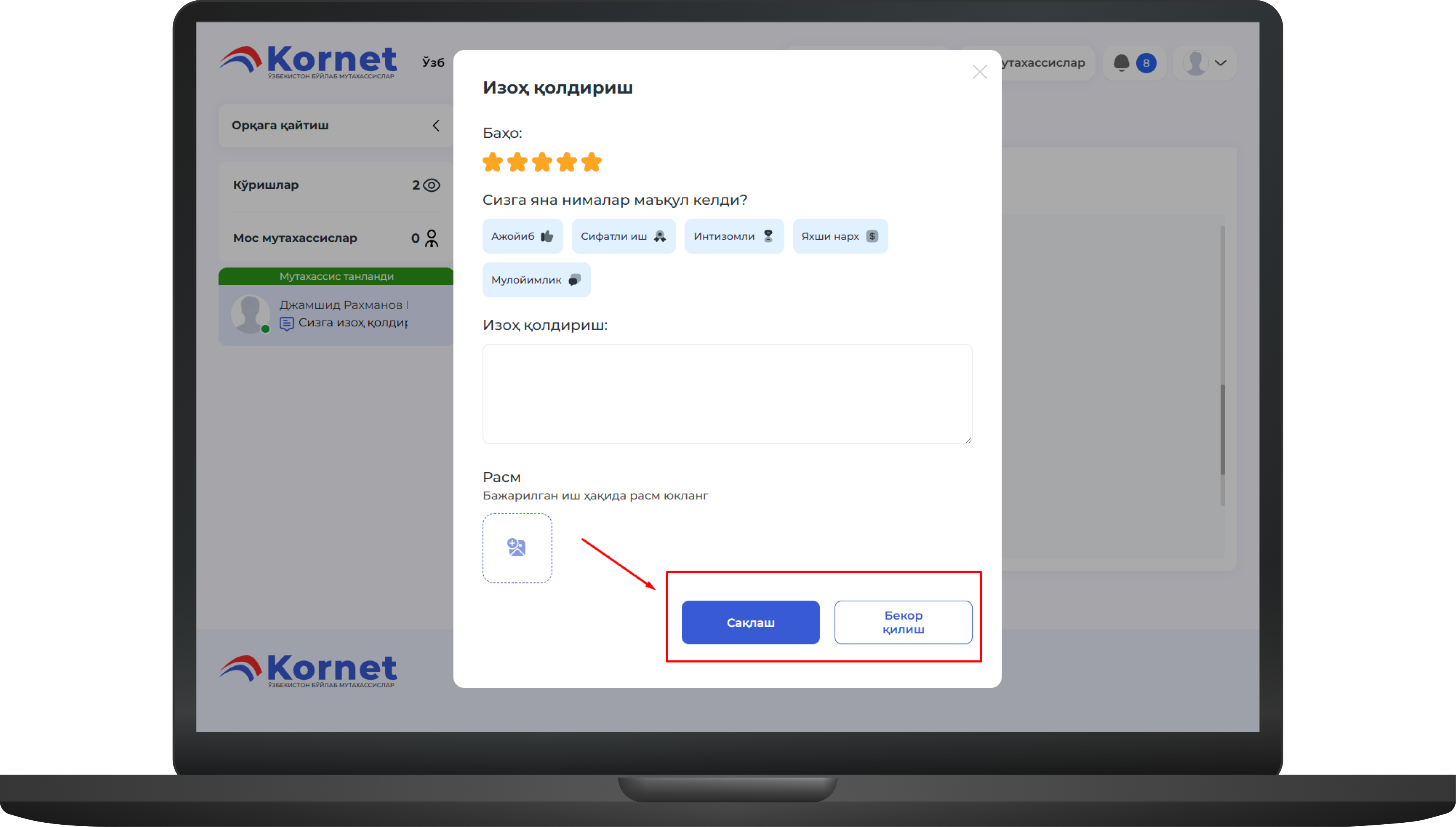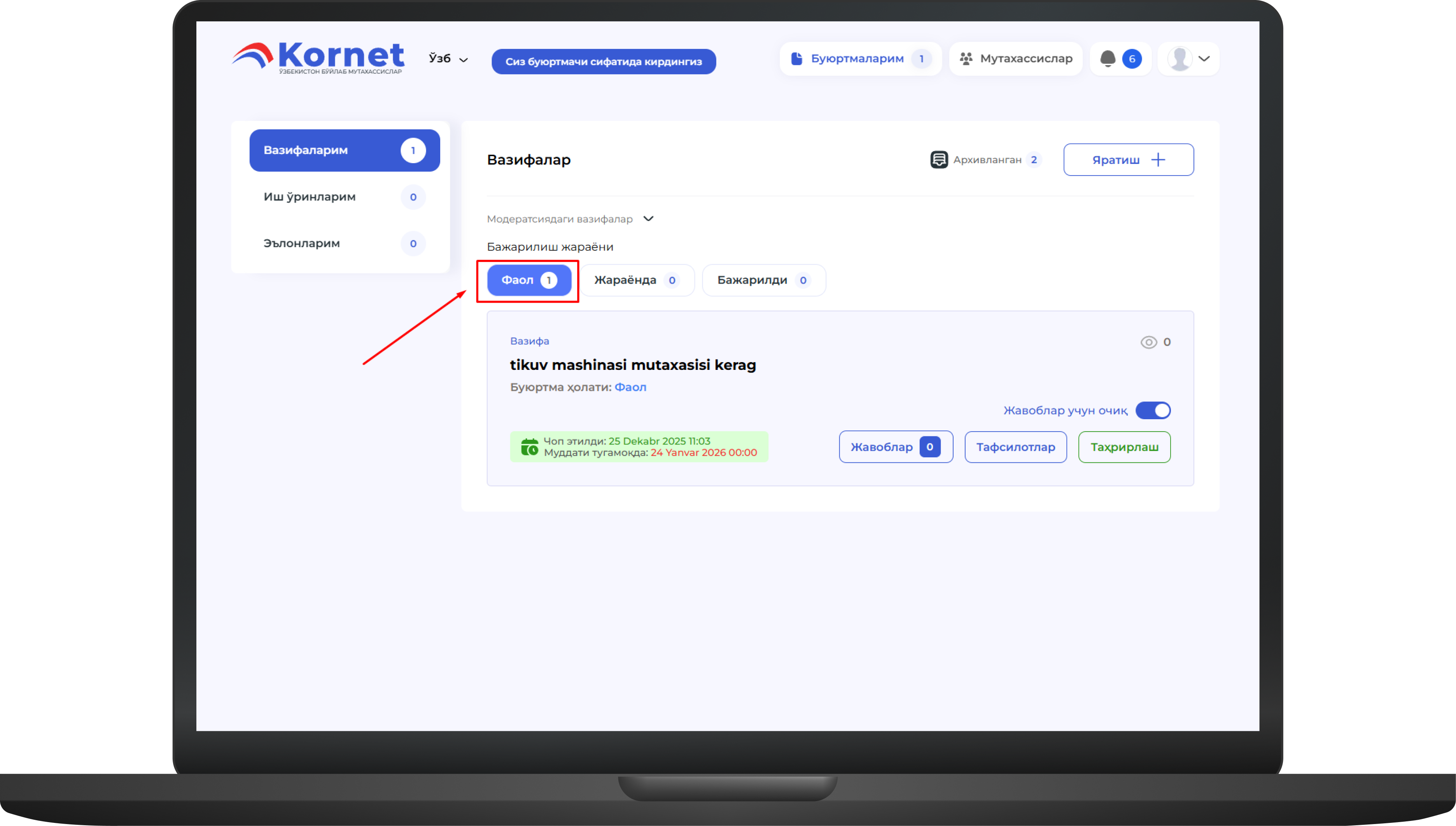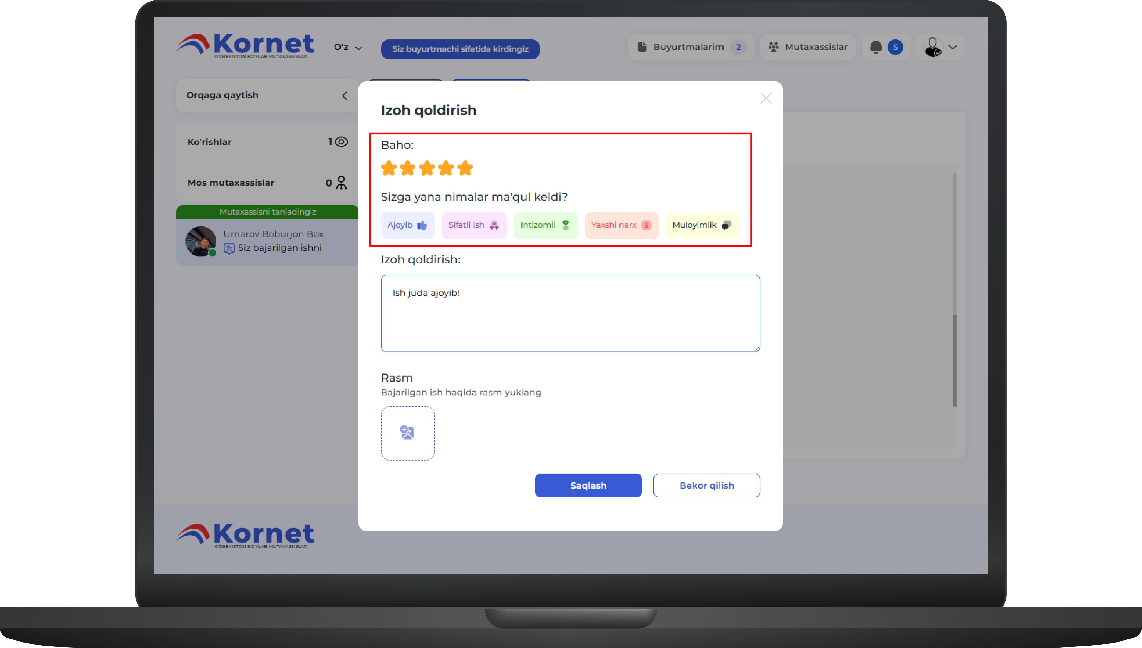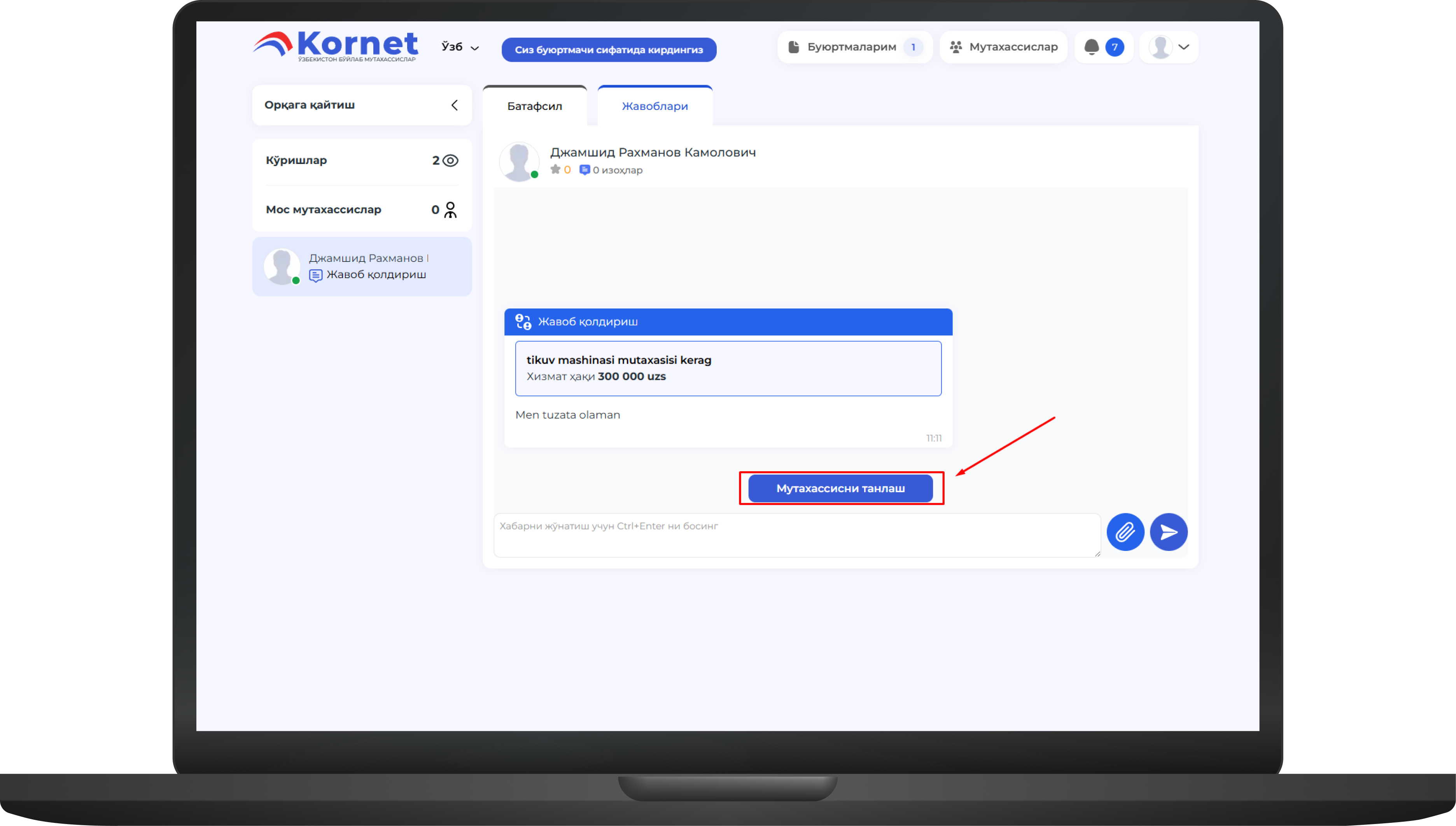 Topshiriq faollashtirilgandan so‘ng, sizga ushbu sohadagi mutaxassislardan “JAVOBLAR” (takliflar) kela boshlaydi. Taklif olish bosqichi — eng mas’uliyatli jarayondir, chunki aynan shu yerda siz rejalashtirishdan real mutaxassisni tanlashga o‘tasiz. kornet.uz saytida takliflar olish jarayoni haqida nimalarni bilish muhim: Bu qanday sodir bo‘ladi: Bildirishnomalar: Mutaxassis o‘z xizmatlarini taklif qilganda, siz (sozlamalarga qarab sayt, ilova yoki SMS/Telegram orqali) xabarnoma olasiz. Raqobat: Aniq tavsiflangan va mos narx belgilangan yaxshi buyurtmalarga, odatda, dastlabki 15–30 daqiqa ichida bir nechta takliflar tushadi. Mutaxassis taklifida nimalarga e’tibor berish kerak: Tanlovda xato qilmaslik uchun har bir nomzodni uchta mezon bo‘yicha tahlil qiling: Reyting va Sharhlar: Bu ustaning «yuzi». Boshqa mijozlar nima deb yozganini ko‘rib chiqing. Muddatlar kechiktirilganmi? Ish sifatli bajarilganmi? Portfolio:kornet.uz’dagi tajribali mutaxassislar ko‘pincha o‘zlarining real ishlari fotosuratlarini yuklashadi. Agar vazifa murakkab bo‘lsa (ta’mirlash, dizayn), ularni albatta o‘rganib chiqing. Taklif matni: Usta qanday javob berayotganiga e’tibor bering. Agar u shunchaki «qilaman» deb yozsa, bu bir holat. Agar u sizning topshirig‘ingiz bo‘yicha aniqlashtiruvchi savollar bersa — demak, u tavsifni diqqat bilan o‘qigan va ishga chin dildan qiziqmoqda.image.png1.74 MB
