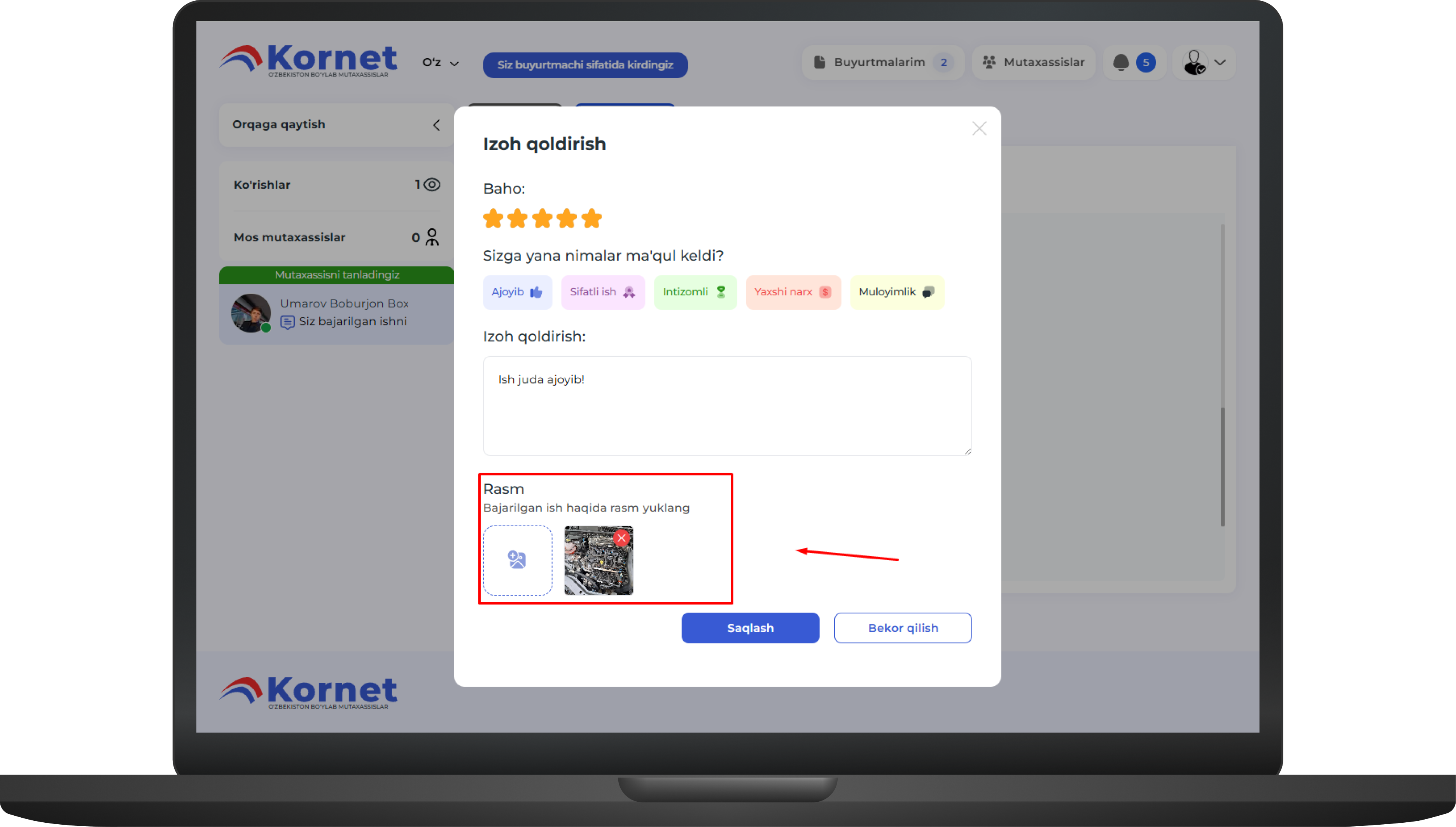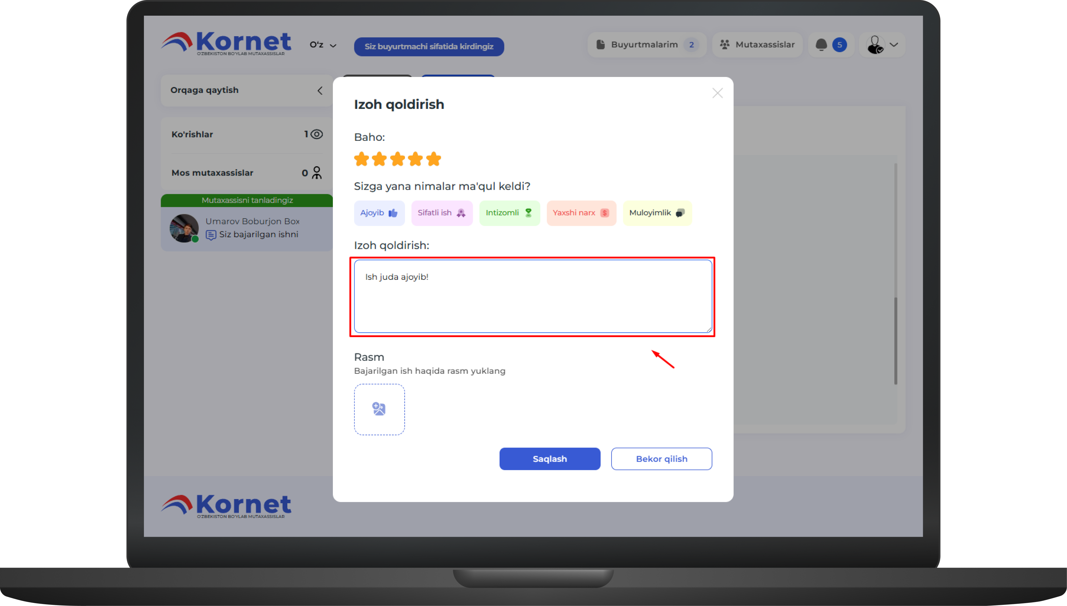 Izoh qoldirganingizdan so‘ng, «Saqlash» tugmasini bosishingiz mumkin. Ustaning profilida qayd etilishi Sizning sharhingiz zudlik bilan (yoki qisqa tekshiruvdan so‘ng) mutaxassis anketasida paydo bo‘ladi. Reyting: Siz qo‘ygan yulduzchalar qayta hisoblanadi va ustaning o‘rtacha balli yangilanadi. Ishonch: Kelajakdagi buyurtmachilar sizning izohingizni ko‘rishadi va bu insonni ishga yollashga arziydimi yoki yo‘qmi, tushunib olishadi. Topshiriq tarixining yakunlanishi Sharh saqlanishi bilan: Topshiriq batamom «Arxiv» yoki «Yakunlanganlar» bo‘limiga o‘tkaziladi. Siz endi ushbu topshiriq bo‘yicha bildirishnomalar yoki takliflar olmaysiz. Bu sizning shaxsiy kabinetingizda tartib o‘rnatishga yordam beradi. Javob reaksiyasi Ko‘pgina platformalarda siz sharhni saqlaganingizdan so‘ng, mutaxassis ham siz haqingizda buyurtmachi sifatida sharh qoldirishi mumkin (vazifa qanchalik aniq qo‘yilganligi, to‘lov vaqtida qilinganligi haqida). Bu saytda sizning ham ishonch reytingingizni shakllantiradi. «Saqlash» tugmasini bosishdan oldin nazorat ro‘yxati (Chek-list): Obyektivlik: Bahoingiz haqiqatga mos kelishiga ishonch hosil qiling. Agar usta harakat qilgan bo‘lsa-yu, lekin kichik kamchiliklar bo‘lsa, bu haqda ochiq yozish yaxshiroq, ammo bahoni keskin tushirib yubormang. Tafsilotlar: Agar tizim imkon bersa, sharhga sifatli bajarilgan ishning fotosuratini ilova qiling — bu usta uchun eng yaxshi minnatdorchilik bo‘ladi. Savodxonlik: Ortiqcha hissiyotlarsiz yozilgan qisqa va tushunarli matn boshqa foydalanuvchilar uchun ishonchliroq ko‘rinadi.image.png1.72 MB