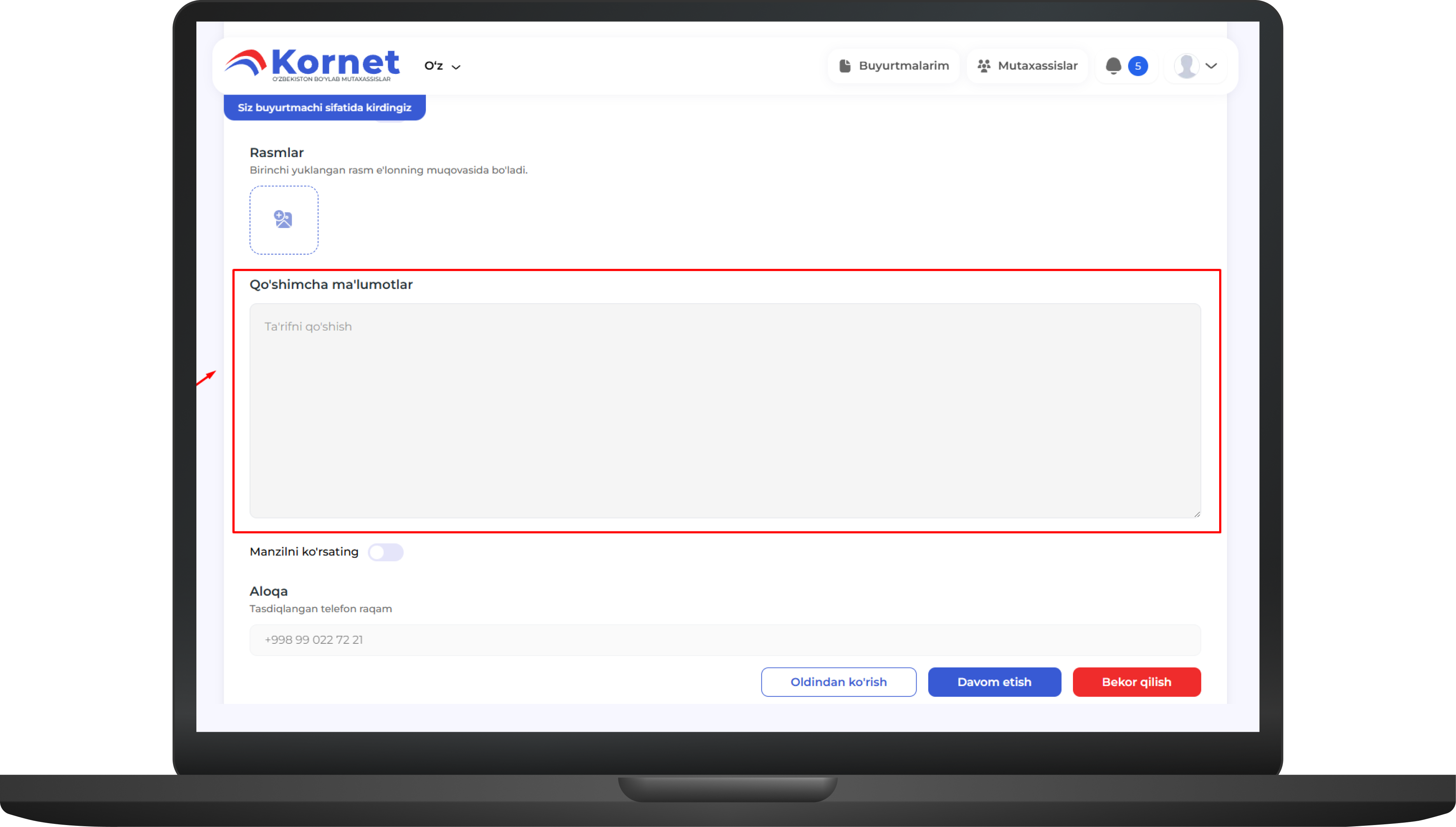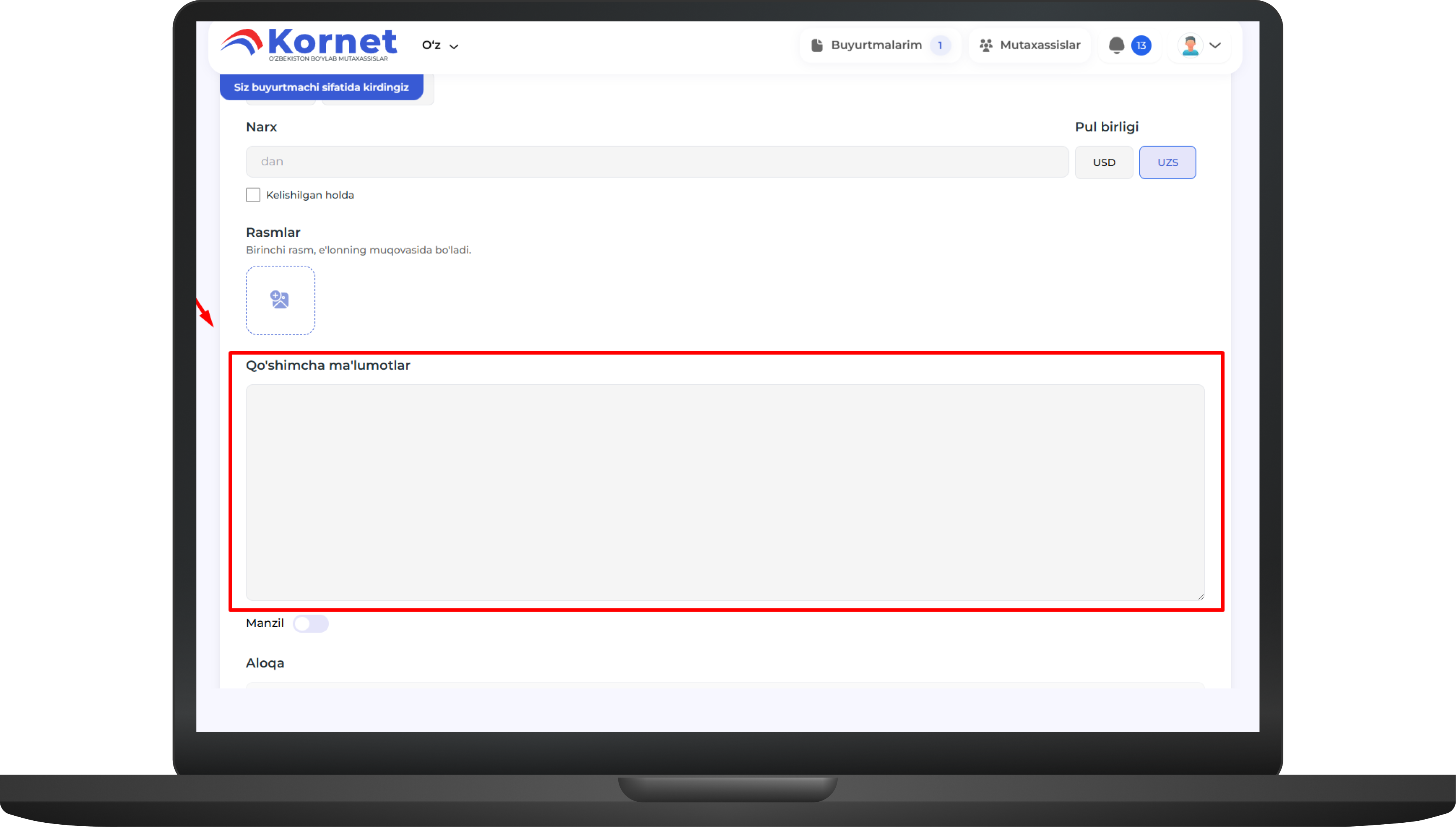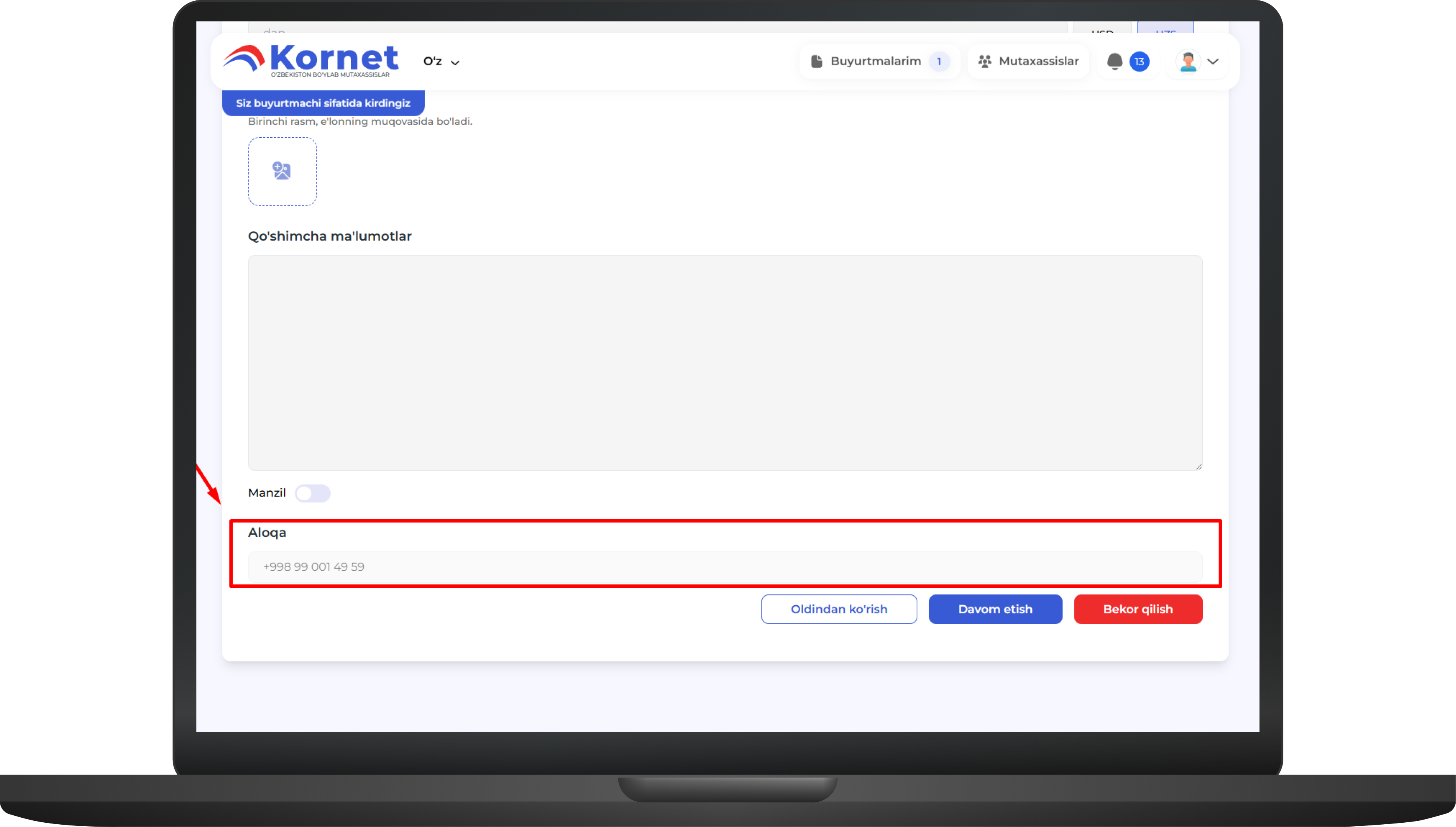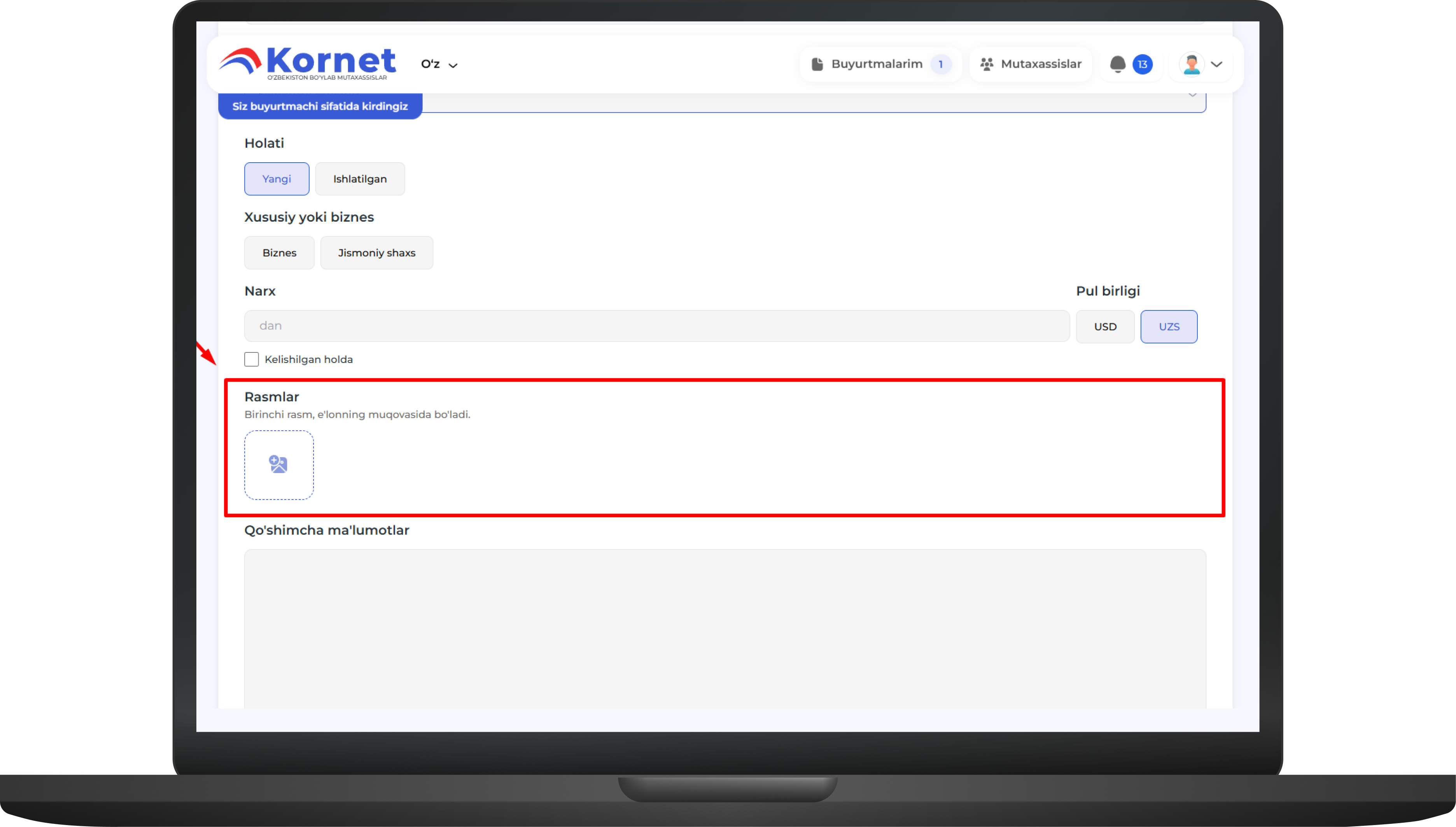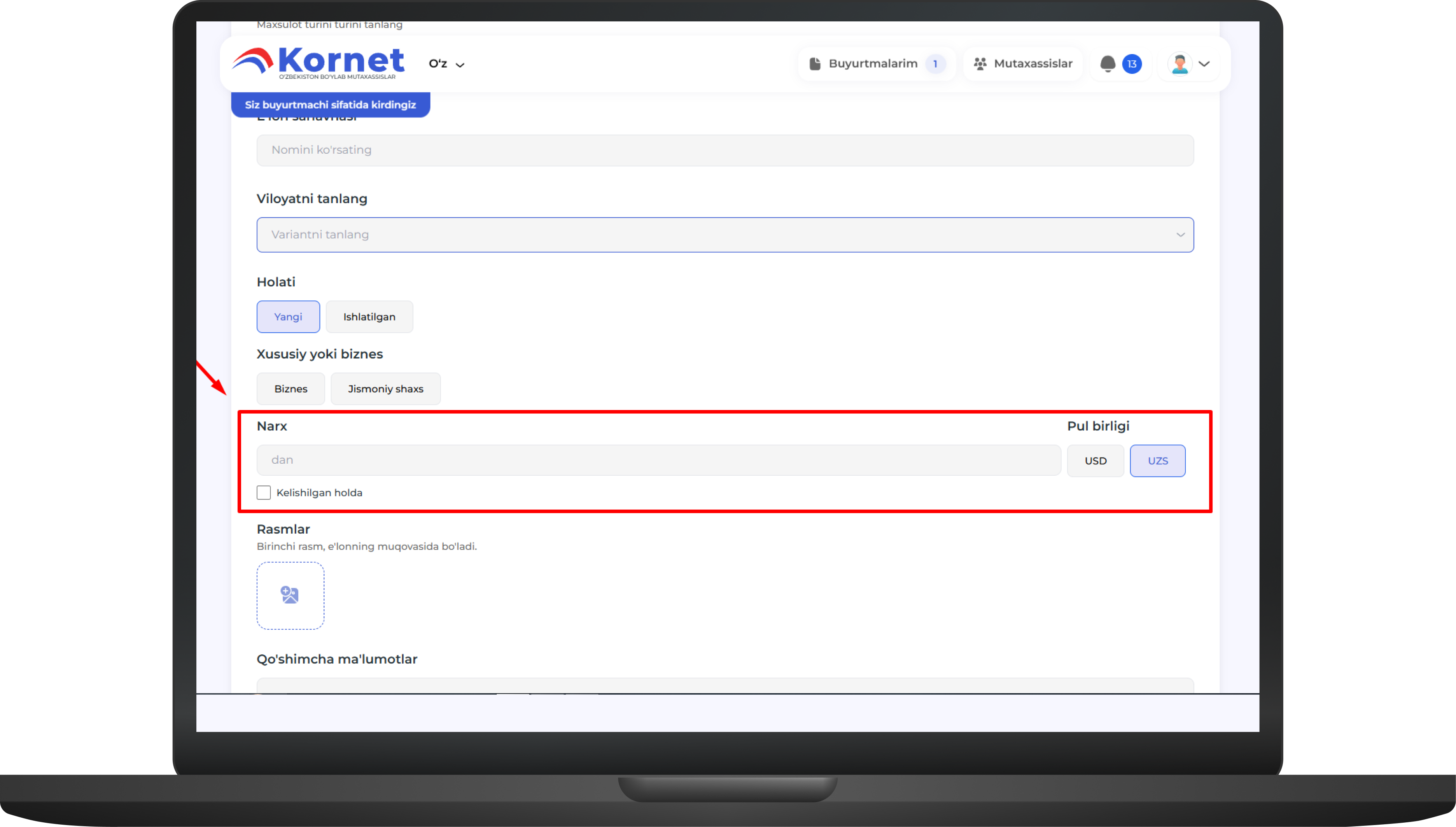 «2025-yilda Kornet.uz saytida samarali e’lon yaratish uchun maydon formatini hisobga olish muhim: bu nafaqat tovarlar (avto, ko‘chmas mulk, elektronika) sotuvi haqidagi e’lonlar taxtasi, balki xizmatlar servisidir. E’lon yaratish uchun siz "E’lonlar" bo‘limiga o‘tishingiz kerak».image.png2.21 MB«Mening buyurtmalarim» bo‘limiga o‘tish — bu shunchaki rasmiyatchilik emas. Bu yerda siz quyidagi amallarni bajarasiz: Kelishuvni tasdiqlash: Siz tanlangan ijrochini o‘z vazifangizga rasman biriktirasiz. Holatni (statusni) nazorat qilish: Ish qaysi bosqichda ekanligini ko‘rasiz (masalan: «Kutilmoqda», «Bajarilmoqda» yoki «Yakunlandi»). Xavfsizlik: Buyurtmani Kornet.uz tizimi ichida qayd etish har ikki tomonning manfaatlarini himoya qiladi.image.png2.23 MB«E’lon berish» tugmasini (yoki shunga o‘xshash «+» belgisini) bosishingiz bilan, qarshingizda e’lon yaratish bo‘limi ochiladi. Bu maxsus shakl bo‘lib, undagi ma’lumotlar sayt algoritmlari sizning taklifingizni kerakli odamlarga ko‘rsatishi uchun maydonlar bo‘yicha tizimlashtirilgan.image.png1.7 MBKo'pgina foydalanuvchilar "Yaratish" tugmasini bosgandan so'ng jarayon tugadi deb o'ylashadi, biroq Kornet.uz saytida undan keyin "Qo'shimcha ma'lumotlar" bo'limi ochiladi. Ushbu oyna e'loningizni professional darajaga keltirish va qidiruv filtrlari uchun "ko'rinarli" qilish imkonini beradi.image.png1.68 MBYangi e’lon yaratishda, birinchi navbatda, «Toifa va Ost-toifa» bo‘limiga kirishingiz mumkin. Odatda bu ochiladigan menyu yoki piktogrammalar (ikonkalar) to‘plami bo‘lib, u «Yaratish» tugmasi bosilishi bilanoq paydo bo‘ladi.image.png1.67 MBNashrni yaratishda tegishli maydonda siz «E’lon sarlavhasi»ni tanlashingiz va yozishingiz kerak. Bu qisqa ibora bo‘lib, 2 soniya ichida taklifingizning mazmunini tushuntirib berishi lozim.image.png1.6 MBПри заполнении формы публикации вы должны выбрать «Регион», в котором вы проживаете или где будет оказываться услуга. Точное указание геолокации — это залог того, что ваше объявление увидят люди именно из вашего города, что критически важно для быстрых сделок и личных встреч image.png1.69 MB«Holati» maydoni xaridorga gap do‘kondagi mahsulot haqida ketyaptimi yoki allaqachon foydalanilgan buyum haqida ekanligini bir zumda tushunishga yordam beradi. To‘g‘ri tanlov: Chatdagi keraksiz savollar sonini kamaytiradi. Shaxsiy uchrashuv vaqtida ziddiyatli vaziyatlarning oldini oladi. E’loningizni «Yangi kelganlar» toifasiga tushishiga imkon beradi.image.png1.68 MBE’lon yaratish jarayonida sotuvchi yoki ijrochi sifatidagi maqomingizni belgilash asosiy bosqichlardan biri hisoblanadi. Tegishli maydonda siz «Jismoniy shaxs yoki Biznes» toifasini tanlashingiz kerak. E’loningiz qanday ko‘rinishi va qaysi ilgari surish asboblari (instrumentlari) sizga taqdim etilishi aynan shu tanlovga bog‘liq.image.png1.67 MBE’lon yaratish shaklini to‘ldirishda siz mahsulotingiz yoki xizmatingizning «Narxi»ni ko‘rsatishingiz kerak. Narxni to‘g‘ri belgilash befoyda qo‘ng‘iroqlarning oldini olishga va faqat xarid qilishga tayyor bo‘lgan mijozlarni jalb qilishga yordam beradi.image.png1.68 MBHar qanday e’lonni yaratishda siz «Rasm» yuklashingiz mumkin va buni amalga oshirishingiz shart. Haqiqiy va aniq tasvirlarga ega bo‘lgan e’lonlar matnli nashrlarga qaraganda 5–10 baravar ko‘proq ko‘rishlar va otkliklar (javoblar) oladi.image.png1.62 MBTayanch ma’lumotlarni (sarlavha, toifa va narx) kiritib, «Yaratish» tugmasini bosganingizdan so‘ng, tizim e’lonni darhol nashr etmaydi. Navbatdagi bosqichda siz «Qo‘shimcha ma’lumotlar»ni to‘ldirishingiz kerak. Ushbu aniqlashtiruvchi tafsilotlar sayt algoritmlariga sizning taklifingizni aynan uni qidirayotgan foydalanuvchilarga tavsiya qilishga yordam beradi.image.png1.58 MBUmumiy hududni tanlaganingizdan so‘ng, e’lonni rasmiylashtirish jarayonida yoki qo‘shimcha ma’lumotlar bo‘limida siz aniq «Manzil»ni ko‘rsatishingiz mumkin. Bu sizning taklifingiz xaritada ko‘rinishiga imkon beradi va mijozlarga sizgacha yetib borish qanchalik qulayligini tushunishga yordam beradi.image.png1.59 MBE’lonni rasmiylashtirishda shaklning pastki qismida yoki qo‘shimcha sozlamalar bo‘limida siz aloqa ma’lumotlarini ko‘rsatishingiz mumkin va buni amalga oshirishingiz shart. Bu potensial mijozlarga siz bilan o‘zlari uchun qulay usulda tezda bog‘lanish imkonini beradi.E’lonni rasmiylashtirishda shaklning pastki qismida yoki qo‘shimcha sozlamalar bo‘limida siz aloqa ma’lumotlarini ko‘rsatishingiz mumkin va buni amalga oshirishingiz shart. Bu potensial mijozlarga siz bilan o‘zlari uchun qulay usulda tezda bog‘lanish imkonini beradi.image.png1.59 MBBarcha maydonlarni — sarlavha, tavsif, fotosuratlar, narx, hudud va aloqa ma’lumotlarini to‘ldirganingizdan so‘ng, qarshingizda yakuniy harakatlar menyusi ochiladi. Bu yerda siz e’loningizni aynan qanday nashr etishni yoki ilgari surishni (reklama qilishni) tanlashingiz kerak.image.png1.57 MBE’loningiz minglab foydalanuvchilarga ko‘rinishidan oldin, tizim yakuniy nazorat bosqichini taklif etadi. «Ko‘rib chiqish» (Предпросмотр) bo‘limida siz e’loningizni xuddi potensial mijoz yoki ijrochi ko‘radigan ko‘rinishda tekshirib olishingiz mumkin.image.png1.57 MBSarlavhadan tortib qo‘shimcha xarakteristikalargacha (tavsiflargacha) bo‘lgan barcha maydonlarni to‘ldirib, ularni ko‘rib chiqish (предпросмотр) bo‘limida tekshirganingizdan so‘ng, yakuniy texnik bosqich boshlanadi. «Davom etish» yoki «Nashr etish» tugmasini bosganingizdan keyin, e’loningiz avtomatik ravishda moderatsiyaga yuboriladi.image.png1.57 MB«Bekor qilish» tugmasi t