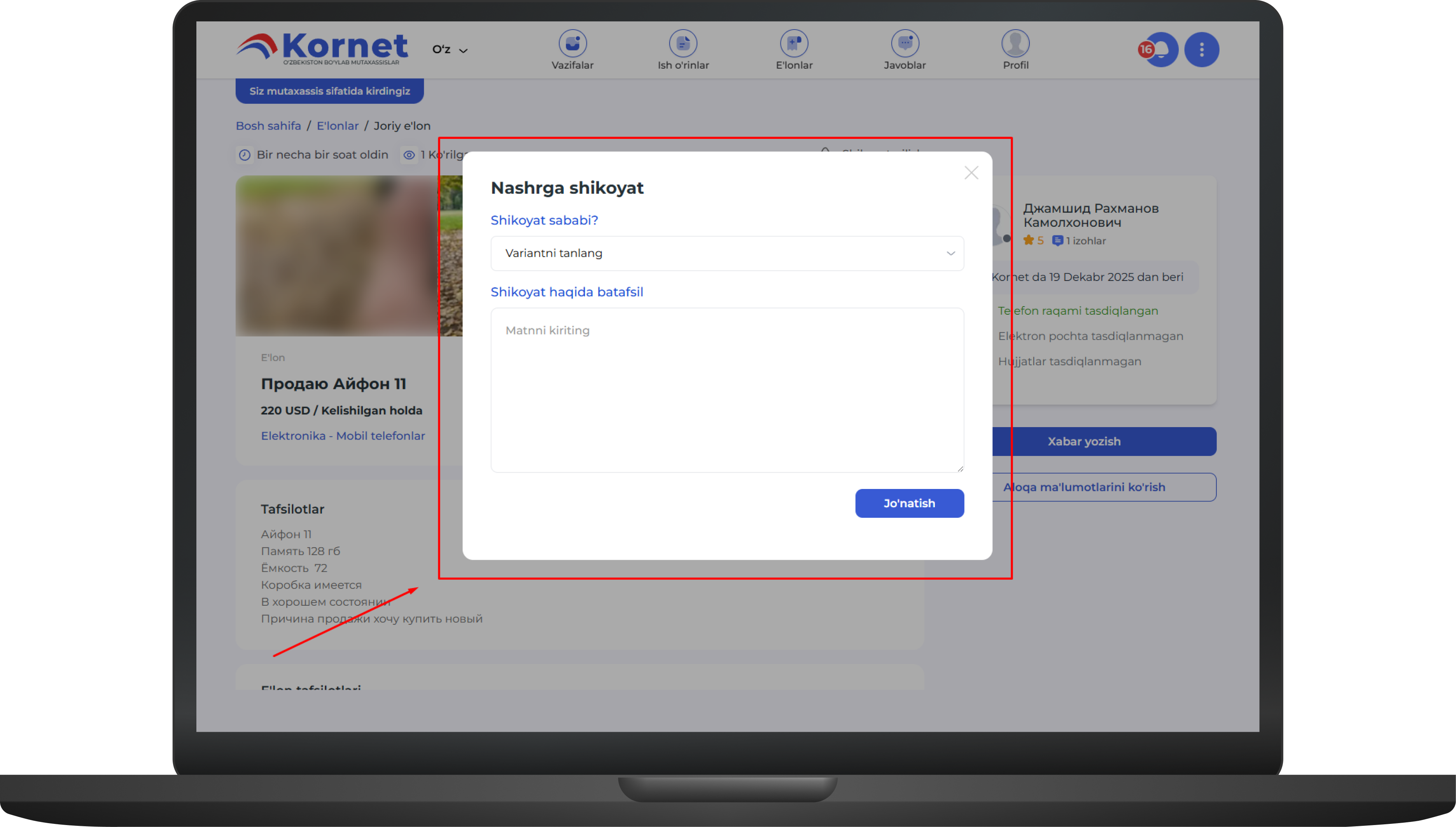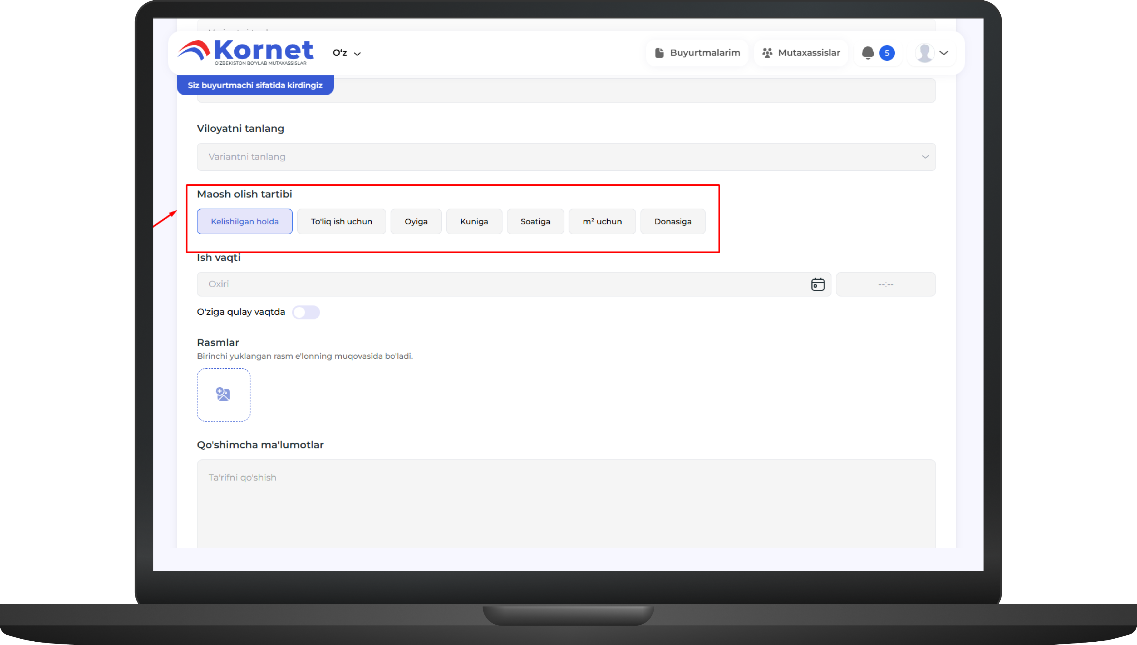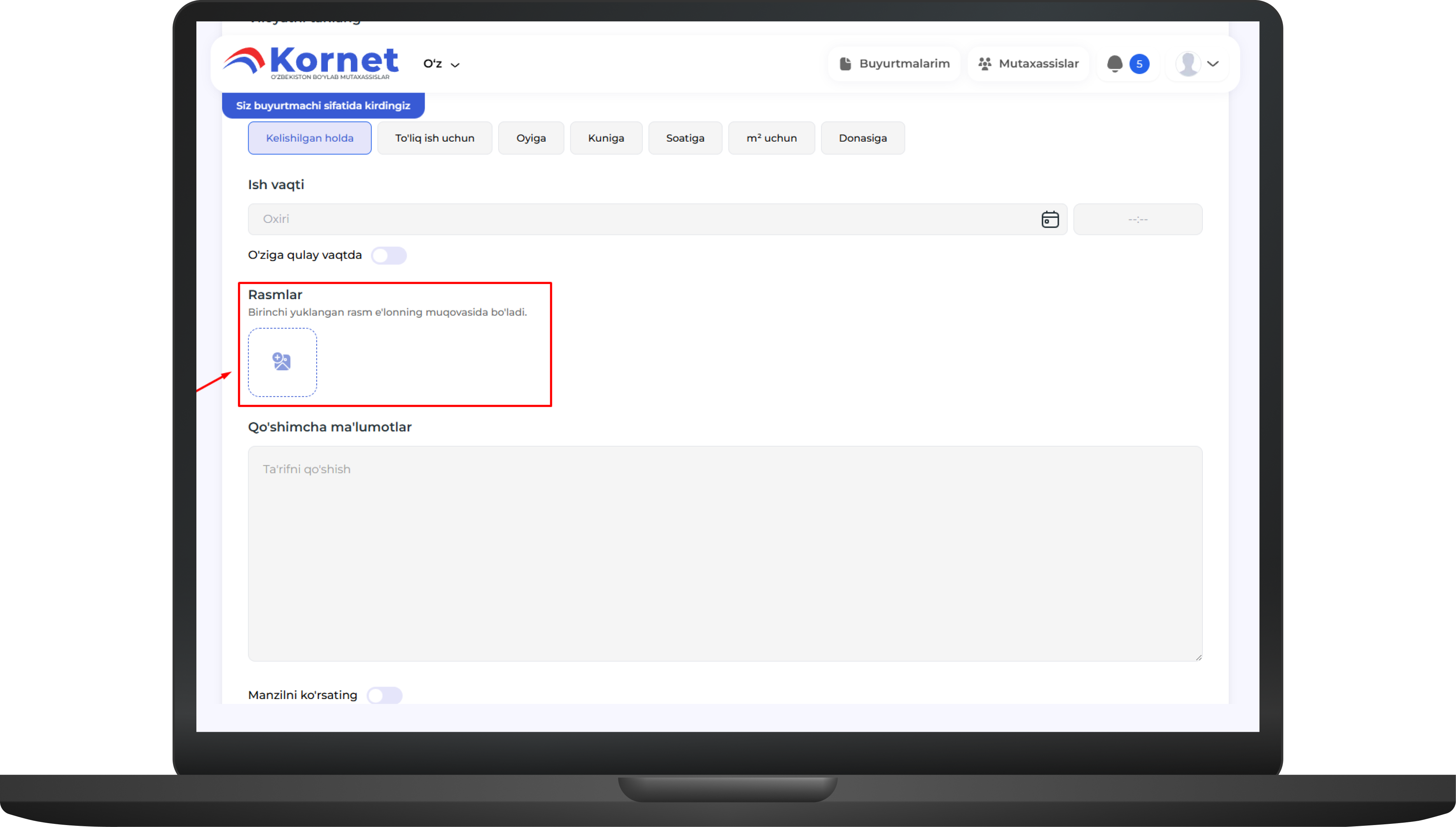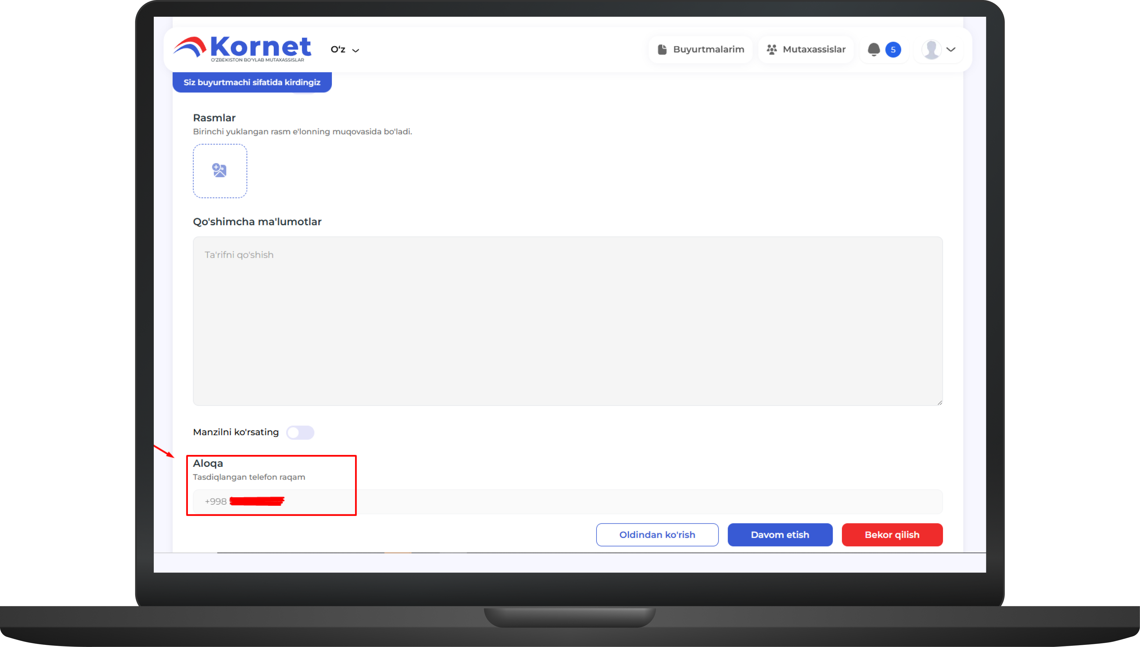 «2025-yilda Kornet.uz saytida samarali e’lon yaratish uchun maydon formatini hisobga olish muhim: bu nafaqat tovarlar (avto, ko‘chmas mulk, elektronika) sotuvi haqidagi e’lonlar taxtasi, balki xizmatlar servisidir. E’lon yaratish uchun siz "E’lonlar" bo‘limiga o‘tishingiz kerak».image.png2.21 MB«Mening buyurtmalarim» bo‘limiga o‘tish — bu shunchaki rasmiyatchilik emas. Bu yerda siz quyidagi amallarni bajarasiz: Kelishuvni tasdiqlash: Siz tanlangan ijrochini o‘z vazifangizga rasman biriktirasiz. Holatni (statusni) nazorat qilish: Ish qaysi bosqichda ekanligini ko‘rasiz (masalan: «Kutilmoqda», «Bajarilmoqda» yoki «Yakunlandi»). Xavfsizlik: Buyurtmani Kornet.uz tizimi ichida qayd etish har ikki tomonning manfaatlarini himoya qiladi.image.png2.23 MB«E’lon berish» tugmasini (yoki shunga o‘xshash «+» belgisini) bosishingiz bilan, qarshingizda e’lon yaratish bo‘limi ochiladi. Bu maxsus shakl bo‘lib, undagi ma’lumotlar sayt algoritmlari sizning taklifingizni kerakli odamlarga ko‘rsatishi uchun maydonlar bo‘yicha tizimlashtirilgan.image.png1.7 MBKo'pgina foydalanuvchilar "Yaratish" tugmasini bosgandan so'ng jarayon tugadi deb o'ylashadi, biroq Kornet.uz saytida undan keyin "Qo'shimcha ma'lumotlar" bo'limi ochiladi. Ushbu oyna e'loningizni professional darajaga keltirish va qidiruv filtrlari uchun "ko'rinarli" qilish imkonini beradi.image.png1.68 MBYangi e’lon yaratishda, birinchi navbatda, «Toifa va Ost-toifa» bo‘limiga kirishingiz mumkin. Odatda bu ochiladigan menyu yoki piktogrammalar (ikonkalar) to‘plami bo‘lib, u «Yaratish» tugmasi bosilishi bilanoq paydo bo‘ladi.image.png1.67 MBNashrni yaratishda tegishli maydonda siz «E’lon sarlavhasi»ni tanlashingiz va yozishingiz kerak. Bu qisqa ibora bo‘lib, 2 soniya ichida taklifingizning mazmunini tushuntirib berishi lozim.image.png1.6 MBПри заполнении формы публикации вы должны выбрать «Регион», в котором вы проживаете или где будет оказываться услуга. Точное указание геолокации — это залог того, что ваше объявление увидят люди именно из вашего города, что критически важно для быстрых сделок и личных встреч image.png1.69 MB«Holati» maydoni xaridorga gap do‘kondagi mahsulot haqida ketyaptimi yoki allaqachon foydalanilgan buyum haqida ekanligini bir zumda tushunishga yordam beradi. To‘g‘ri tanlov: Chatdagi keraksiz savollar sonini kamaytiradi. Shaxsiy uchrashuv vaqtida ziddiyatli vaziyatlarning oldini oladi. E’loningizni «Yangi kelganlar» toifasiga tushishiga imkon beradi.image.png1.68 MBE’lon yaratish jarayonida sotuvchi yoki ijrochi sifatidagi maqomingizni belgilash asosiy bosqichlardan biri hisoblanadi. Tegishli maydonda siz «Jismoniy shaxs yoki Biznes» toifasini tanlashingiz kerak. E’loningiz qanday ko‘rinishi va qaysi ilgari surish asboblari (instrumentlari) sizga taqdim etilishi aynan shu tanlovga bog‘liq.image.png1.67 MBE’lon yaratish shaklini to‘ldirishda siz mahsulotingiz yoki xizmatingizning «Narxi»ni ko‘rsatishingiz kerak. Narxni to‘g‘ri belgilash befoyda qo‘ng‘iroqlarning oldini olishga va faqat xarid qilishga tayyor bo‘lgan mijozlarni jalb qilishga yordam beradi.image.png1.68 MBHar qanday e’lonni yaratishda siz «Rasm» yuklashingiz mumkin va buni amalga oshirishingiz shart. Haqiqiy va aniq tasvirlarga ega bo‘lgan e’lonlar matnli nashrlarga qaraganda 5–10 baravar ko‘proq ko‘rishlar va otkliklar (javoblar) oladi.image.png1.62 MBTayanch ma’lumotlarni (sarlavha, toifa va narx) kiritib, «Yaratish» tugmasini bosganingizdan so‘ng, tizim e’lonni darhol nashr etmaydi. Navbatdagi bosqichda siz «Qo‘shimcha ma’lumotlar»ni to‘ldirishingiz kerak. Ushbu aniqlashtiruvchi tafsilotlar sayt algoritmlariga sizning taklifingizni aynan uni qidirayotgan foydalanuvchilarga tavsiya qilishga yordam beradi.image.png1.58 MBUmumiy hududni tanlaganingizdan so‘ng, e’lonni rasmiylashtirish jarayonida yoki qo‘shimcha ma’lumotlar bo‘limida siz aniq «Manzil»ni ko‘rsatishingiz mumkin. Bu sizning taklifingiz xaritada ko‘rinishiga imkon beradi va mijozlarga sizgacha yetib borish qanchalik qulayligini tushunishga yordam beradi.image.png1.59 MBE’lonni rasmiylashtirishda shaklning pastki qismida yoki qo‘shimcha sozlamalar bo‘limida siz aloqa ma’lumotlarini ko‘rsatishingiz mumkin va buni amalga oshirishingiz shart. Bu potensial mijozlarga siz bilan o‘zlari uchun qulay usulda tezda bog‘lanish imkonini beradi.E’lonni rasmiylashtirishda shaklning pastki qismida yoki qo‘shimcha sozlamalar bo‘limida siz aloqa ma’lumotlarini ko‘rsatishingiz mumkin va buni amalga oshirishingiz shart. Bu potensial mijozlarga siz bilan o‘zlari uchun qulay usulda tezda bog‘lanish imkonini beradi.image.png1.59 MBBarcha maydonlarni — sarlavha, tavsif, fotosuratlar, narx, hudud va aloqa ma’lumotlarini to‘ldirganingizdan so‘ng, qarshingizda yakuniy harakatlar menyusi ochiladi. Bu yerda siz e’loningizni aynan qanday nashr etishni yoki ilgari surishni (reklama qilishni) tanlashingiz kerak.image.png1.57 MBE’loningiz minglab foydalanuvchilarga ko‘rinishidan oldin, tizim yakuniy nazorat bosqichini taklif etadi. «Ko‘rib chiqish» (Предпросмотр) bo‘limida siz e’loningizni xuddi potensial mijoz yoki ijrochi ko‘radigan ko‘rinishda tekshirib olishingiz mumkin.image.png1.57 MBSarlavhadan tortib qo‘shimcha xarakteristikalargacha (tavsiflargacha) bo‘lgan barcha maydonlarni to‘ldirib, ularni ko‘rib chiqish (предпросмотр) bo‘limida tekshirganingizdan so‘ng, yakuniy texnik bosqich boshlanadi. «Davom etish» yoki «Nashr etish» tugmasini bosganingizdan keyin, e’loningiz avtomatik ravishda moderatsiyaga yuboriladi.image.png1.57 MB«Bekor qilish» tugmasi t