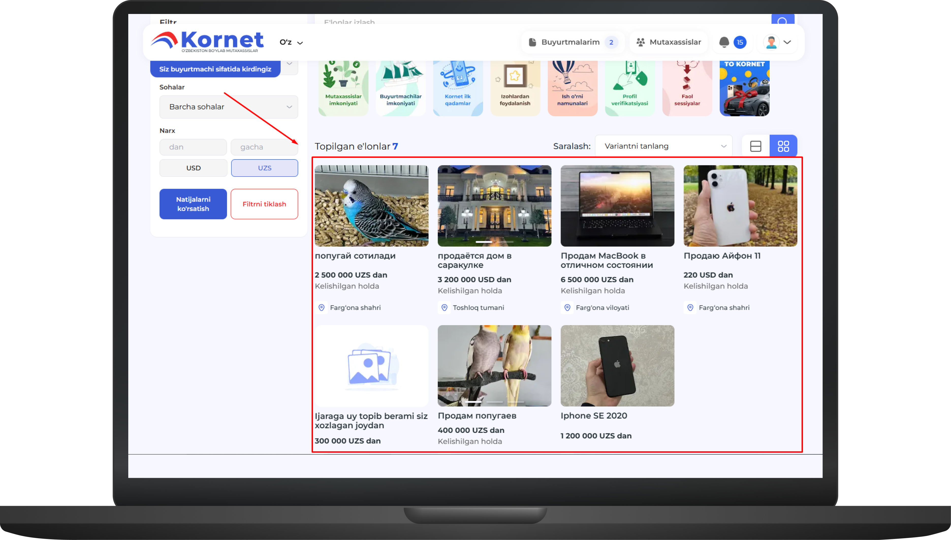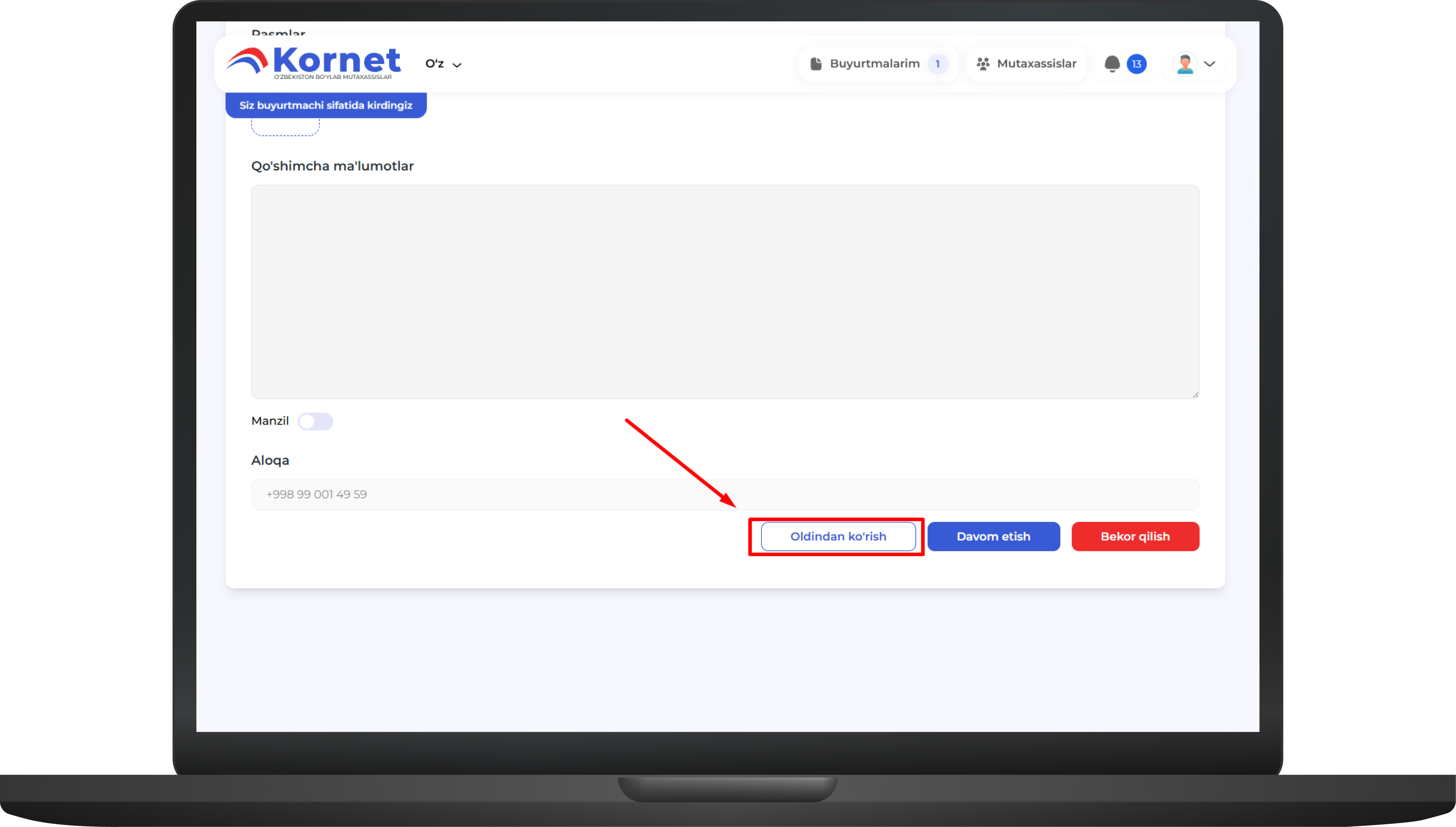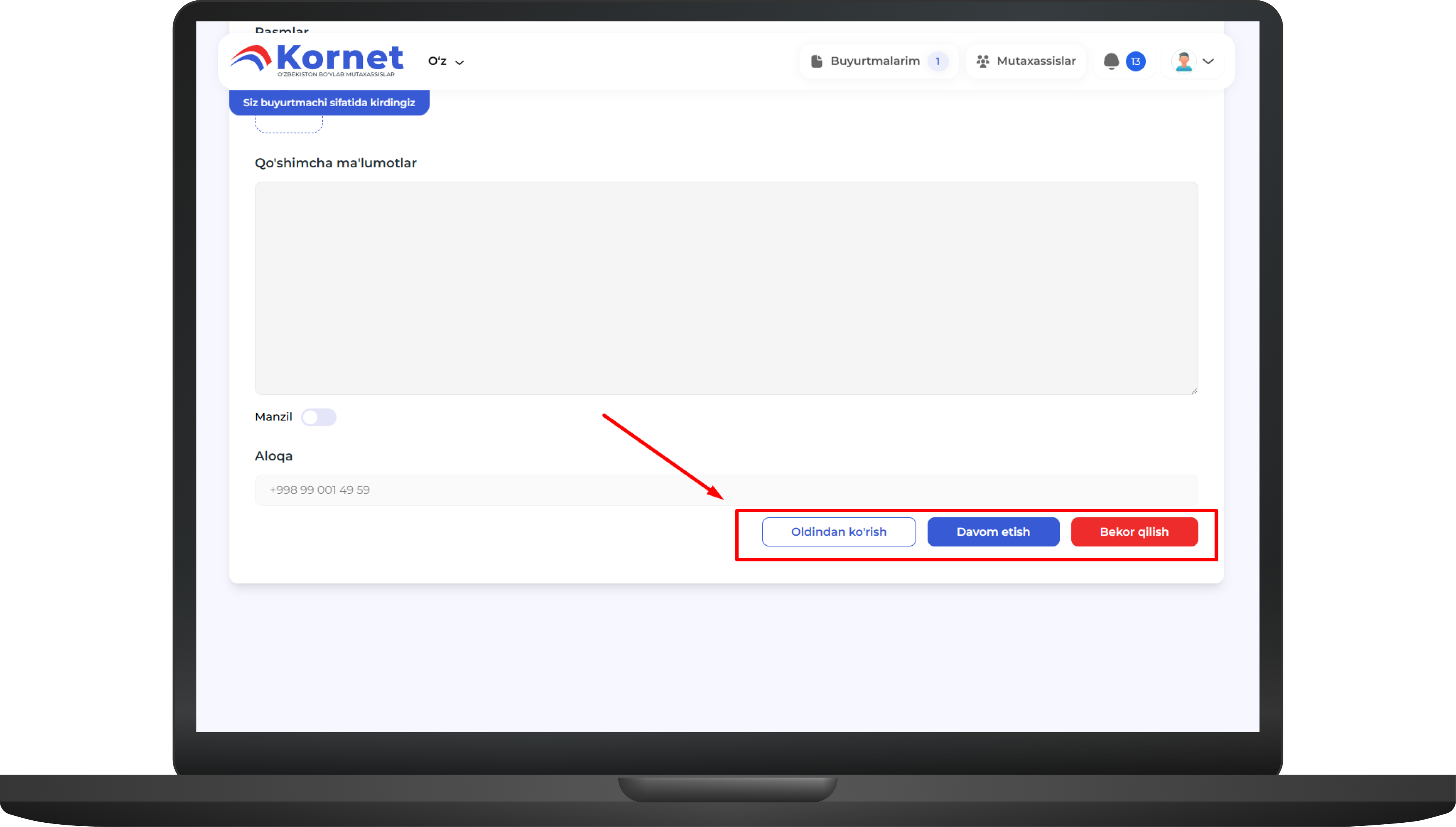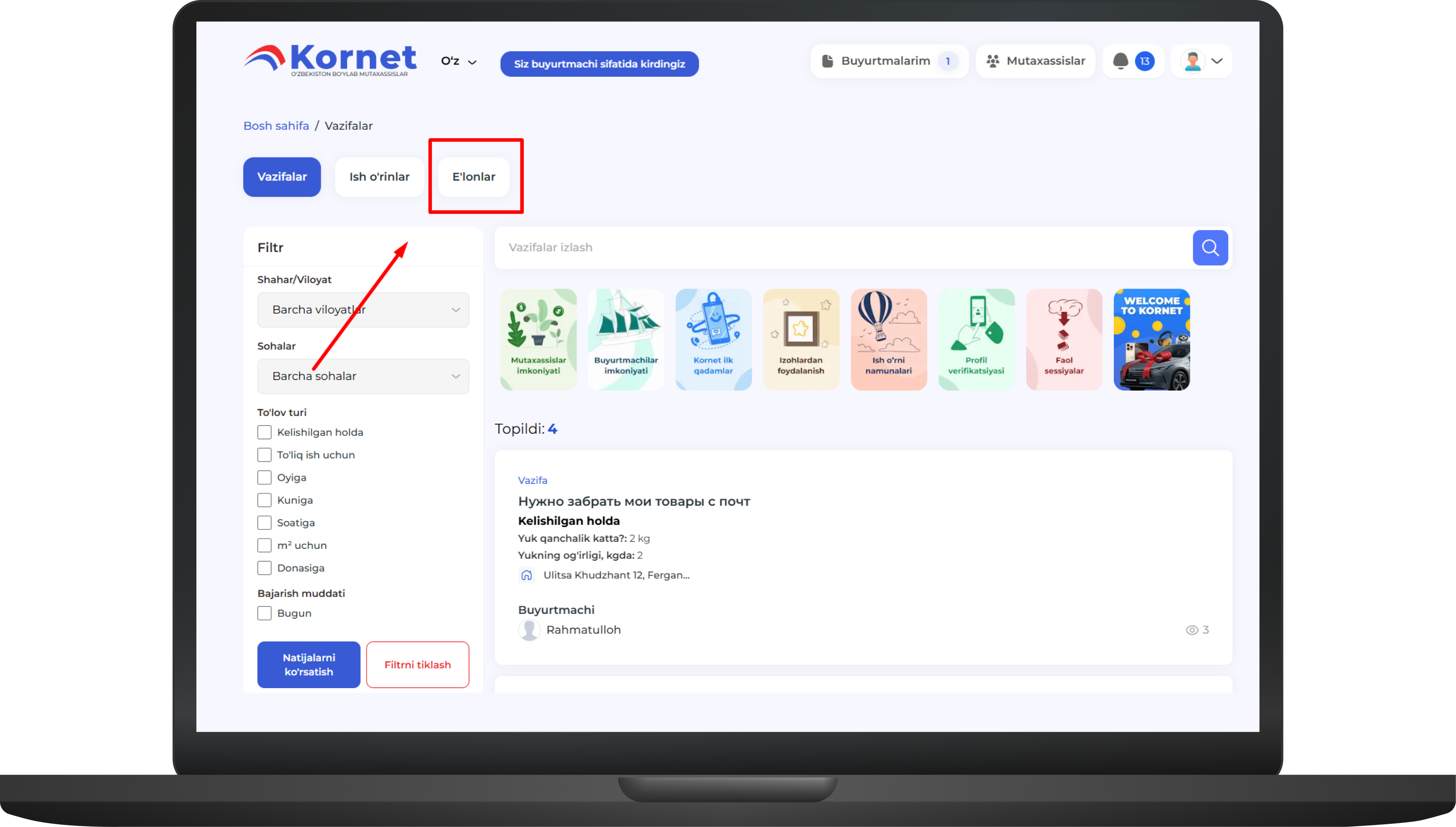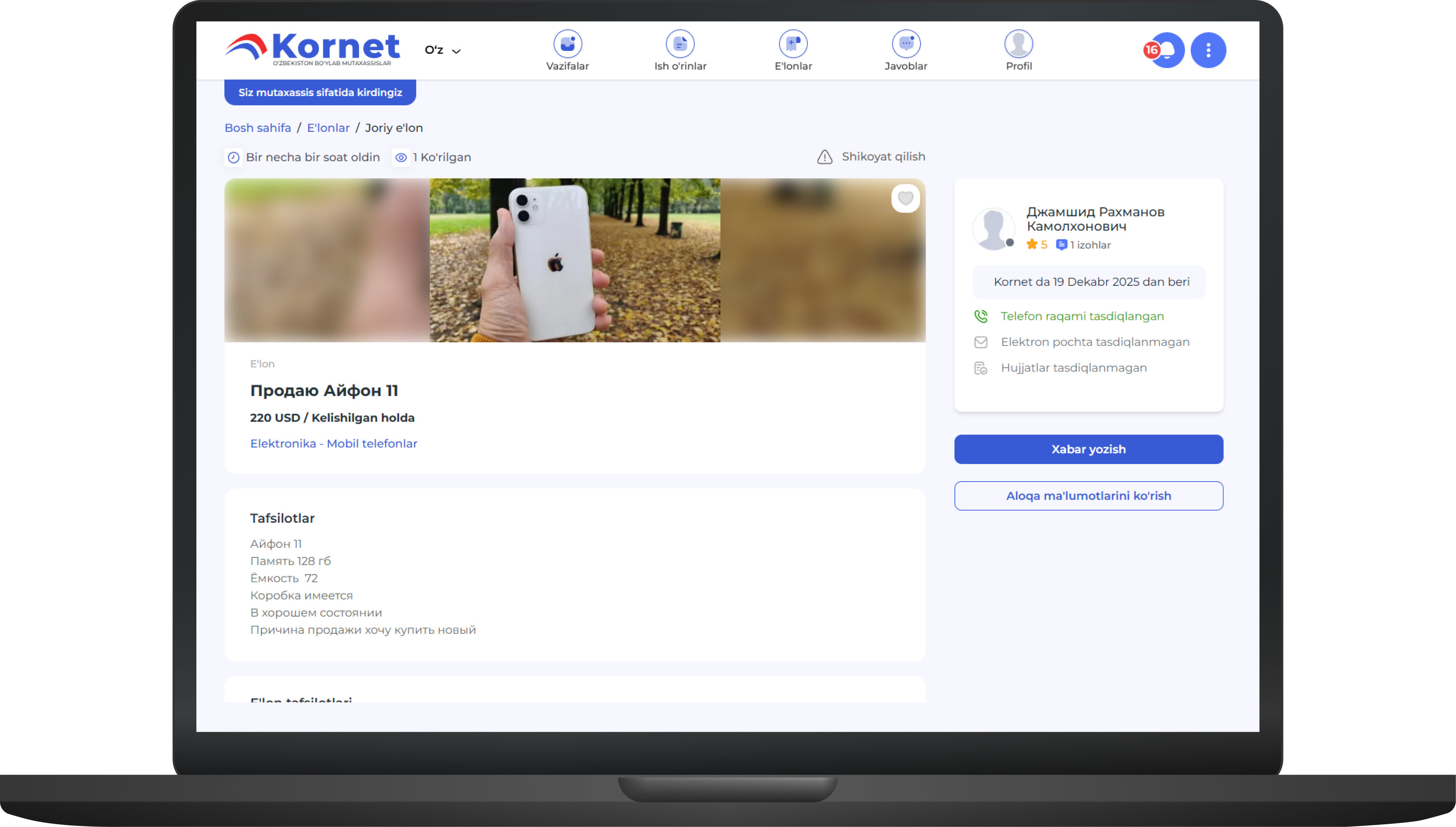 «2025-yilda Kornet.uz saytida samarali e’lon yaratish uchun maydon formatini hisobga olish muhim: bu nafaqat tovarlar (avto, ko‘chmas mulk, elektronika) sotuvi haqidagi e’lonlar taxtasi, balki xizmatlar servisidir. E’lon yaratish uchun siz "E’lonlar" bo‘limiga o‘tishingiz kerak».image.png2.21 MB«Mening buyurtmalarim» bo‘limiga o‘tish — bu shunchaki rasmiyatchilik emas. Bu yerda siz quyidagi amallarni bajarasiz: Kelishuvni tasdiqlash: Siz tanlangan ijrochini o‘z vazifangizga rasman biriktirasiz. Holatni (statusni) nazorat qilish: Ish qaysi bosqichda ekanligini ko‘rasiz (masalan: «Kutilmoqda», «Bajarilmoqda» yoki «Yakunlandi»). Xavfsizlik: Buyurtmani Kornet.uz tizimi ichida qayd etish har ikki tomonning manfaatlarini himoya qiladi.image.png2.23 MB«E’lon berish» tugmasini (yoki shunga o‘xshash «+» belgisini) bosishingiz bilan, qarshingizda e’lon yaratish bo‘limi ochiladi. Bu maxsus shakl bo‘lib, undagi ma’lumotlar sayt algoritmlari sizning taklifingizni kerakli odamlarga ko‘rsatishi uchun maydonlar bo‘yicha tizimlashtirilgan.image.png1.7 MBKo'pgina foydalanuvchilar "Yaratish" tugmasini bosgandan so'ng jarayon tugadi deb o'ylashadi, biroq Kornet.uz saytida undan keyin "Qo'shimcha ma'lumotlar" bo'limi ochiladi. Ushbu oyna e'loningizni professional darajaga keltirish va qidiruv filtrlari uchun "ko'rinarli" qilish imkonini beradi.image.png1.68 MBYangi e’lon yaratishda, birinchi navbatda, «Toifa va Ost-toifa» bo‘limiga kirishingiz mumkin. Odatda bu ochiladigan menyu yoki piktogrammalar (ikonkalar) to‘plami bo‘lib, u «Yaratish» tugmasi bosilishi bilanoq paydo bo‘ladi.image.png1.67 MBNashrni yaratishda tegishli maydonda siz «E’lon sarlavhasi»ni tanlashingiz va yozishingiz kerak. Bu qisqa ibora bo‘lib, 2 soniya ichida taklifingizning mazmunini tushuntirib berishi lozim.image.png1.6 MBПри заполнении формы публикации вы должны выбрать «Регион», в котором вы проживаете или где будет оказываться услуга. Точное указание геолокации — это залог того, что ваше объявление увидят люди именно из вашего города, что критически важно для быстрых сделок и личных встреч image.png1.69 MB«Holati» maydoni xaridorga gap do‘kondagi mahsulot haqida ketyaptimi yoki allaqachon foydalanilgan buyum haqida ekanligini bir zumda tushunishga yordam beradi. To‘g‘ri tanlov: Chatdagi keraksiz savollar sonini kamaytiradi. Shaxsiy uchrashuv vaqtida ziddiyatli vaziyatlarning oldini oladi. E’loningizni «Yangi kelganlar» toifasiga tushishiga imkon beradi.image.png1.68 MBE’lon yaratish jarayonida sotuvchi yoki ijrochi sifatidagi maqomingizni belgilash asosiy bosqichlardan biri hisoblanadi. Tegishli maydonda siz «Jismoniy shaxs yoki Biznes» toifasini tanlashingiz kerak. E’loningiz qanday ko‘rinishi va qaysi ilgari surish asboblari (instrumentlari) sizga taqdim etilishi aynan shu tanlovga bog‘liq.image.png1.67 MBE’lon yaratish shaklini to‘ldirishda siz mahsulotingiz yoki xizmatingizning «Narxi»ni ko‘rsatishingiz kerak. Narxni to‘g‘ri belgilash befoyda qo‘ng‘iroqlarning oldini olishga va faqat xarid qilishga tayyor bo‘lgan mijozlarni jalb qilishga yordam beradi.image.png1.68 MBHar qanday e’lonni yaratishda siz «Rasm» yuklashingiz mumkin va buni amalga oshirishingiz shart. Haqiqiy va aniq tasvirlarga ega bo‘lgan e’lonlar matnli nashrlarga qaraganda 5–10 baravar ko‘proq ko‘rishlar va otkliklar (javoblar) oladi.image.png1.62 MBTayanch ma’lumotlarni (sarlavha, toifa va narx) kiritib, «Yaratish» tugmasini bosganingizdan so‘ng, tizim e’lonni darhol nashr etmaydi. Navbatdagi bosqichda siz «Qo‘shimcha ma’lumotlar»ni to‘ldirishingiz kerak. Ushbu aniqlashtiruvchi tafsilotlar sayt algoritmlariga sizning taklifingizni aynan uni qidirayotgan foydalanuvchilarga tavsiya qilishga yordam beradi.image.png1.58 MBUmumiy hududni tanlaganingizdan so‘ng, e’lonni rasmiylashtirish jarayonida yoki qo‘shimcha ma’lumotlar bo‘limida siz aniq «Manzil»ni ko‘rsatishingiz mumkin. Bu sizning taklifingiz xaritada ko‘rinishiga imkon beradi va mijozlarga sizgacha yetib borish qanchalik qulayligini tushunishga yordam beradi.image.png1.59 MBE’lonni rasmiylashtirishda shaklning pastki qismida yoki qo‘shimcha sozlamalar bo‘limida siz aloqa ma’lumotlarini ko‘rsatishingiz mumkin va buni amalga oshirishingiz shart. Bu potensial mijozlarga siz bilan o‘zlari uchun qulay usulda tezda bog‘lanish imkonini beradi.E’lonni rasmiylashtirishda shaklning pastki qismida yoki qo‘shimcha sozlamalar bo‘limida siz aloqa ma’lumotlarini ko‘rsatishingiz mumkin va buni amalga oshirishingiz shart. Bu potensial mijozlarga siz bilan o‘zlari uchun qulay usulda tezda bog‘lanish imkonini beradi.image.png1.59 MBBarcha maydonlarni — sarlavha, tavsif, fotosuratlar, narx, hudud va aloqa ma’lumotlarini to‘ldirganingizdan so‘ng, qarshingizda yakuniy harakatlar menyusi ochiladi. Bu yerda siz e’loningizni aynan qanday nashr etishni yoki ilgari surishni (reklama qilishni) tanlashingiz kerak.image.png1.57 MBE’loningiz minglab foydalanuvchilarga ko‘rinishidan oldin, tizim yakuniy nazorat bosqichini taklif etadi. «Ko‘rib chiqish» (Предпросмотр) bo‘limida siz e’loningizni xuddi potensial mijoz yoki ijrochi ko‘radigan ko‘rinishda tekshirib olishingiz mumkin.image.png1.57 MBSarlavhadan tortib qo‘shimcha xarakteristikalargacha (tavsiflargacha) bo‘lgan barcha maydonlarni to‘ldirib, ularni ko‘rib chiqish (предпросмотр) bo‘limida tekshirganingizdan so‘ng, yakuniy texnik bosqich boshlanadi. «Davom etish» yoki «Nashr etish» tugmasini bosganingizdan keyin, e’loningiz avtomatik ravishda moderatsiyaga yuboriladi.image.png1.57 MB«Bekor qilish» tugmasi t