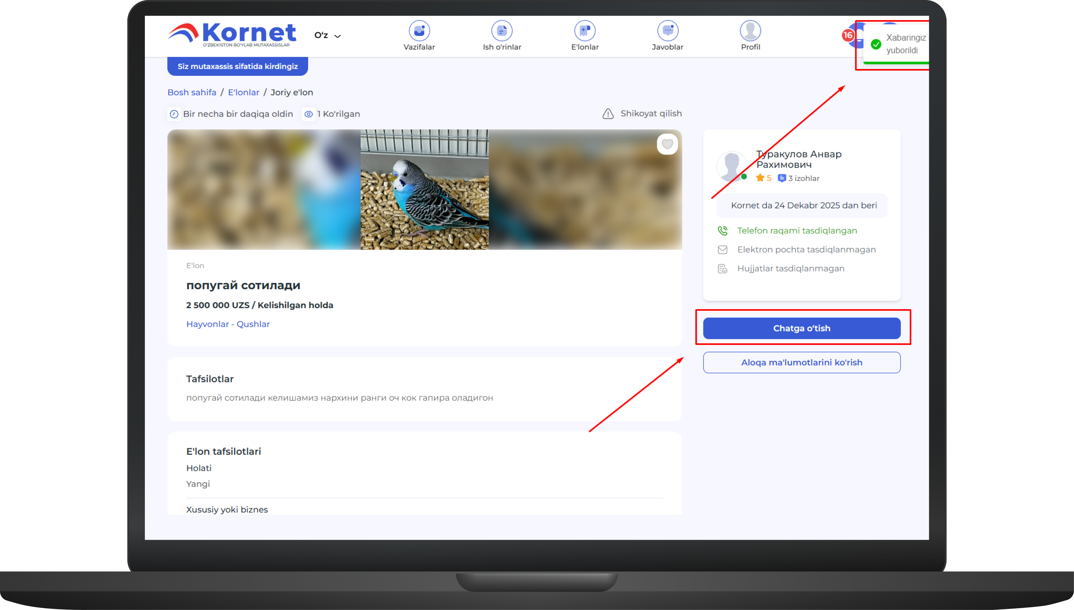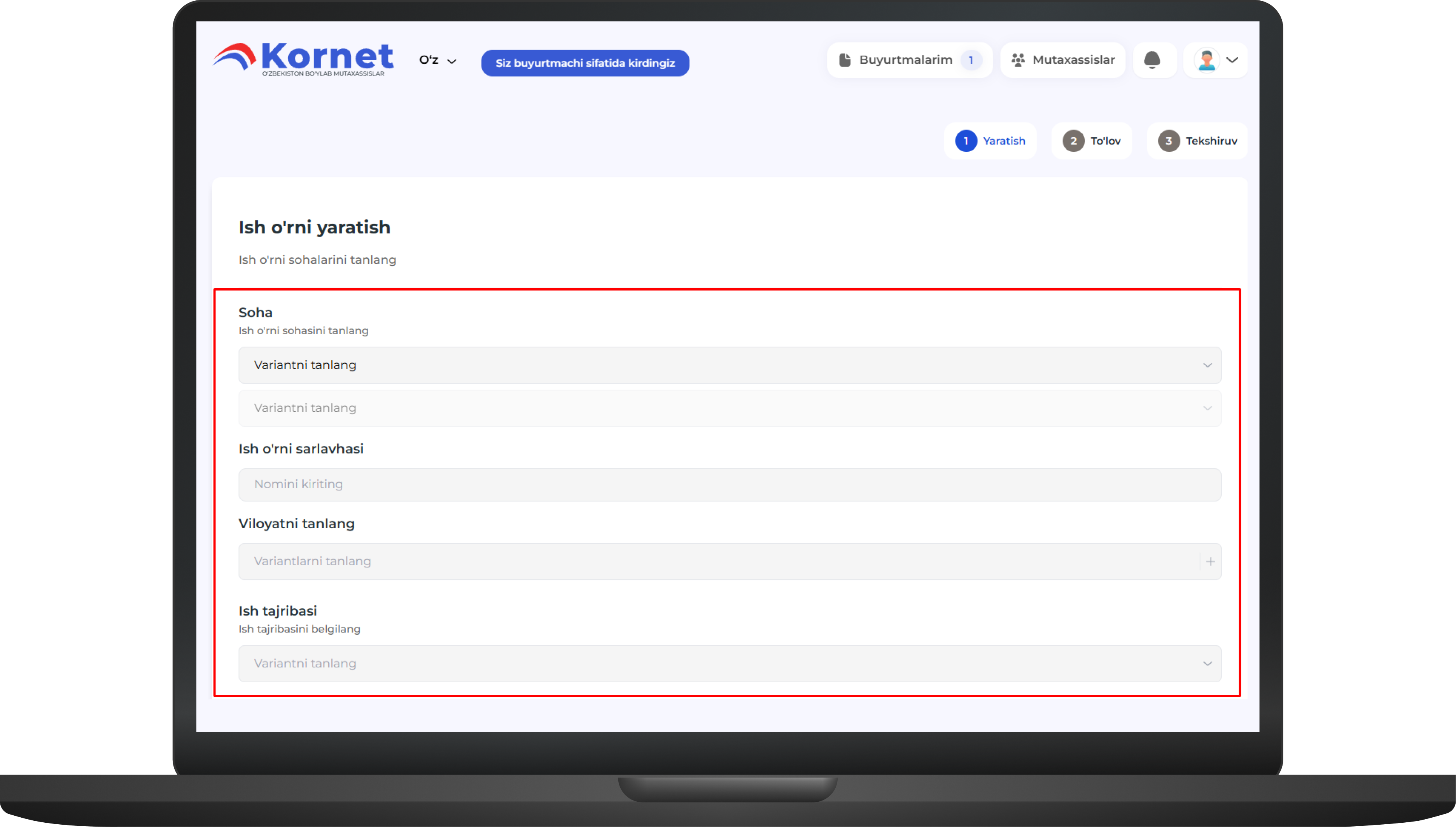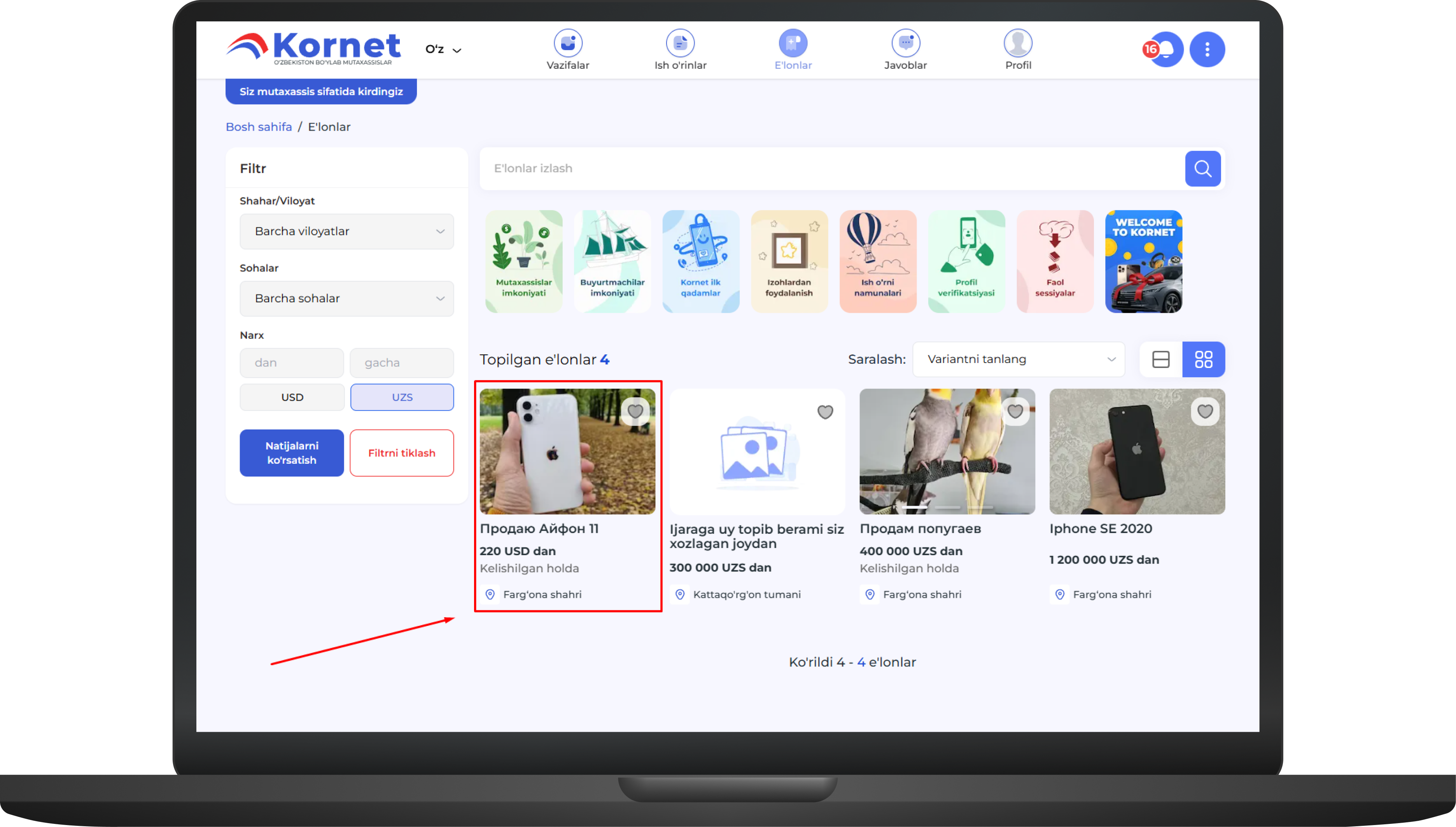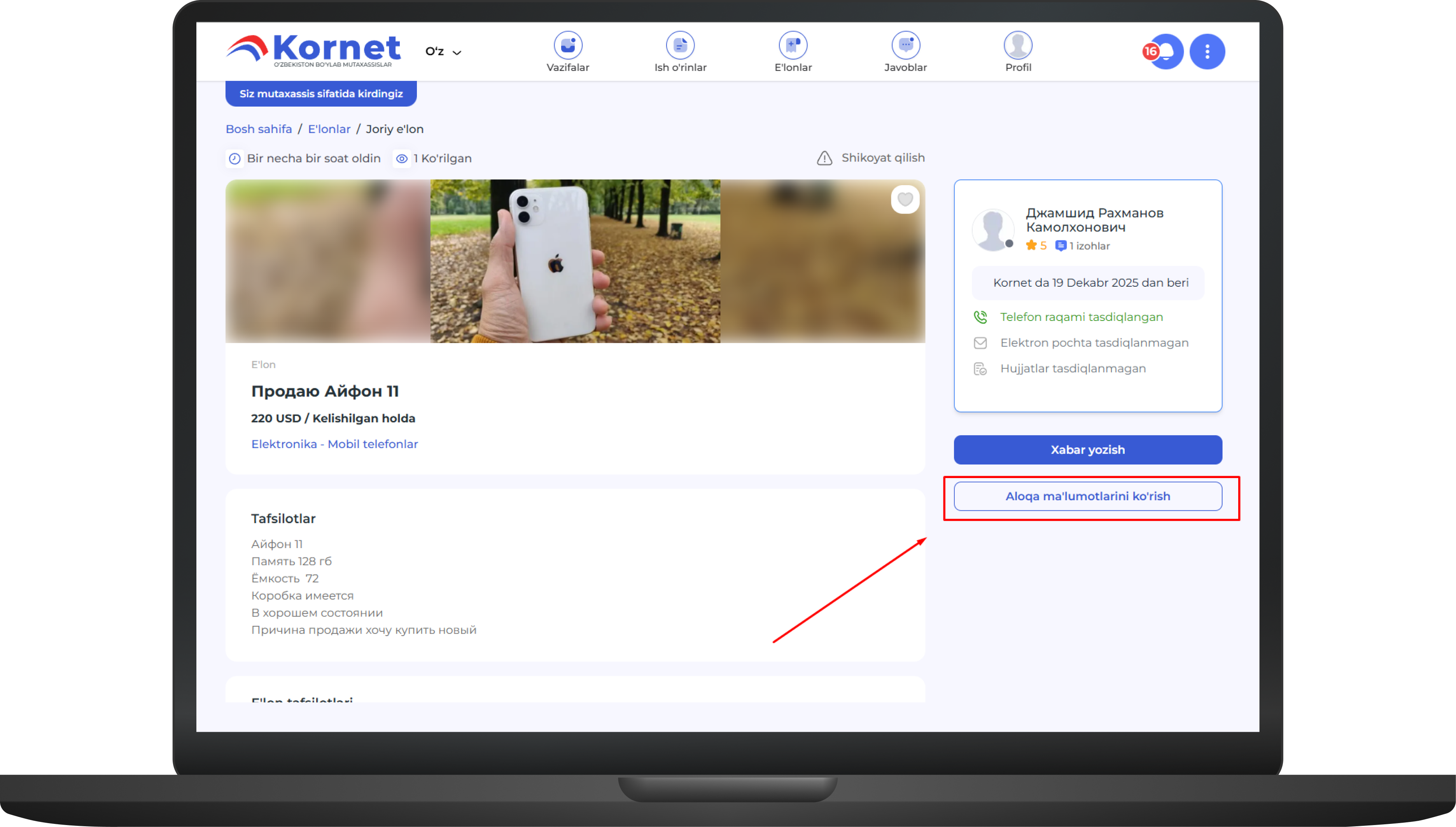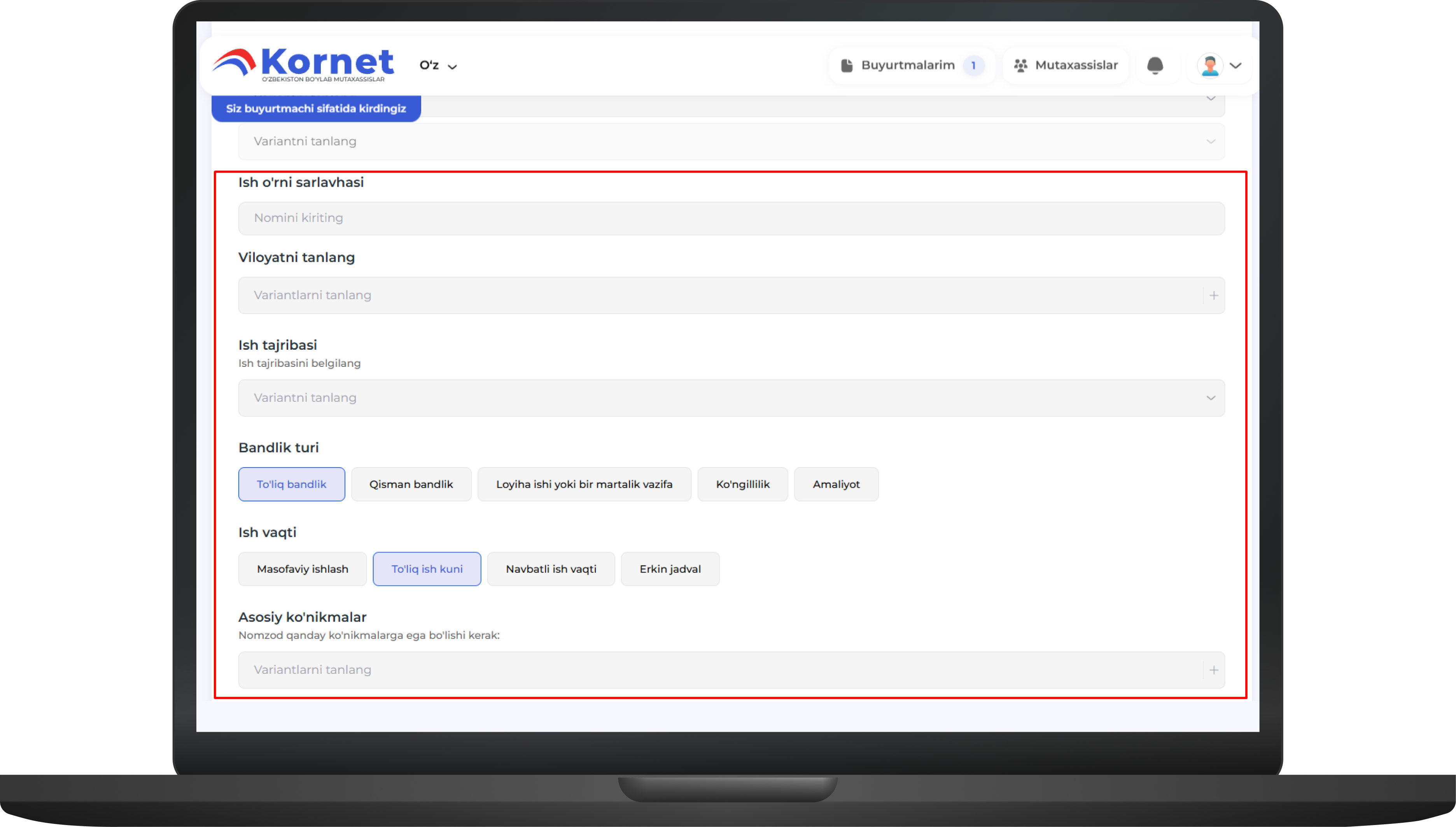 «2025-yilda Kornet.uz saytida samarali e’lon yaratish uchun maydon formatini hisobga olish muhim: bu nafaqat tovarlar (avto, ko‘chmas mulk, elektronika) sotuvi haqidagi e’lonlar taxtasi, balki xizmatlar servisidir. E’lon yaratish uchun siz "E’lonlar" bo‘limiga o‘tishingiz kerak».image.png2.21 MB«Mening buyurtmalarim» bo‘limiga o‘tish — bu shunchaki rasmiyatchilik emas. Bu yerda siz quyidagi amallarni bajarasiz: Kelishuvni tasdiqlash: Siz tanlangan ijrochini o‘z vazifangizga rasman biriktirasiz. Holatni (statusni) nazorat qilish: Ish qaysi bosqichda ekanligini ko‘rasiz (masalan: «Kutilmoqda», «Bajarilmoqda» yoki «Yakunlandi»). Xavfsizlik: Buyurtmani Kornet.uz tizimi ichida qayd etish har ikki tomonning manfaatlarini himoya qiladi.image.png2.23 MB«E’lon berish» tugmasini (yoki shunga o‘xshash «+» belgisini) bosishingiz bilan, qarshingizda e’lon yaratish bo‘limi ochiladi. Bu maxsus shakl bo‘lib, undagi ma’lumotlar sayt algoritmlari sizning taklifingizni kerakli odamlarga ko‘rsatishi uchun maydonlar bo‘yicha tizimlashtirilgan.image.png1.7 MBKo'pgina foydalanuvchilar "Yaratish" tugmasini bosgandan so'ng jarayon tugadi deb o'ylashadi, biroq Kornet.uz saytida undan keyin "Qo'shimcha ma'lumotlar" bo'limi ochiladi. Ushbu oyna e'loningizni professional darajaga keltirish va qidiruv filtrlari uchun "ko'rinarli" qilish imkonini beradi.image.png1.68 MBYangi e’lon yaratishda, birinchi navbatda, «Toifa va Ost-toifa» bo‘limiga kirishingiz mumkin. Odatda bu ochiladigan menyu yoki piktogrammalar (ikonkalar) to‘plami bo‘lib, u «Yaratish» tugmasi bosilishi bilanoq paydo bo‘ladi.image.png1.67 MBNashrni yaratishda tegishli maydonda siz «E’lon sarlavhasi»ni tanlashingiz va yozishingiz kerak. Bu qisqa ibora bo‘lib, 2 soniya ichida taklifingizning mazmunini tushuntirib berishi lozim.image.png1.6 MBПри заполнении формы публикации вы должны выбрать «Регион», в котором вы проживаете или где будет оказываться услуга. Точное указание геолокации — это залог того, что ваше объявление увидят люди именно из вашего города, что критически важно для быстрых сделок и личных встреч image.png1.69 MB«Holati» maydoni xaridorga gap do‘kondagi mahsulot haqida ketyaptimi yoki allaqachon foydalanilgan buyum haqida ekanligini bir zumda tushunishga yordam beradi. To‘g‘ri tanlov: Chatdagi keraksiz savollar sonini kamaytiradi. Shaxsiy uchrashuv vaqtida ziddiyatli vaziyatlarning oldini oladi. E’loningizni «Yangi kelganlar» toifasiga tushishiga imkon beradi.image.png1.68 MBE’lon yaratish jarayonida sotuvchi yoki ijrochi sifatidagi maqomingizni belgilash asosiy bosqichlardan biri hisoblanadi. Tegishli maydonda siz «Jismoniy shaxs yoki Biznes» toifasini tanlashingiz kerak. E’loningiz qanday ko‘rinishi va qaysi ilgari surish asboblari (instrumentlari) sizga taqdim etilishi aynan shu tanlovga bog‘liq.image.png1.67 MBE’lon yaratish shaklini to‘ldirishda siz mahsulotingiz yoki xizmatingizning «Narxi»ni ko‘rsatishingiz kerak. Narxni to‘g‘ri belgilash befoyda qo‘ng‘iroqlarning oldini olishga va faqat xarid qilishga tayyor bo‘lgan mijozlarni jalb qilishga yordam beradi.image.png1.68 MBHar qanday e’lonni yaratishda siz «Rasm» yuklashingiz mumkin va buni amalga oshirishingiz shart. Haqiqiy va aniq tasvirlarga ega bo‘lgan e’lonlar matnli nashrlarga qaraganda 5–10 baravar ko‘proq ko‘rishlar va otkliklar (javoblar) oladi.image.png1.62 MBTayanch ma’lumotlarni (sarlavha, toifa va narx) kiritib, «Yaratish» tugmasini bosganingizdan so‘ng, tizim e’lonni darhol nashr etmaydi. Navbatdagi bosqichda siz «Qo‘shimcha ma’lumotlar»ni to‘ldirishingiz kerak. Ushbu aniqlashtiruvchi tafsilotlar sayt algoritmlariga sizning taklifingizni aynan uni qidirayotgan foydalanuvchilarga tavsiya qilishga yordam beradi.image.png1.58 MBUmumiy hududni tanlaganingizdan so‘ng, e’lonni rasmiylashtirish jarayonida yoki qo‘shimcha ma’lumotlar bo‘limida siz aniq «Manzil»ni ko‘rsatishingiz mumkin. Bu sizning taklifingiz xaritada ko‘rinishiga imkon beradi va mijozlarga sizgacha yetib borish qanchalik qulayligini tushunishga yordam beradi.image.png1.59 MBE’lonni rasmiylashtirishda shaklning pastki qismida yoki qo‘shimcha sozlamalar bo‘limida siz aloqa ma’lumotlarini ko‘rsatishingiz mumkin va buni amalga oshirishingiz shart. Bu potensial mijozlarga siz bilan o‘zlari uchun qulay usulda tezda bog‘lanish imkonini beradi.E’lonni rasmiylashtirishda shaklning pastki qismida yoki qo‘shimcha sozlamalar bo‘limida siz aloqa ma’lumotlarini ko‘rsatishingiz mumkin va buni amalga oshirishingiz shart. Bu potensial mijozlarga siz bilan o‘zlari uchun qulay usulda tezda bog‘lanish imkonini beradi.image.png1.59 MBBarcha maydonlarni — sarlavha, tavsif, fotosuratlar, narx, hudud va aloqa ma’lumotlarini to‘ldirganingizdan so‘ng, qarshingizda yakuniy harakatlar menyusi ochiladi. Bu yerda siz e’loningizni aynan qanday nashr etishni yoki ilgari surishni (reklama qilishni) tanlashingiz kerak.image.png1.57 MBE’loningiz minglab foydalanuvchilarga ko‘rinishidan oldin, tizim yakuniy nazorat bosqichini taklif etadi. «Ko‘rib chiqish» (Предпросмотр) bo‘limida siz e’loningizni xuddi potensial mijoz yoki ijrochi ko‘radigan ko‘rinishda tekshirib olishingiz mumkin.image.png1.57 MBSarlavhadan tortib qo‘shimcha xarakteristikalargacha (tavsiflargacha) bo‘lgan barcha maydonlarni to‘ldirib, ularni ko‘rib chiqish (предпросмотр) bo‘limida tekshirganingizdan so‘ng, yakuniy texnik bosqich boshlanadi. «Davom etish» yoki «Nashr etish» tugmasini bosganingizdan keyin, e’loningiz avtomatik ravishda moderatsiyaga yuboriladi.image.png1.57 MB«Bekor qilish» tugmasi t