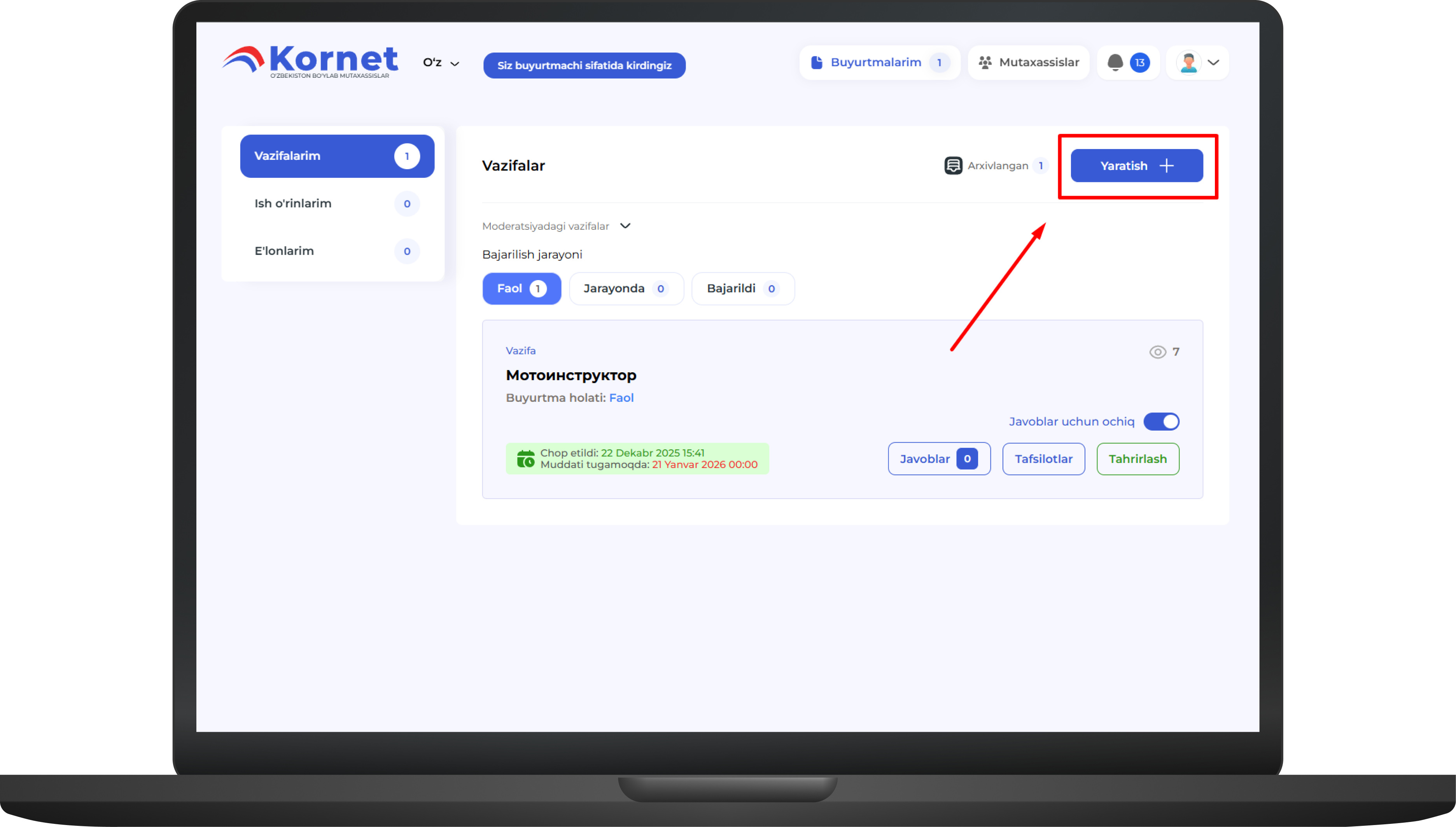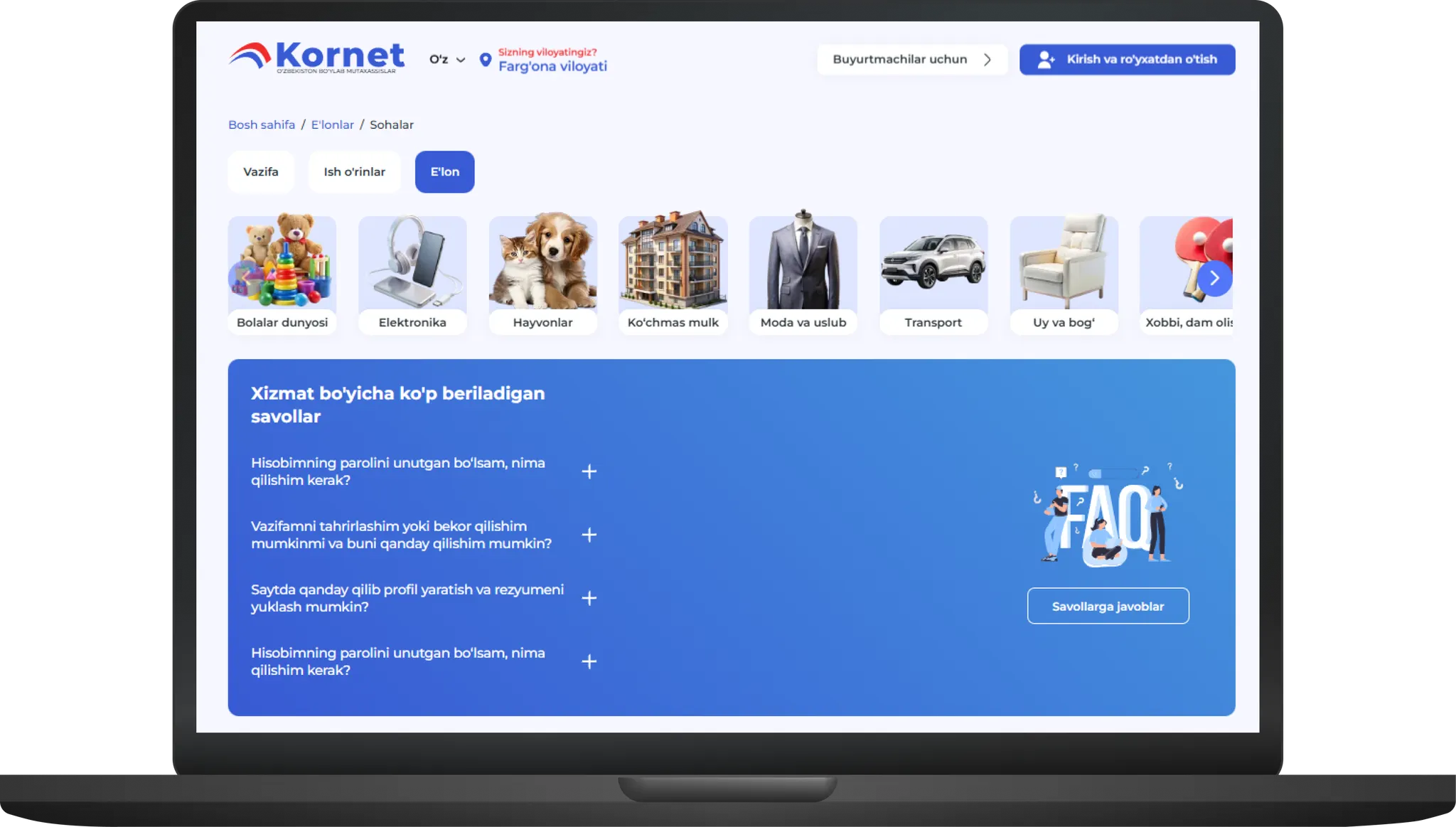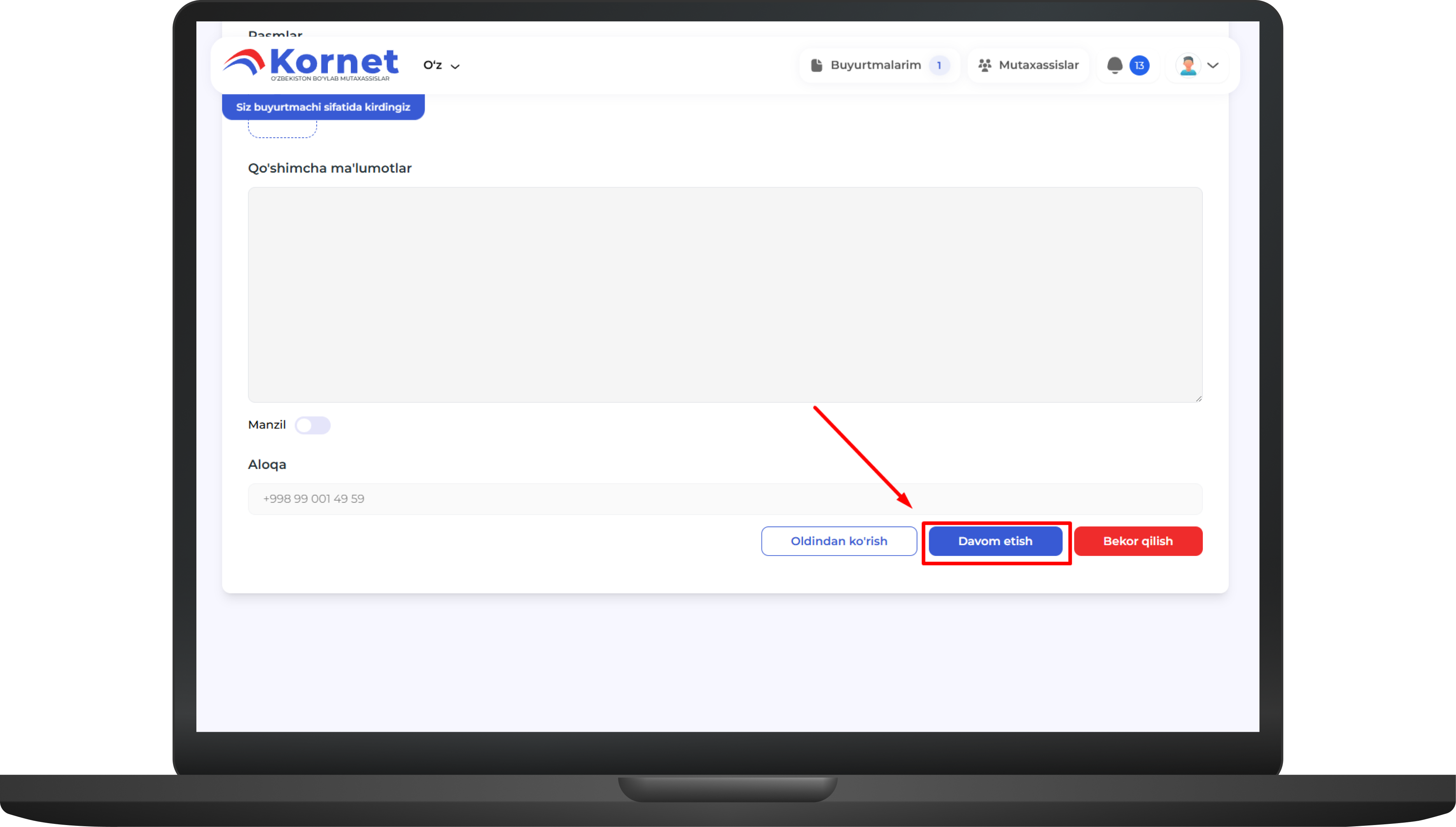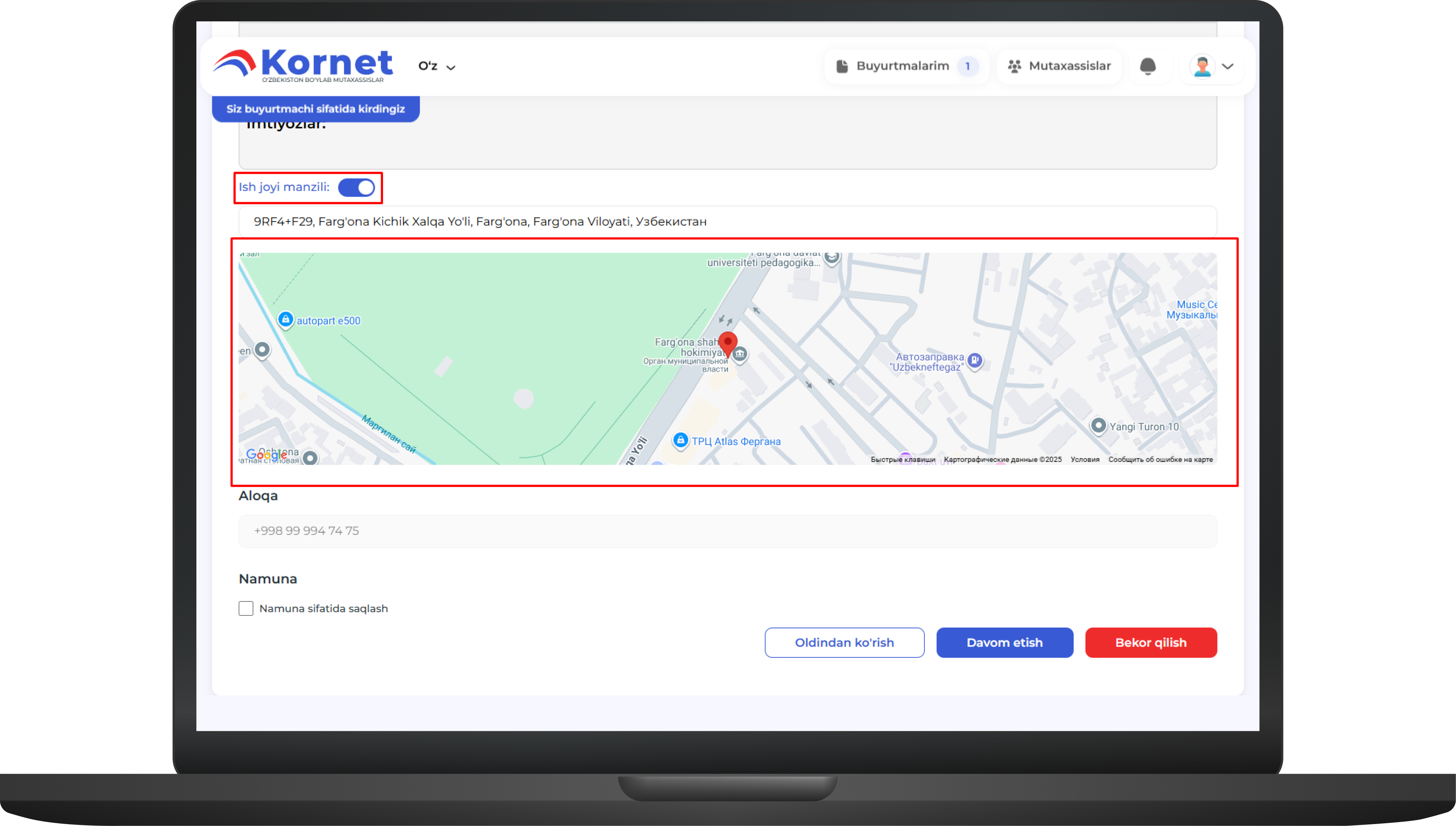 «2025-yilda Kornet.uz saytida samarali e’lon yaratish uchun maydon formatini hisobga olish muhim: bu nafaqat tovarlar (avto, ko‘chmas mulk, elektronika) sotuvi haqidagi e’lonlar taxtasi, balki xizmatlar servisidir. E’lon yaratish uchun siz "E’lonlar" bo‘limiga o‘tishingiz kerak».image.png2.21 MB«Mening buyurtmalarim» bo‘limiga o‘tish — bu shunchaki rasmiyatchilik emas. Bu yerda siz quyidagi amallarni bajarasiz: Kelishuvni tasdiqlash: Siz tanlangan ijrochini o‘z vazifangizga rasman biriktirasiz. Holatni (statusni) nazorat qilish: Ish qaysi bosqichda ekanligini ko‘rasiz (masalan: «Kutilmoqda», «Bajarilmoqda» yoki «Yakunlandi»). Xavfsizlik: Buyurtmani Kornet.uz tizimi ichida qayd etish har ikki tomonning manfaatlarini himoya qiladi.image.png2.23 MB«E’lon berish» tugmasini (yoki shunga o‘xshash «+» belgisini) bosishingiz bilan, qarshingizda e’lon yaratish bo‘limi ochiladi. Bu maxsus shakl bo‘lib, undagi ma’lumotlar sayt algoritmlari sizning taklifingizni kerakli odamlarga ko‘rsatishi uchun maydonlar bo‘yicha tizimlashtirilgan.image.png1.7 MBKo'pgina foydalanuvchilar "Yaratish" tugmasini bosgandan so'ng jarayon tugadi deb o'ylashadi, biroq Kornet.uz saytida undan keyin "Qo'shimcha ma'lumotlar" bo'limi ochiladi. Ushbu oyna e'loningizni professional darajaga keltirish va qidiruv filtrlari uchun "ko'rinarli" qilish imkonini beradi.image.png1.68 MBYangi e’lon yaratishda, birinchi navbatda, «Toifa va Ost-toifa» bo‘limiga kirishingiz mumkin. Odatda bu ochiladigan menyu yoki piktogrammalar (ikonkalar) to‘plami bo‘lib, u «Yaratish» tugmasi bosilishi bilanoq paydo bo‘ladi.image.png1.67 MBNashrni yaratishda tegishli maydonda siz «E’lon sarlavhasi»ni tanlashingiz va yozishingiz kerak. Bu qisqa ibora bo‘lib, 2 soniya ichida taklifingizning mazmunini tushuntirib berishi lozim.image.png1.6 MBПри заполнении формы публикации вы должны выбрать «Регион», в котором вы проживаете или где будет оказываться услуга. Точное указание геолокации — это залог того, что ваше объявление увидят люди именно из вашего города, что критически важно для быстрых сделок и личных встреч image.png1.69 MB«Holati» maydoni xaridorga gap do‘kondagi mahsulot haqida ketyaptimi yoki allaqachon foydalanilgan buyum haqida ekanligini bir zumda tushunishga yordam beradi. To‘g‘ri tanlov: Chatdagi keraksiz savollar sonini kamaytiradi. Shaxsiy uchrashuv vaqtida ziddiyatli vaziyatlarning oldini oladi. E’loningizni «Yangi kelganlar» toifasiga tushishiga imkon beradi.image.png1.68 MBE’lon yaratish jarayonida sotuvchi yoki ijrochi sifatidagi maqomingizni belgilash asosiy bosqichlardan biri hisoblanadi. Tegishli maydonda siz «Jismoniy shaxs yoki Biznes» toifasini tanlashingiz kerak. E’loningiz qanday ko‘rinishi va qaysi ilgari surish asboblari (instrumentlari) sizga taqdim etilishi aynan shu tanlovga bog‘liq.image.png1.67 MBE’lon yaratish shaklini to‘ldirishda siz mahsulotingiz yoki xizmatingizning «Narxi»ni ko‘rsatishingiz kerak. Narxni to‘g‘ri belgilash befoyda qo‘ng‘iroqlarning oldini olishga va faqat xarid qilishga tayyor bo‘lgan mijozlarni jalb qilishga yordam beradi.image.png1.68 MBHar qanday e’lonni yaratishda siz «Rasm» yuklashingiz mumkin va buni amalga oshirishingiz shart. Haqiqiy va aniq tasvirlarga ega bo‘lgan e’lonlar matnli nashrlarga qaraganda 5–10 baravar ko‘proq ko‘rishlar va otkliklar (javoblar) oladi.image.png1.62 MBTayanch ma’lumotlarni (sarlavha, toifa va narx) kiritib, «Yaratish» tugmasini bosganingizdan so‘ng, tizim e’lonni darhol nashr etmaydi. Navbatdagi bosqichda siz «Qo‘shimcha ma’lumotlar»ni to‘ldirishingiz kerak. Ushbu aniqlashtiruvchi tafsilotlar sayt algoritmlariga sizning taklifingizni aynan uni qidirayotgan foydalanuvchilarga tavsiya qilishga yordam beradi.image.png1.58 MBUmumiy hududni tanlaganingizdan so‘ng, e’lonni rasmiylashtirish jarayonida yoki qo‘shimcha ma’lumotlar bo‘limida siz aniq «Manzil»ni ko‘rsatishingiz mumkin. Bu sizning taklifingiz xaritada ko‘rinishiga imkon beradi va mijozlarga sizgacha yetib borish qanchalik qulayligini tushunishga yordam beradi.image.png1.59 MBE’lonni rasmiylashtirishda shaklning pastki qismida yoki qo‘shimcha sozlamalar bo‘limida siz aloqa ma’lumotlarini ko‘rsatishingiz mumkin va buni amalga oshirishingiz shart. Bu potensial mijozlarga siz bilan o‘zlari uchun qulay usulda tezda bog‘lanish imkonini beradi.E’lonni rasmiylashtirishda shaklning pastki qismida yoki qo‘shimcha sozlamalar bo‘limida siz aloqa ma’lumotlarini ko‘rsatishingiz mumkin va buni amalga oshirishingiz shart. Bu potensial mijozlarga siz bilan o‘zlari uchun qulay usulda tezda bog‘lanish imkonini beradi.image.png1.59 MBBarcha maydonlarni — sarlavha, tavsif, fotosuratlar, narx, hudud va aloqa ma’lumotlarini to‘ldirganingizdan so‘ng, qarshingizda yakuniy harakatlar menyusi ochiladi. Bu yerda siz e’loningizni aynan qanday nashr etishni yoki ilgari surishni (reklama qilishni) tanlashingiz kerak.image.png1.57 MBE’loningiz minglab foydalanuvchilarga ko‘rinishidan oldin, tizim yakuniy nazorat bosqichini taklif etadi. «Ko‘rib chiqish» (Предпросмотр) bo‘limida siz e’loningizni xuddi potensial mijoz yoki ijrochi ko‘radigan ko‘rinishda tekshirib olishingiz mumkin.image.png1.57 MBSarlavhadan tortib qo‘shimcha xarakteristikalargacha (tavsiflargacha) bo‘lgan barcha maydonlarni to‘ldirib, ularni ko‘rib chiqish (предпросмотр) bo‘limida tekshirganingizdan so‘ng, yakuniy texnik bosqich boshlanadi. «Davom etish» yoki «Nashr etish» tugmasini bosganingizdan keyin, e’loningiz avtomatik ravishda moderatsiyaga yuboriladi.image.png1.57 MB«Bekor qilish» tugmasi t