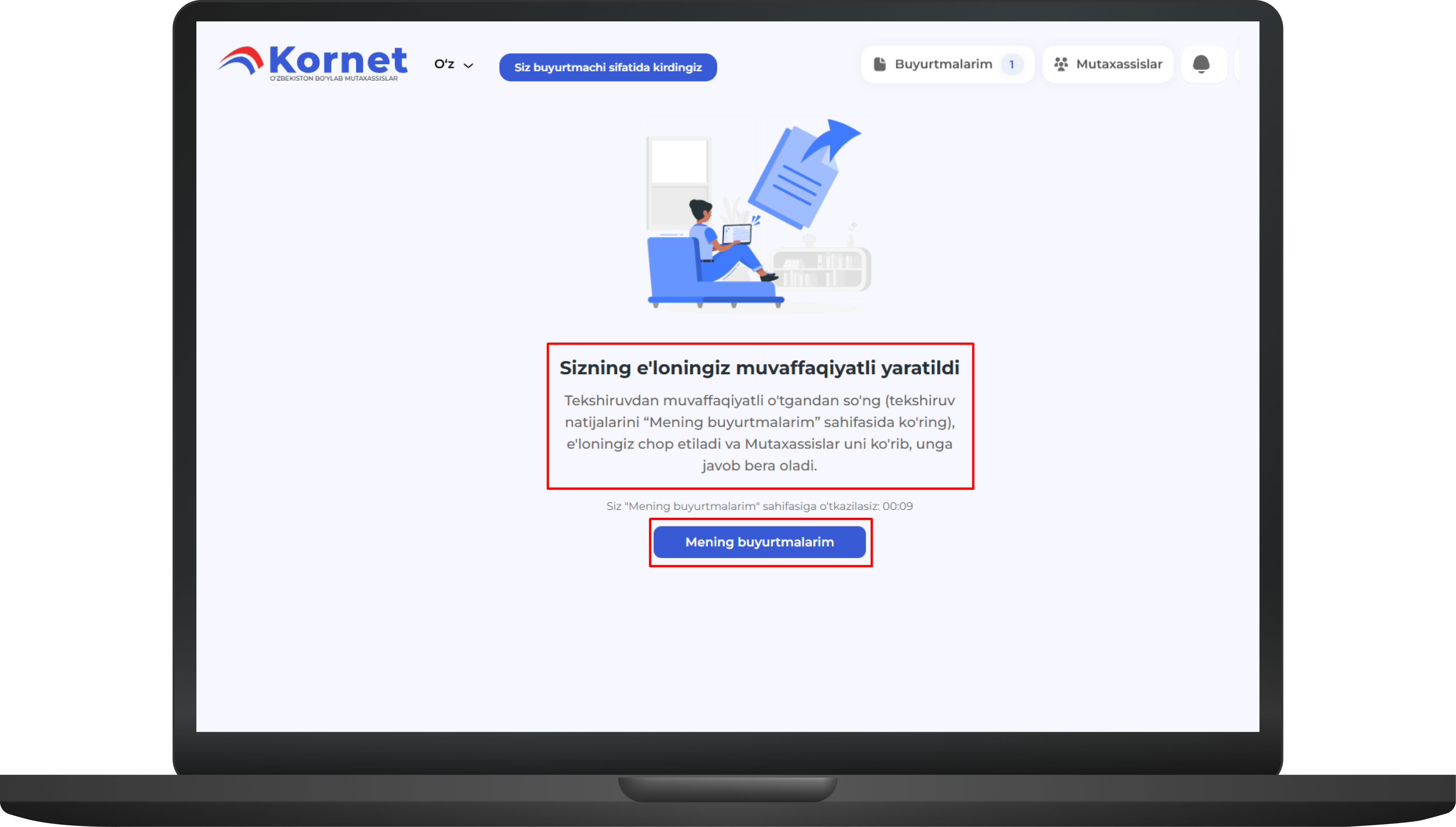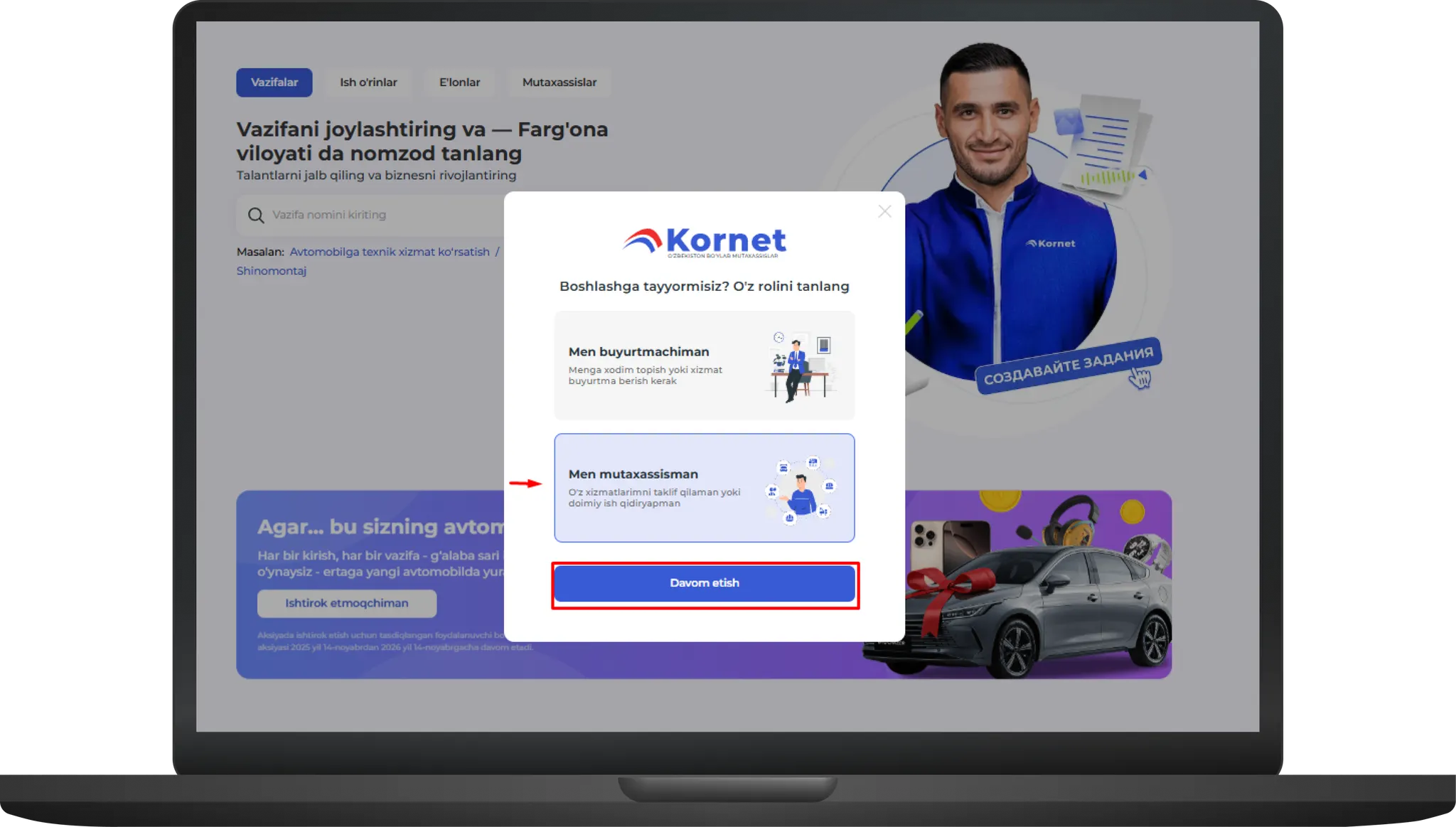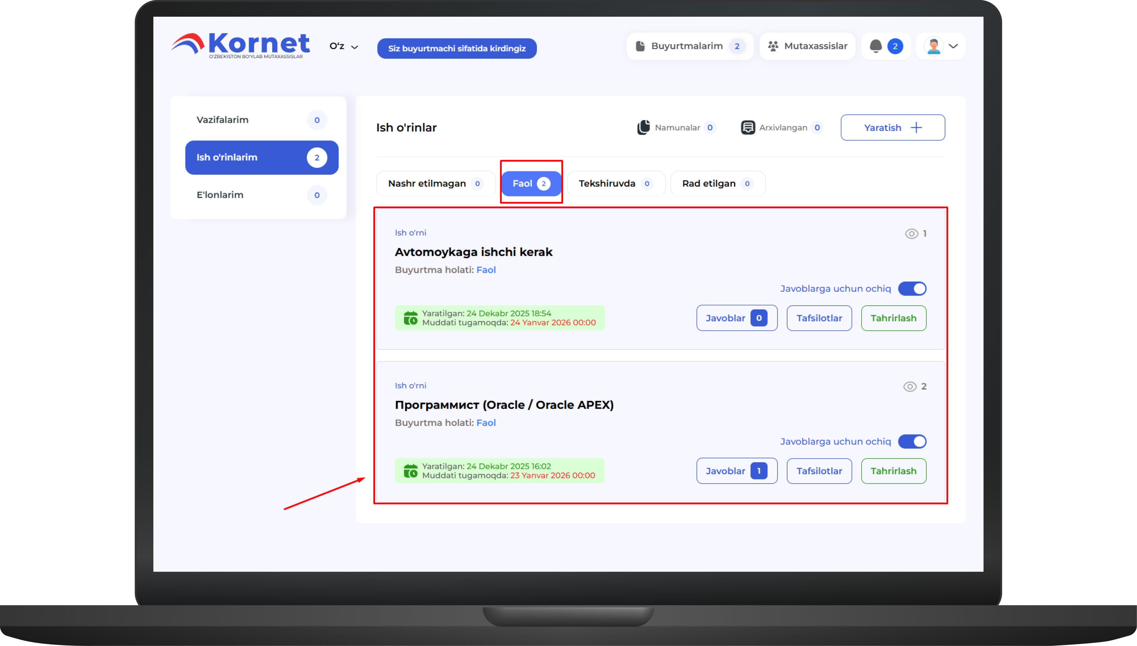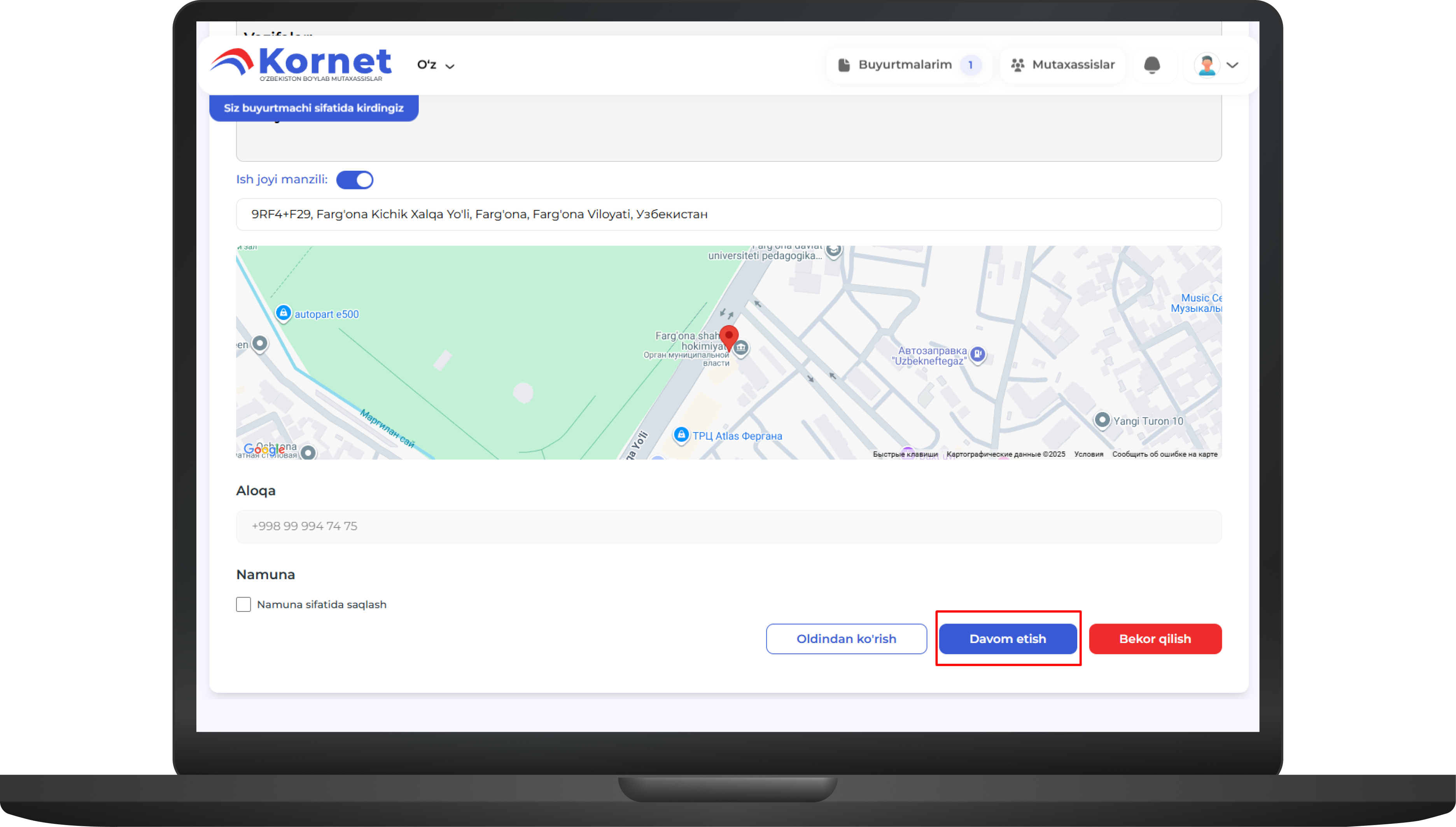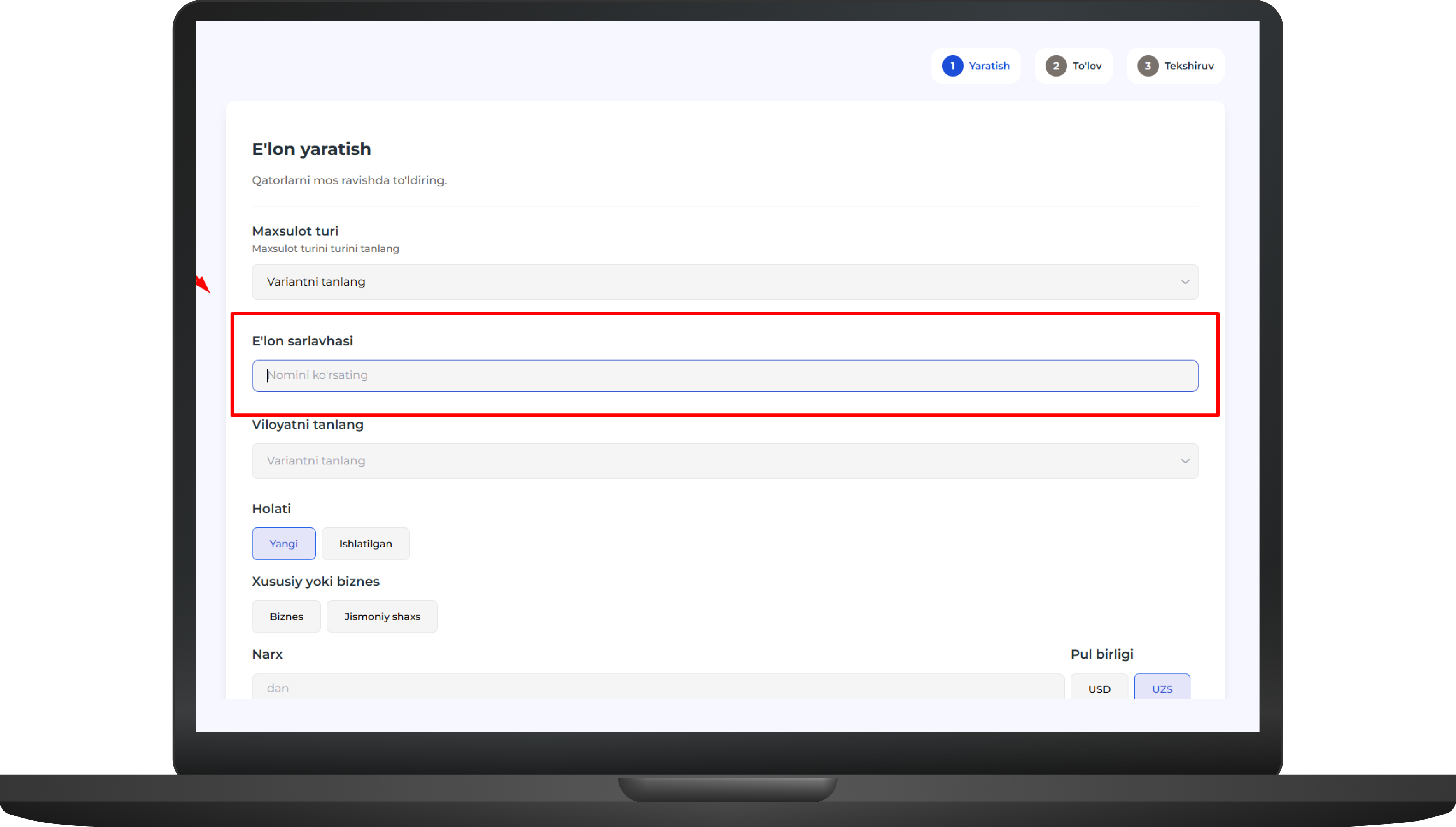 «2025-yilda Kornet.uz saytida samarali e’lon yaratish uchun maydon formatini hisobga olish muhim: bu nafaqat tovarlar (avto, ko‘chmas mulk, elektronika) sotuvi haqidagi e’lonlar taxtasi, balki xizmatlar servisidir. E’lon yaratish uchun siz "E’lonlar" bo‘limiga o‘tishingiz kerak».image.png2.21 MB«Mening buyurtmalarim» bo‘limiga o‘tish — bu shunchaki rasmiyatchilik emas. Bu yerda siz quyidagi amallarni bajarasiz: Kelishuvni tasdiqlash: Siz tanlangan ijrochini o‘z vazifangizga rasman biriktirasiz. Holatni (statusni) nazorat qilish: Ish qaysi bosqichda ekanligini ko‘rasiz (masalan: «Kutilmoqda», «Bajarilmoqda» yoki «Yakunlandi»). Xavfsizlik: Buyurtmani Kornet.uz tizimi ichida qayd etish har ikki tomonning manfaatlarini himoya qiladi.image.png2.23 MB«E’lon berish» tugmasini (yoki shunga o‘xshash «+» belgisini) bosishingiz bilan, qarshingizda e’lon yaratish bo‘limi ochiladi. Bu maxsus shakl bo‘lib, undagi ma’lumotlar sayt algoritmlari sizning taklifingizni kerakli odamlarga ko‘rsatishi uchun maydonlar bo‘yicha tizimlashtirilgan.image.png1.7 MBKo'pgina foydalanuvchilar "Yaratish" tugmasini bosgandan so'ng jarayon tugadi deb o'ylashadi, biroq Kornet.uz saytida undan keyin "Qo'shimcha ma'lumotlar" bo'limi ochiladi. Ushbu oyna e'loningizni professional darajaga keltirish va qidiruv filtrlari uchun "ko'rinarli" qilish imkonini beradi.image.png1.68 MBYangi e’lon yaratishda, birinchi navbatda, «Toifa va Ost-toifa» bo‘limiga kirishingiz mumkin. Odatda bu ochiladigan menyu yoki piktogrammalar (ikonkalar) to‘plami bo‘lib, u «Yaratish» tugmasi bosilishi bilanoq paydo bo‘ladi.image.png1.67 MBNashrni yaratishda tegishli maydonda siz «E’lon sarlavhasi»ni tanlashingiz va yozishingiz kerak. Bu qisqa ibora bo‘lib, 2 soniya ichida taklifingizning mazmunini tushuntirib berishi lozim.image.png1.6 MBПри заполнении формы публикации вы должны выбрать «Регион», в котором вы проживаете или где будет оказываться услуга. Точное указание геолокации — это залог того, что ваше объявление увидят люди именно из вашего города, что критически важно для быстрых сделок и личных встреч image.png1.69 MB«Holati» maydoni xaridorga gap do‘kondagi mahsulot haqida ketyaptimi yoki allaqachon foydalanilgan buyum haqida ekanligini bir zumda tushunishga yordam beradi. To‘g‘ri tanlov: Chatdagi keraksiz savollar sonini kamaytiradi. Shaxsiy uchrashuv vaqtida ziddiyatli vaziyatlarning oldini oladi. E’loningizni «Yangi kelganlar» toifasiga tushishiga imkon beradi.image.png1.68 MBE’lon yaratish jarayonida sotuvchi yoki ijrochi sifatidagi maqomingizni belgilash asosiy bosqichlardan biri hisoblanadi. Tegishli maydonda siz «Jismoniy shaxs yoki Biznes» toifasini tanlashingiz kerak. E’loningiz qanday ko‘rinishi va qaysi ilgari surish asboblari (instrumentlari) sizga taqdim etilishi aynan shu tanlovga bog‘liq.image.png1.67 MBE’lon yaratish shaklini to‘ldirishda siz mahsulotingiz yoki xizmatingizning «Narxi»ni ko‘rsatishingiz kerak. Narxni to‘g‘ri belgilash befoyda qo‘ng‘iroqlarning oldini olishga va faqat xarid qilishga tayyor bo‘lgan mijozlarni jalb qilishga yordam beradi.image.png1.68 MBHar qanday e’lonni yaratishda siz «Rasm» yuklashingiz mumkin va buni amalga oshirishingiz shart. Haqiqiy va aniq tasvirlarga ega bo‘lgan e’lonlar matnli nashrlarga qaraganda 5–10 baravar ko‘proq ko‘rishlar va otkliklar (javoblar) oladi.image.png1.62 MBTayanch ma’lumotlarni (sarlavha, toifa va narx) kiritib, «Yaratish» tugmasini bosganingizdan so‘ng, tizim e’lonni darhol nashr etmaydi. Navbatdagi bosqichda siz «Qo‘shimcha ma’lumotlar»ni to‘ldirishingiz kerak. Ushbu aniqlashtiruvchi tafsilotlar sayt algoritmlariga sizning taklifingizni aynan uni qidirayotgan foydalanuvchilarga tavsiya qilishga yordam beradi.image.png1.58 MBUmumiy hududni tanlaganingizdan so‘ng, e’lonni rasmiylashtirish jarayonida yoki qo‘shimcha ma’lumotlar bo‘limida siz aniq «Manzil»ni ko‘rsatishingiz mumkin. Bu sizning taklifingiz xaritada ko‘rinishiga imkon beradi va mijozlarga sizgacha yetib borish qanchalik qulayligini tushunishga yordam beradi.image.png1.59 MBE’lonni rasmiylashtirishda shaklning pastki qismida yoki qo‘shimcha sozlamalar bo‘limida siz aloqa ma’lumotlarini ko‘rsatishingiz mumkin va buni amalga oshirishingiz shart. Bu potensial mijozlarga siz bilan o‘zlari uchun qulay usulda tezda bog‘lanish imkonini beradi.E’lonni rasmiylashtirishda shaklning pastki qismida yoki qo‘shimcha sozlamalar bo‘limida siz aloqa ma’lumotlarini ko‘rsatishingiz mumkin va buni amalga oshirishingiz shart. Bu potensial mijozlarga siz bilan o‘zlari uchun qulay usulda tezda bog‘lanish imkonini beradi.image.png1.59 MBBarcha maydonlarni — sarlavha, tavsif, fotosuratlar, narx, hudud va aloqa ma’lumotlarini to‘ldirganingizdan so‘ng, qarshingizda yakuniy harakatlar menyusi ochiladi. Bu yerda siz e’loningizni aynan qanday nashr etishni yoki ilgari surishni (reklama qilishni) tanlashingiz kerak.image.png1.57 MBE’loningiz minglab foydalanuvchilarga ko‘rinishidan oldin, tizim yakuniy nazorat bosqichini taklif etadi. «Ko‘rib chiqish» (Предпросмотр) bo‘limida siz e’loningizni xuddi potensial mijoz yoki ijrochi ko‘radigan ko‘rinishda tekshirib olishingiz mumkin.image.png1.57 MBSarlavhadan tortib qo‘shimcha xarakteristikalargacha (tavsiflargacha) bo‘lgan barcha maydonlarni to‘ldirib, ularni ko‘rib chiqish (предпросмотр) bo‘limida tekshirganingizdan so‘ng, yakuniy texnik bosqich boshlanadi. «Davom etish» yoki «Nashr etish» tugmasini bosganingizdan keyin, e’loningiz avtomatik ravishda moderatsiyaga yuboriladi.image.png1.57 MB«Bekor qilish» tugmasi t