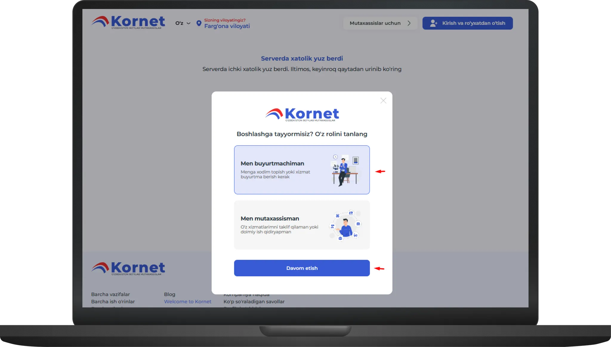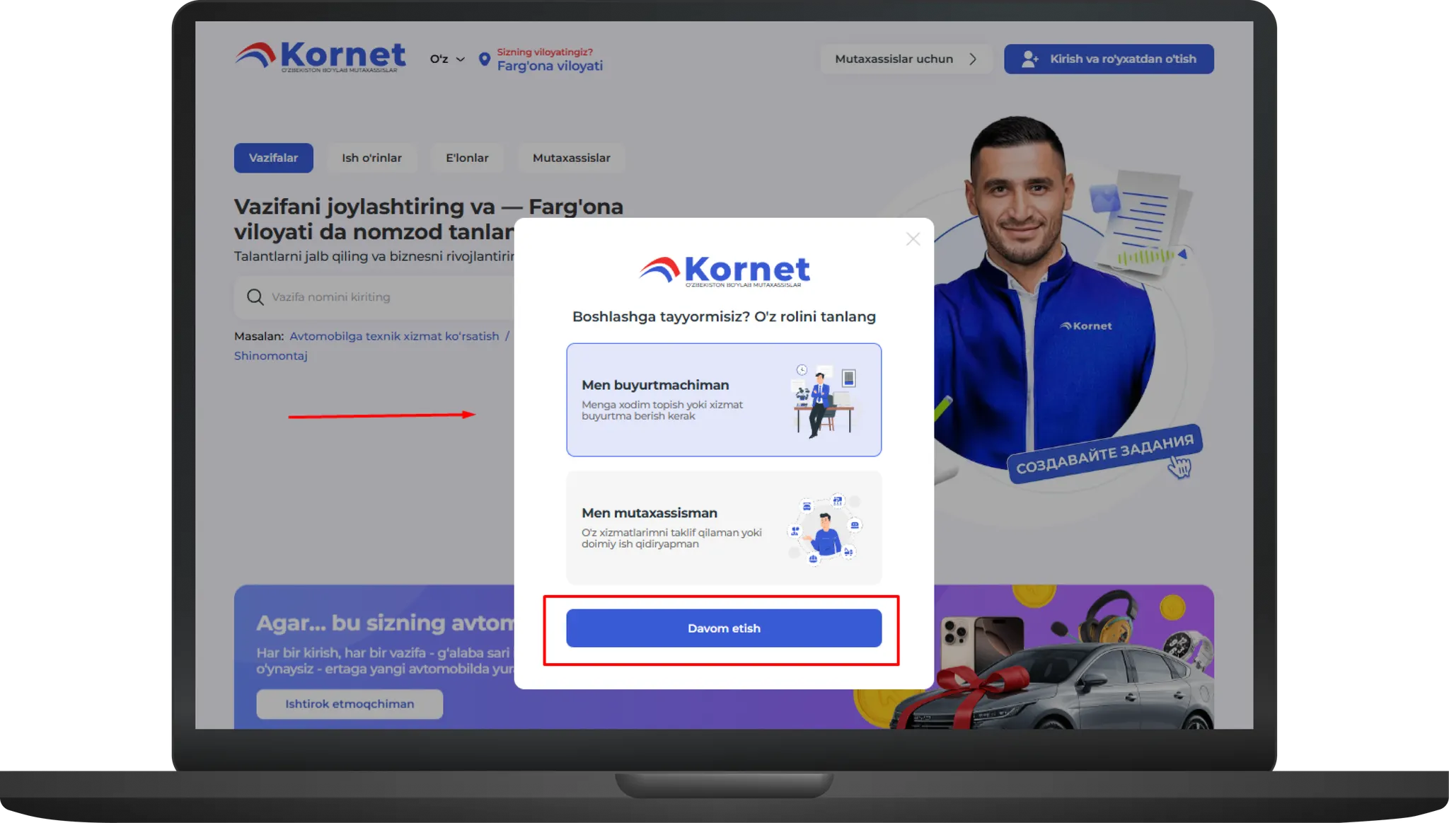 Siz hali mijoz hisobingizni yaratmagan bo'lsangiz ham, shunchaki buyurtmangiz sarlavhasini yozib va nashringiz turiga qarab "Vazifa yaratish", "Bo'sh ish o'rni yaratish" yoki "Reklama yaratish" tugmasini bosish orqali vazifalar yaratishingiz mumkin.image.png849.13 KBKeyin, siz standart bo'yicha kerakli rolni tanlaysiz va "Davom etish" tugmasini bosishingiz kerak. Ma'lumotlaringizni kiriting va postingizni yaratishda davom etingimage.png636.46 KB