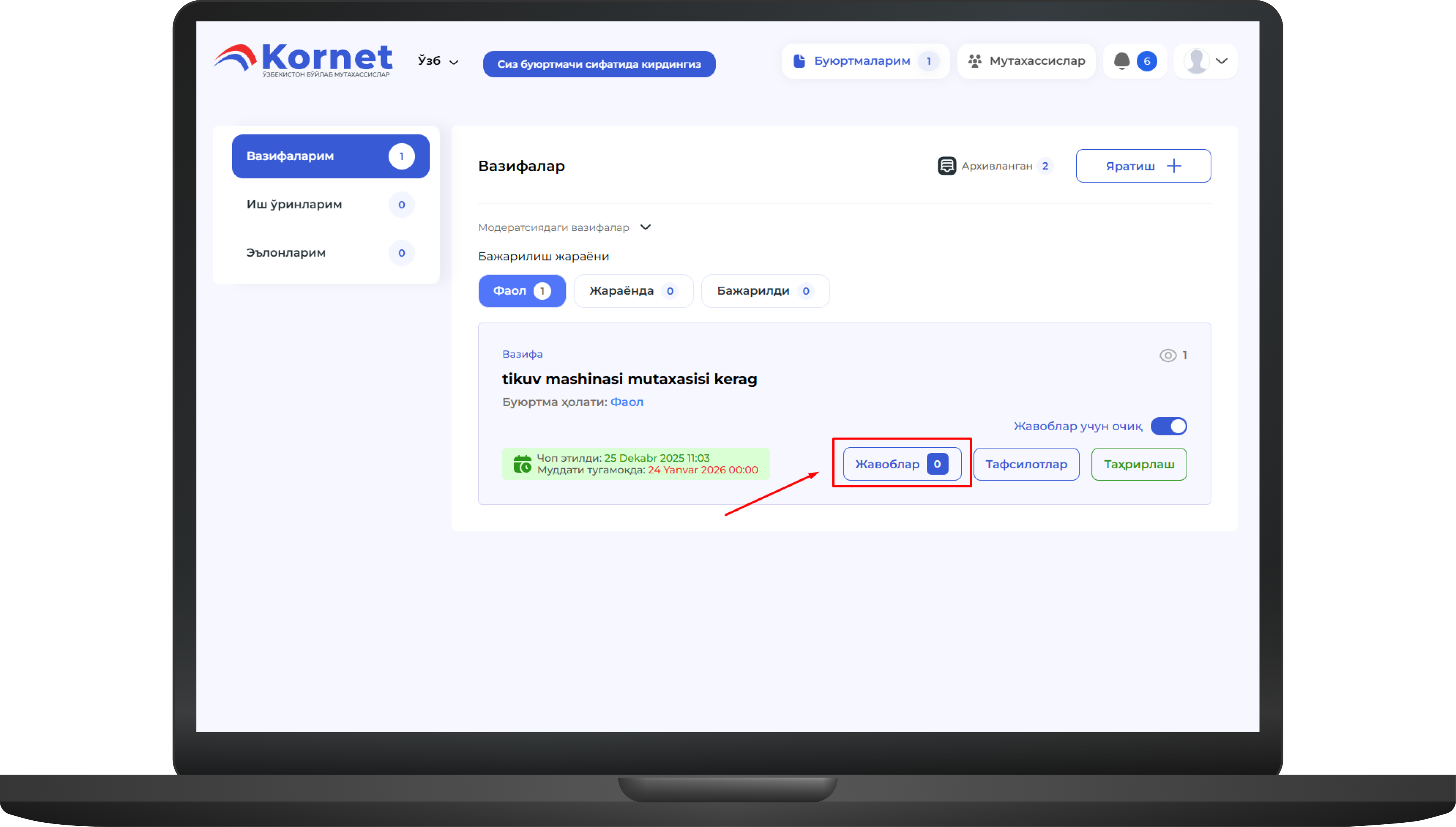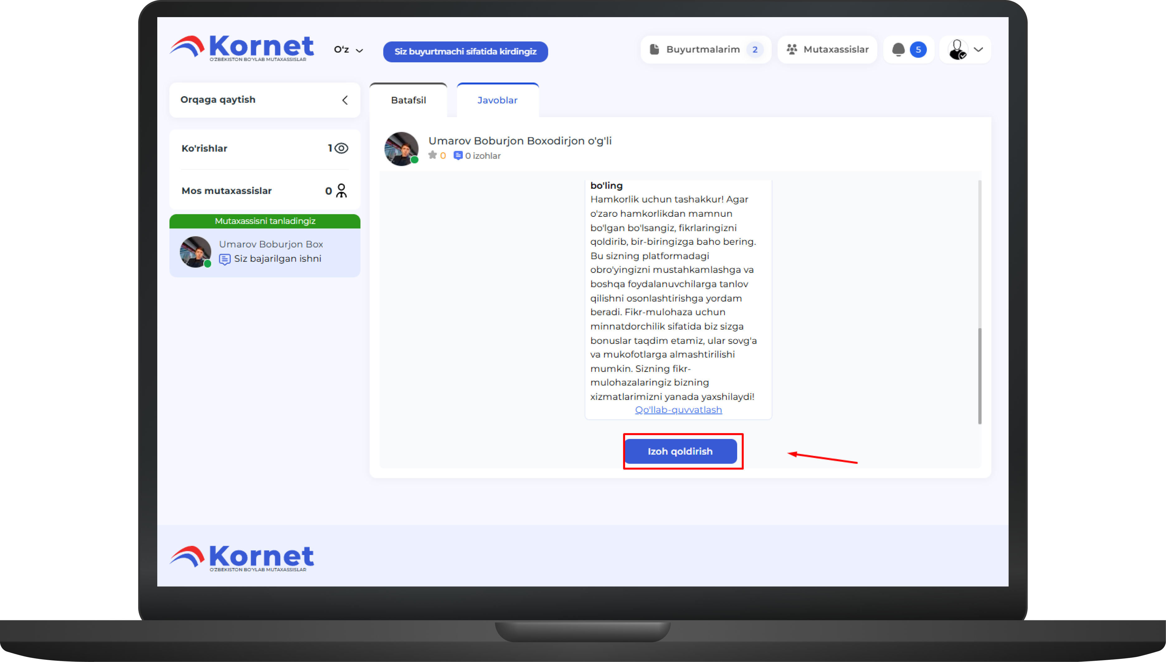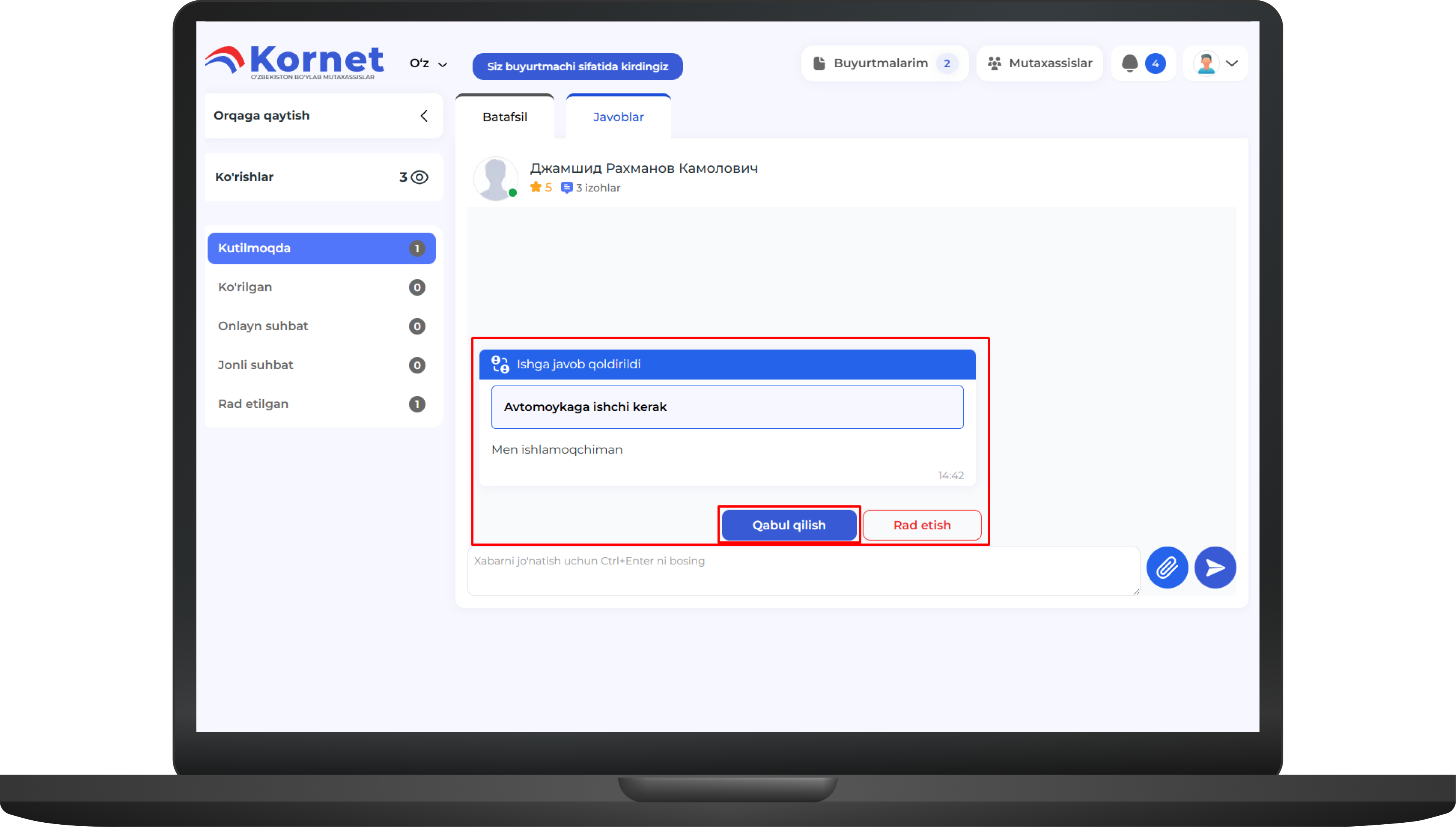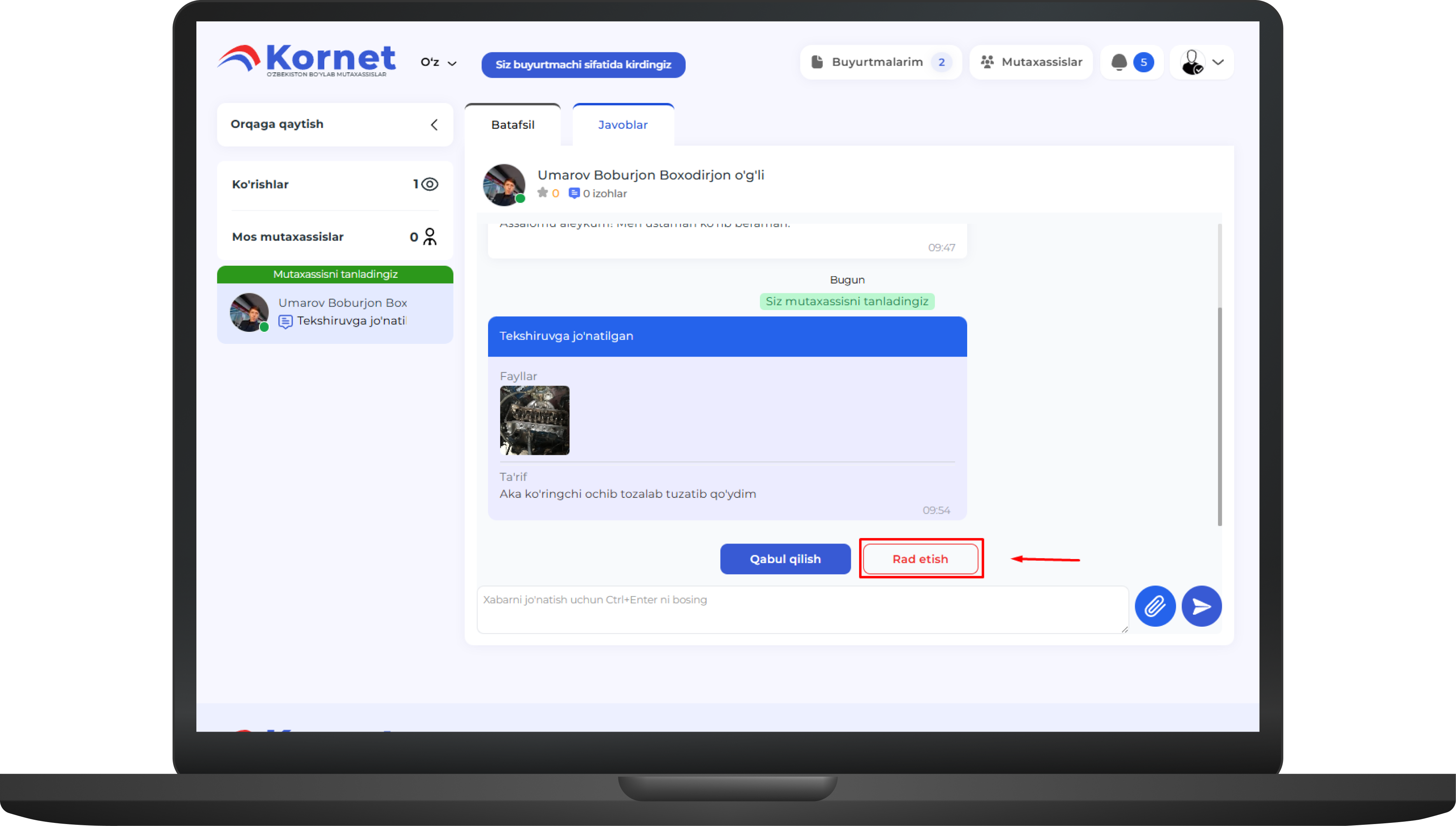Mutaxassis sizga tekshirish uchun yuborgan vazifani ko‘rib chiqishingiz mumkin.image.png2.04 MB Tekshiruvdan so‘ng mutaxassisdan topshiriqni qabul qilishingiz mumkin. image.png2.07 MBShuningdek, siz topshiriqni rad etishingiz va uni mutaxassis tahrirlashi uchun qayta tahrirlashga yuborishingiz mumkin.image.png1.81 MB Mutaxassisdan topshiriqni qabul qilgandan so‘ng, siz mutaxassisga topshiriqning bajarilishi haqida fikr-mulohaza qoldirishingiz mumkin. image.png1.88 MB Mutaxassisni baholashingiz mumkin.image.png1.71 MB Mutaxassis haqida fikr-mulohaza bildirishingiz mumkin.image.png1.72 MB Bajarilgan vazifa haqidagi fotosuratni mutaxassisning bajargan ishi to‘g‘risidagi hisobot sifatida biriktirishingiz mumkin.image.png1.8 MB Yuqoridagi barcha bandlarni to‘ldirgandan so‘ng, siz javob yuborishingiz mumkin.image.png1.79 MB