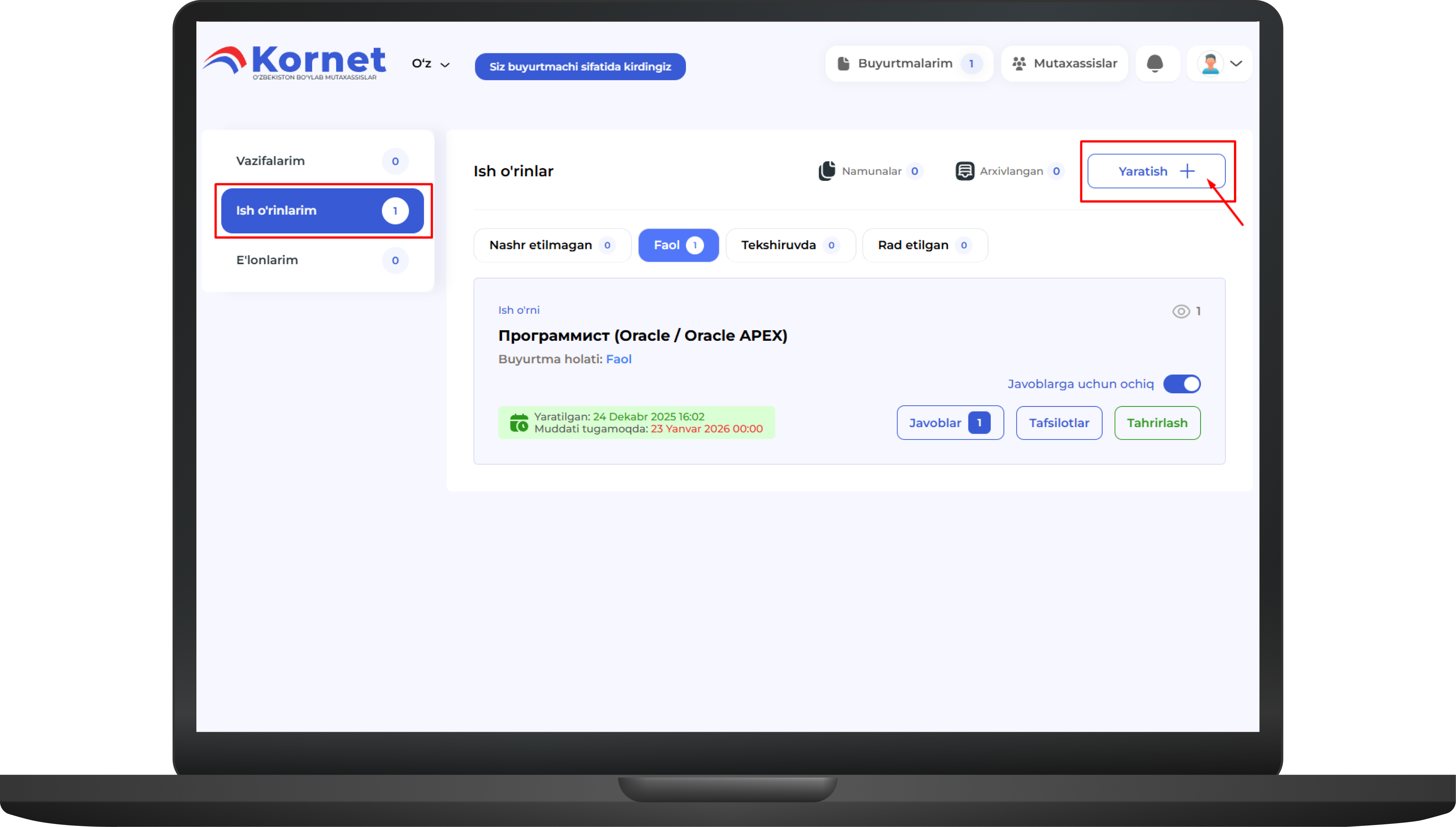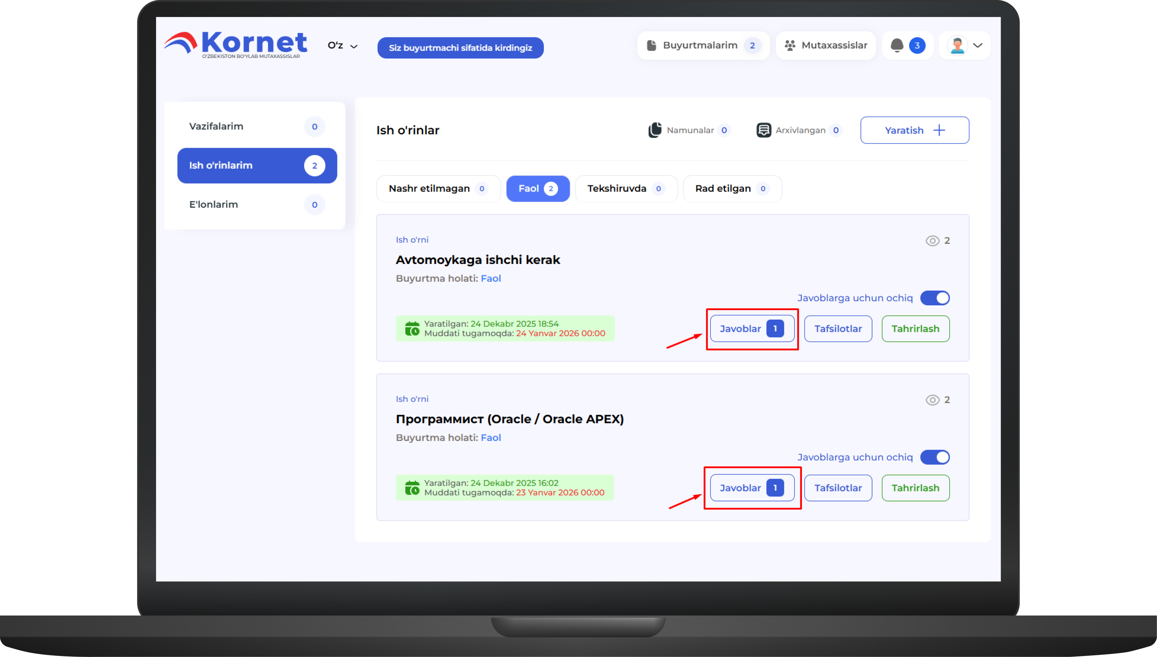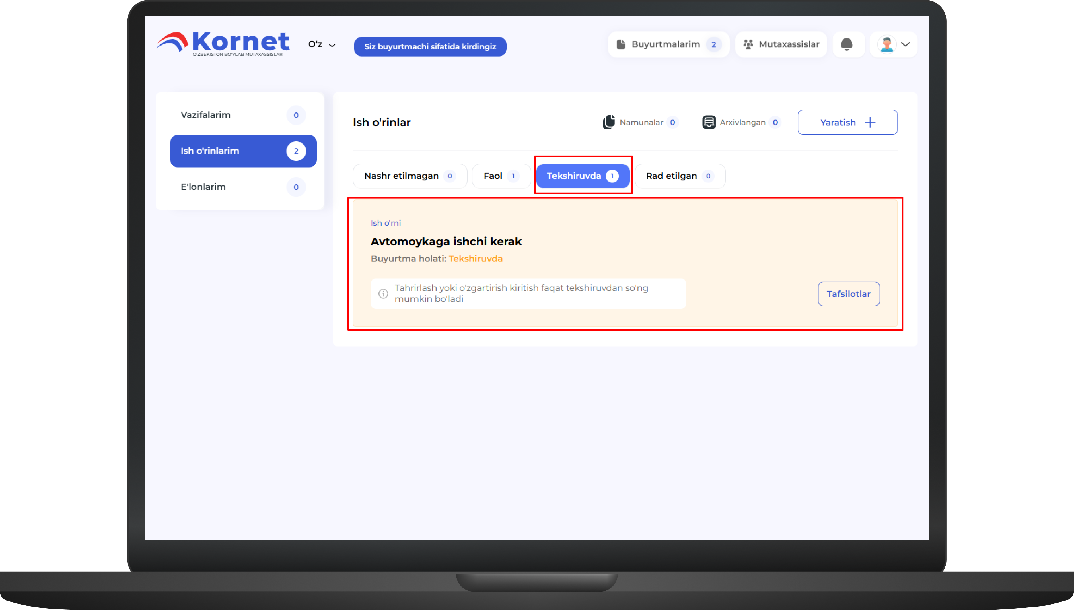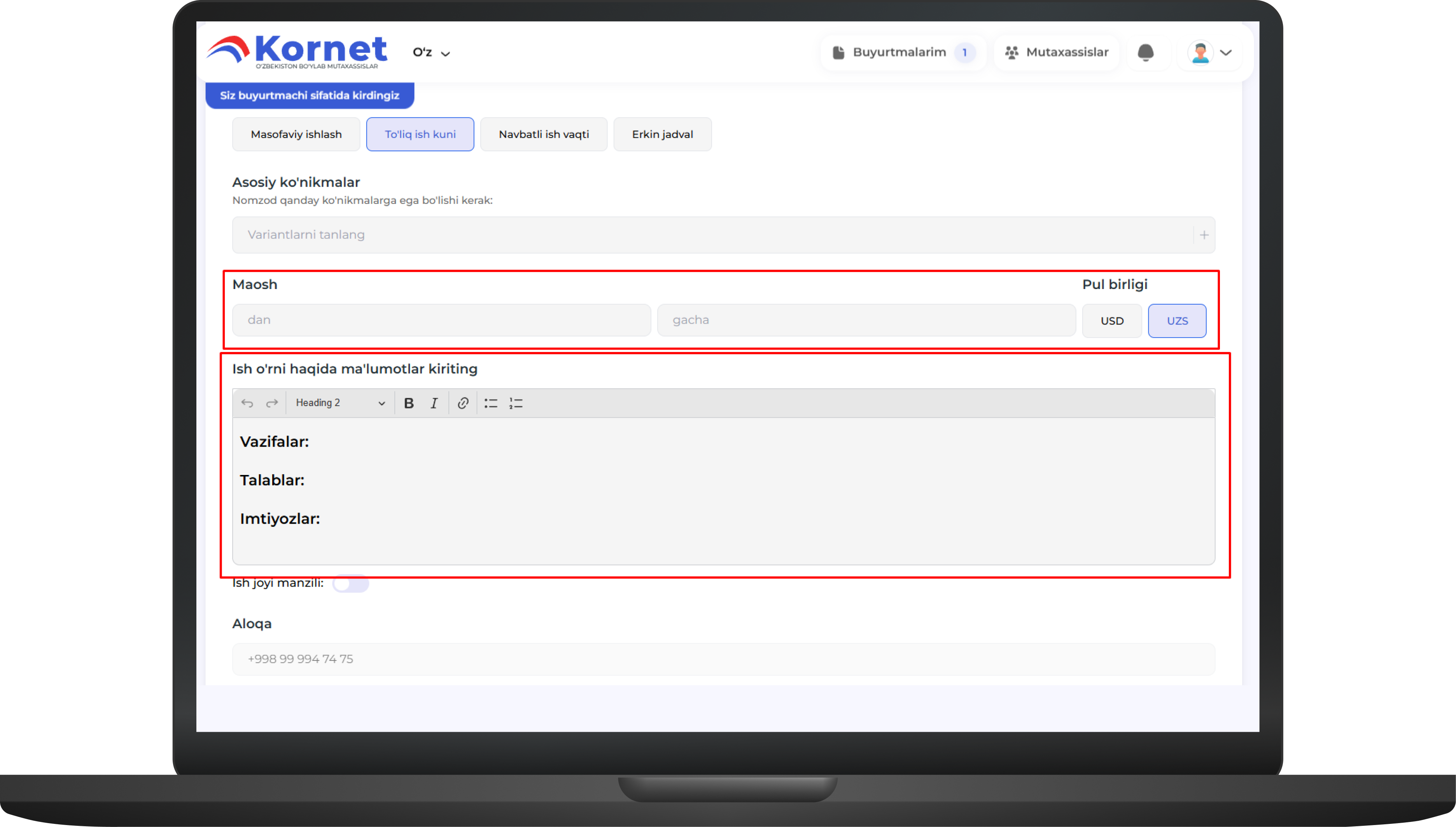 Vakansiya yaratish bo‘limiga o‘ting “Yaratish”image.png1.72 MBVakansiya nomini kiriting Lavozimning aniq va tushunarli nomini yozing (masalan: Savdo menejeri, Backend dasturchi).image.png1.64 MBKategoriya va faoliyat sohasini tanlang Vakansiya mos auditoriyaga ko‘rinishi uchun tegishli kategoriyani tanlang.image.png1.61 MBVakansiya tavsifini to‘ldiring Ko‘rsating: Ish qaysi viloyatda olib borilishini belgilang; Tajriba yilini tanlang; ish sharoitlari (jadval, format, tajriba).image.png1.71 MBTo‘lov shartlarini va vazifalar, nomzoddan talablar ko‘rsatingimage.png1.68 MBManzilni va ish formatini ko‘rsating Shahar va ish formatini tanlang: ofis, masofadan yoki gibrid.image.png2.17 MBVakansiyani e’lon qiling «Davom etish» tugmasini bosing. Vakansiya moderatsiyadan o‘tishi mumkin.image.png2.15 MB«Davom etish» tugmasini bosganingizdan so‘ng siz e’lon muvaffaqiyatli yaratilgani haqida xabarni ko‘rasiz va u moderatsiya tekshiruvidan o‘tish uchun yuboriladi. image.png1.74 MBShundan so‘ng siz o‘z e’loningizni «Mening vakansiyalarim» bo‘limida, «Tekshiruvda» holatda ko‘ra olasiz. image.png1.68 MBAgar moderatorlar e’loningizda qoidabuzarliklarni aniqlamasa, u “Faol” holatiga o‘tkaziladi va foydalanuvchilar uchun ochiq bo‘ladi. image.png1.85 MBMutaxasis ishga qiziqish bildirgan bo’lsa siz buni Javoblar bo’limidan topishingiz mumkin. Mutaxasis ishga qiziqish bildirgan bo’lsa siz buni Javoblarbo’limidan topishingiz mumkin.image.png1.86 MBMutaxassisning izohlari , baxolari barchasi sizga ma’qul bo’lsa siz Qabul qilish orqali suxbatni boshlaysiz. image.png1.71 MBMutaxassis bilan intervyu’ni onlayn yoki offline formatdaligini tanlab vaqtini belgilash imkoniyatingiz bor va o’zingiz image.png1.84 MB