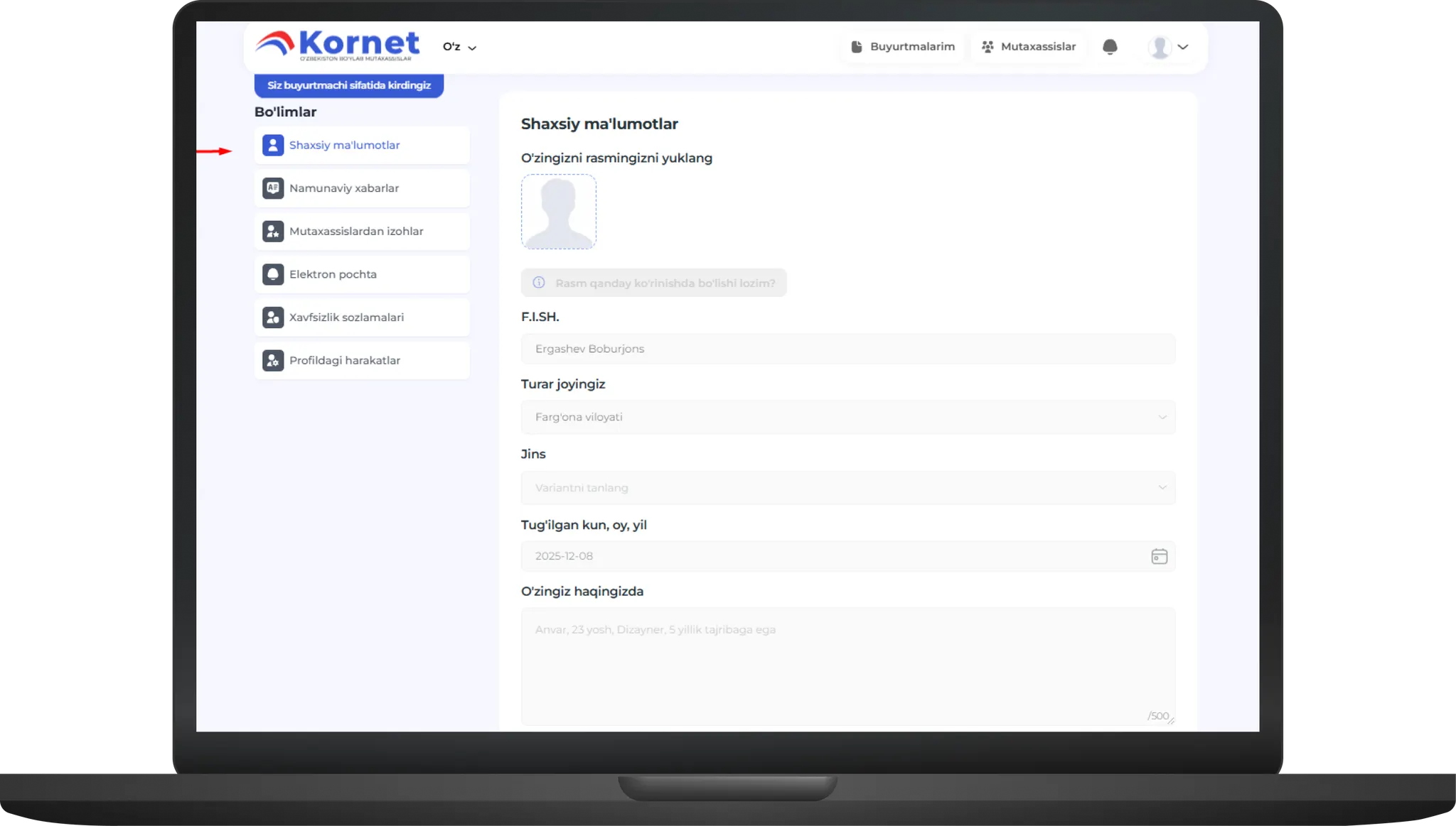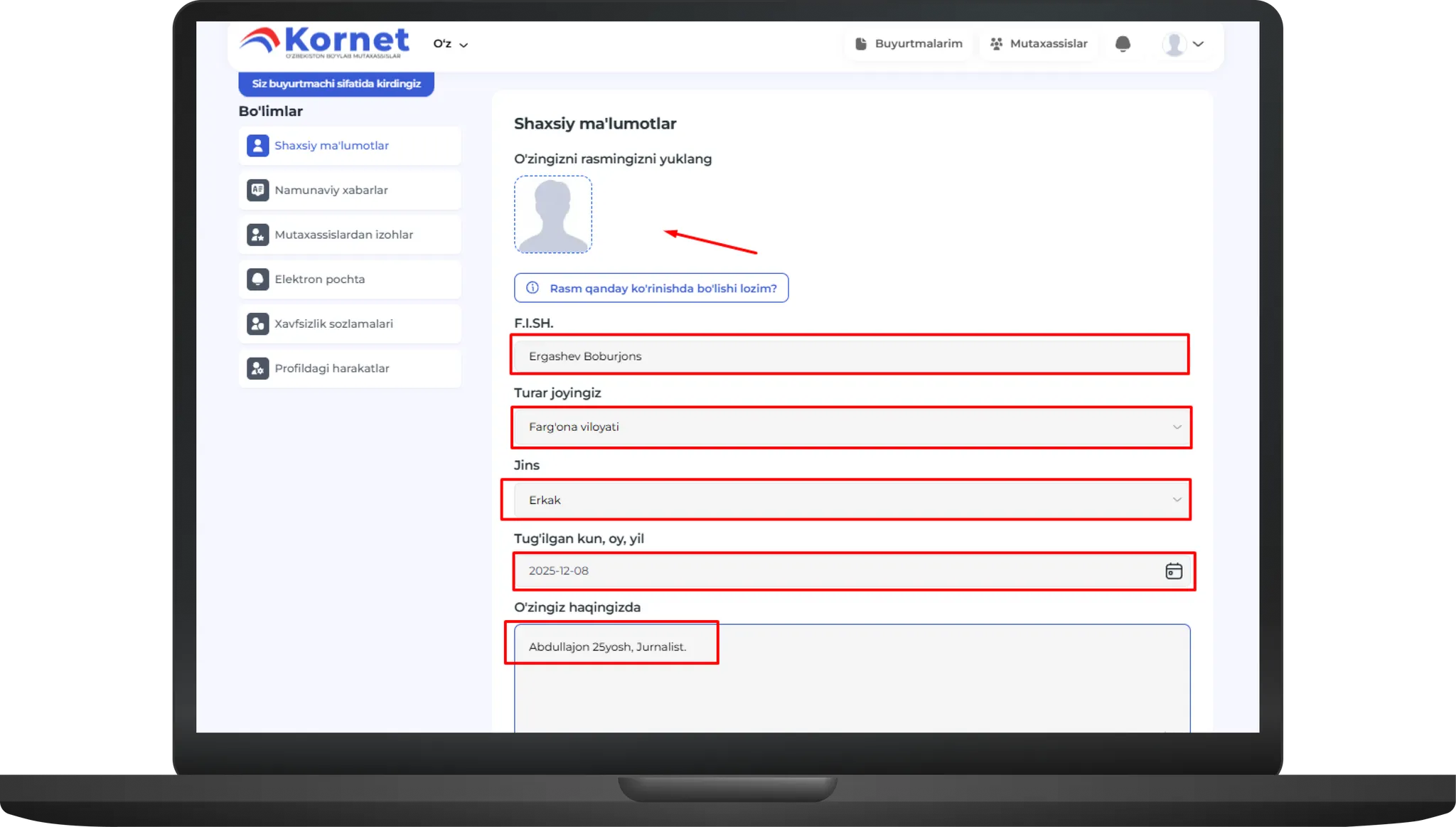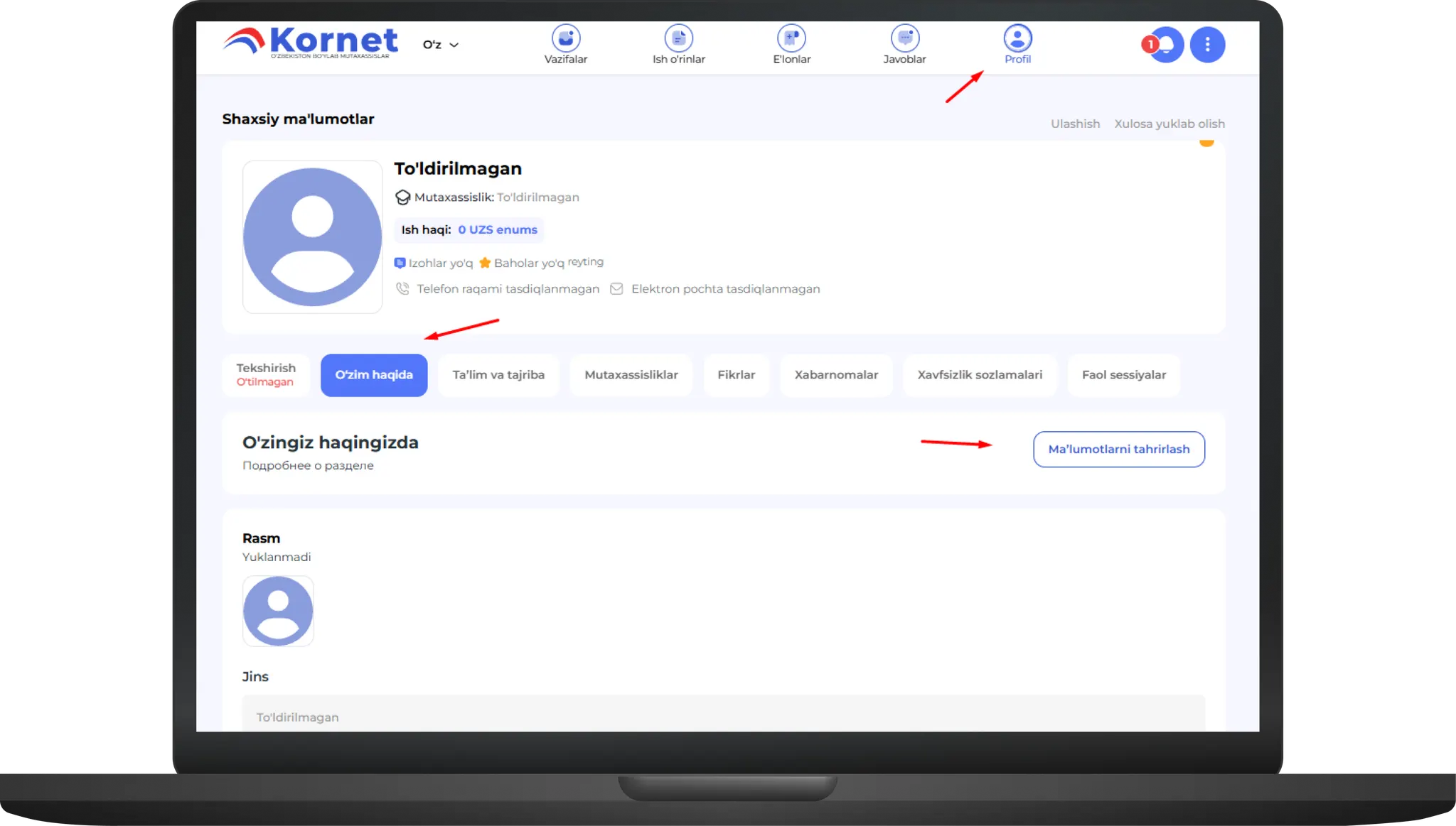 Ushbu sahifada siz shaxsiy ma'lumotlaringizni to'ldirishingiz yoki o'zgartirishingiz mumkin.