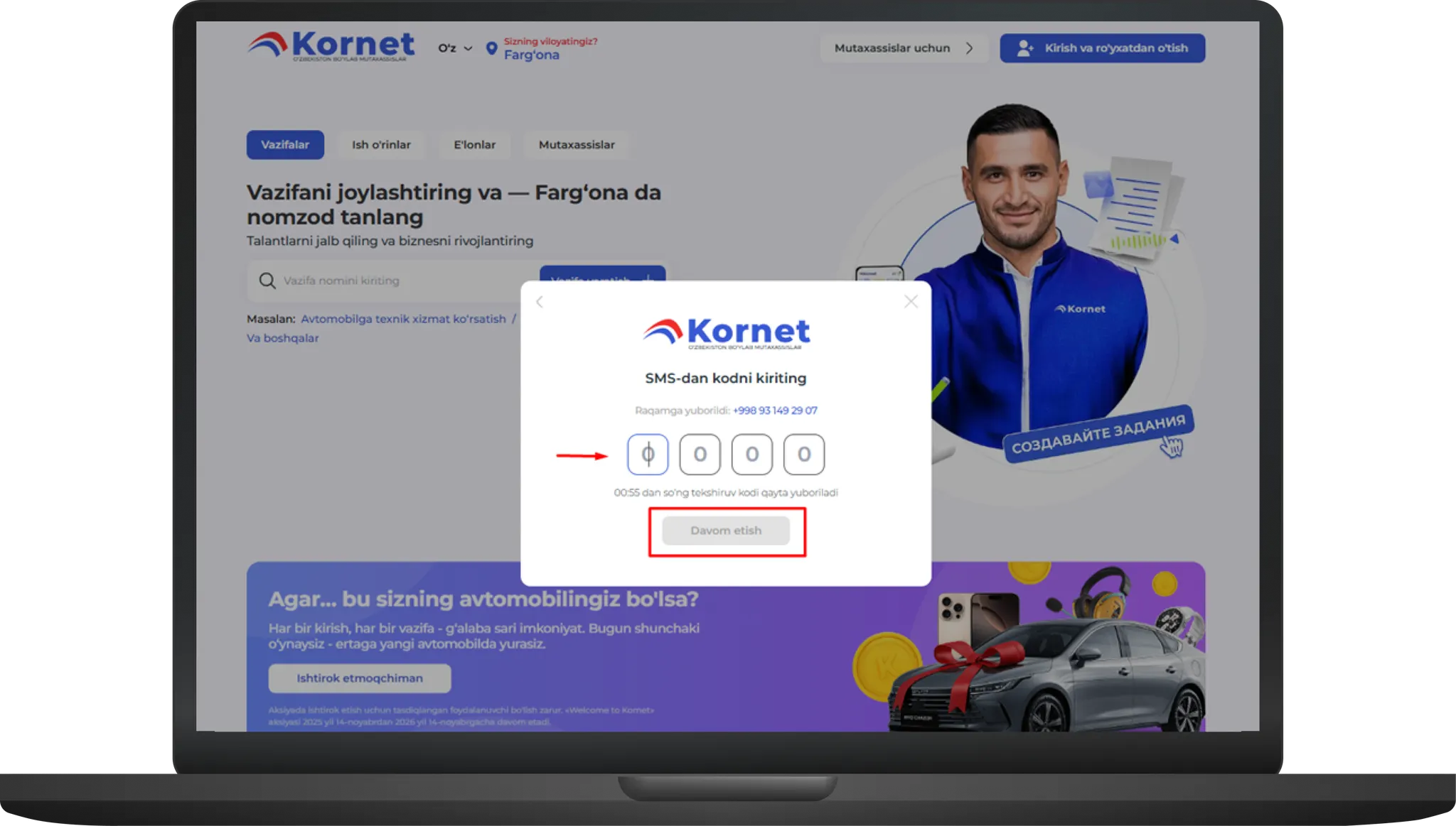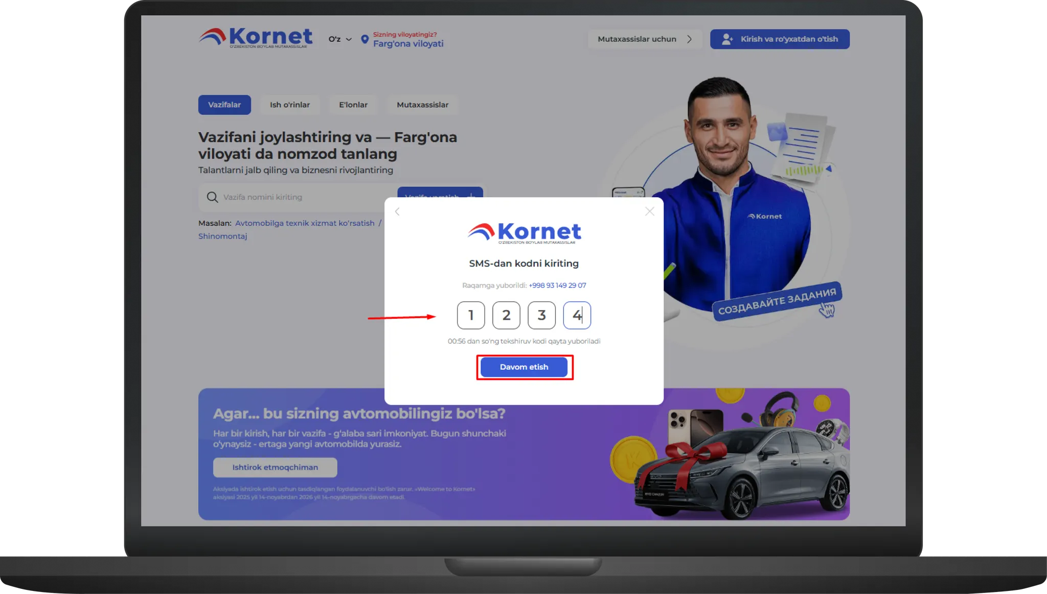 Kelgan SMS-dir kodni ochilgan maydonga kiriting. Agar kod bir daqiqadan so‘ng kelmasa — «Qayta yuborish» tugmasidan foydalaning. To‘g‘ri kodni kiritgandan so‘ng «Davom ettirish» tugmasini bosing.