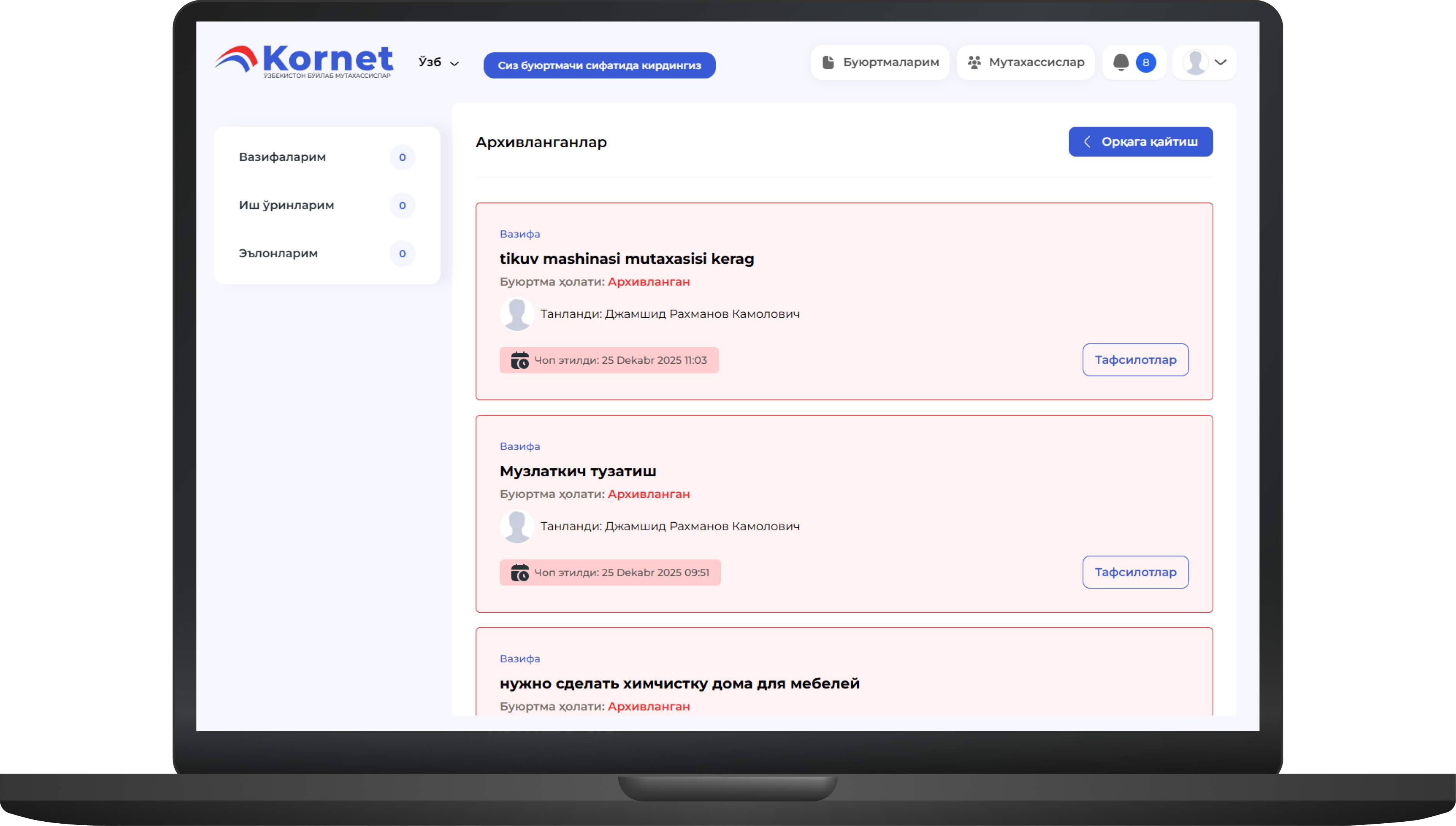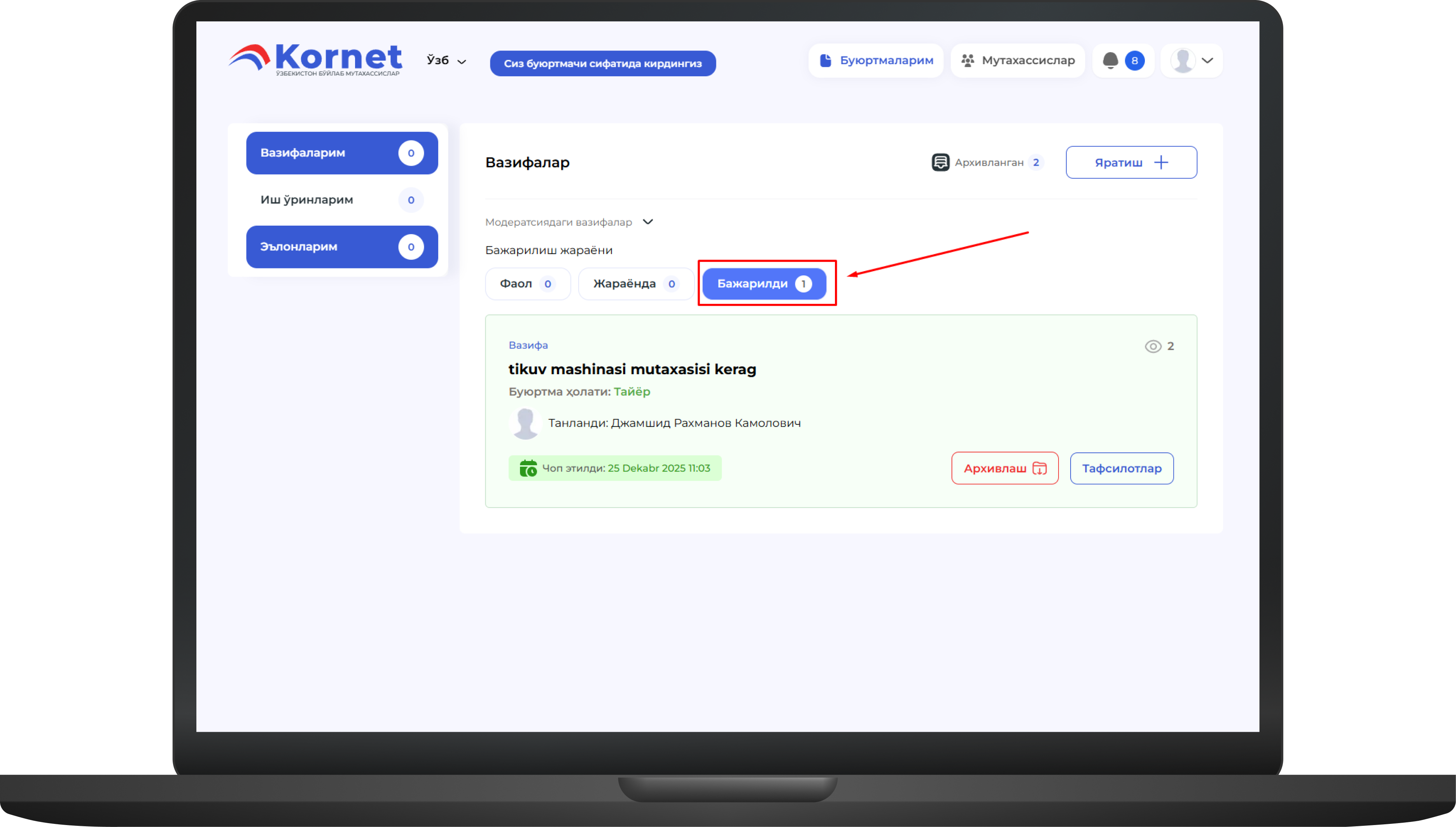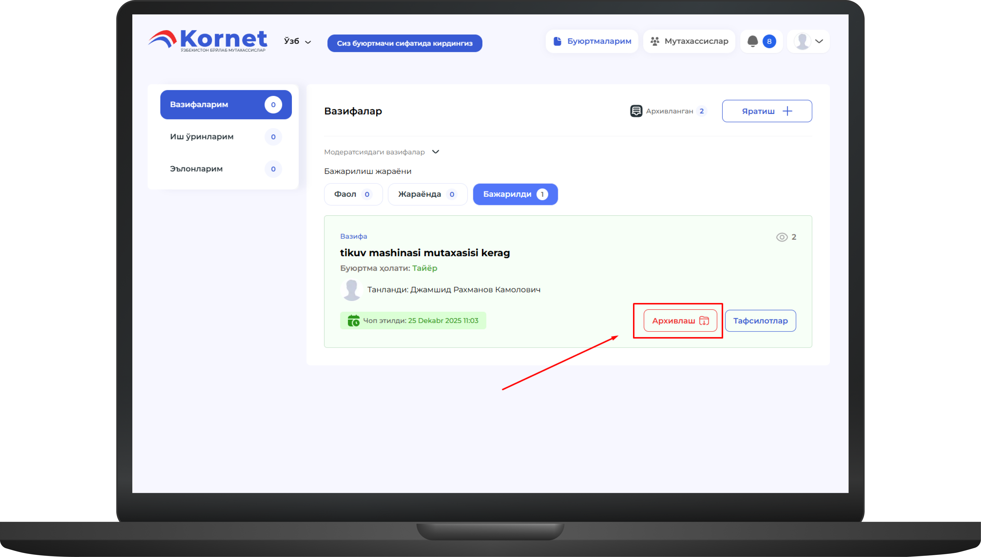 Topshiriq yakunlangandan so‘ng, «Arxivlash» tugmasini bosish orqali uni arxivga o‘tkazishingiz mumkin. Sharh qoldirilgandan so‘ng topshiriq avtomatik ravishda «Yakunlanganlar» bo‘limiga tushsa-da, qo‘lda arxivlash sizga bajarilgan vazifalarni faol jarayonlarning umumiy ro‘yxatidan butunlay yashirish imkonini beradi. «Arxivlash» bo‘limi nima uchun kerak? Interfeys tozaligi: Agar siz faol foydalanuvchi bo‘lsangiz va sizda o‘nlab bajarilgan buyurtmalar bo‘lsa, «Yakunlandi» bo‘limi juda katta bo‘lib ketishi mumkin. Arxivga o‘tkazish faqat eng muhimlarini ko‘zda tutishga yordam beradi. Dolzarb bo‘lmaganlarni yashirish: Agar siz topshiriq yaratgan bo‘lsangiz-u, lekin uni e’lon qilishdan fikringizdan qaytgan bo‘lsangiz yoki qidiruvni bekor qilgan bo‘lsangiz, ko‘zingizga tashlanmasligi uchun uni arxivga yuborishingiz mumkin. Ma’lumotlar xavfsizligi: Arxivlashtirilgan topshiriqlar odatda menyuning chuqurroq qismida yashirilgan bo‘ladi. Bu ishlar tarixini saqlab qolishni xohlagan, lekin yaqin orada unga qaytishni rejalashtirmagan holatlar uchun qulaydir. Bu amaliyotda qanday ishlaydi Tanlash: Siz yakunlangan yoki bekor qilingan topshiriqlar bo‘limiga kirasiz Harakat: «Arxivlash» tugmasini yoki belgisini bosasiz. Natija: Topshiriq asosiy ro‘yxatlardan yo‘qoladi va maxsus jildga (Arxivga) o‘tadi.