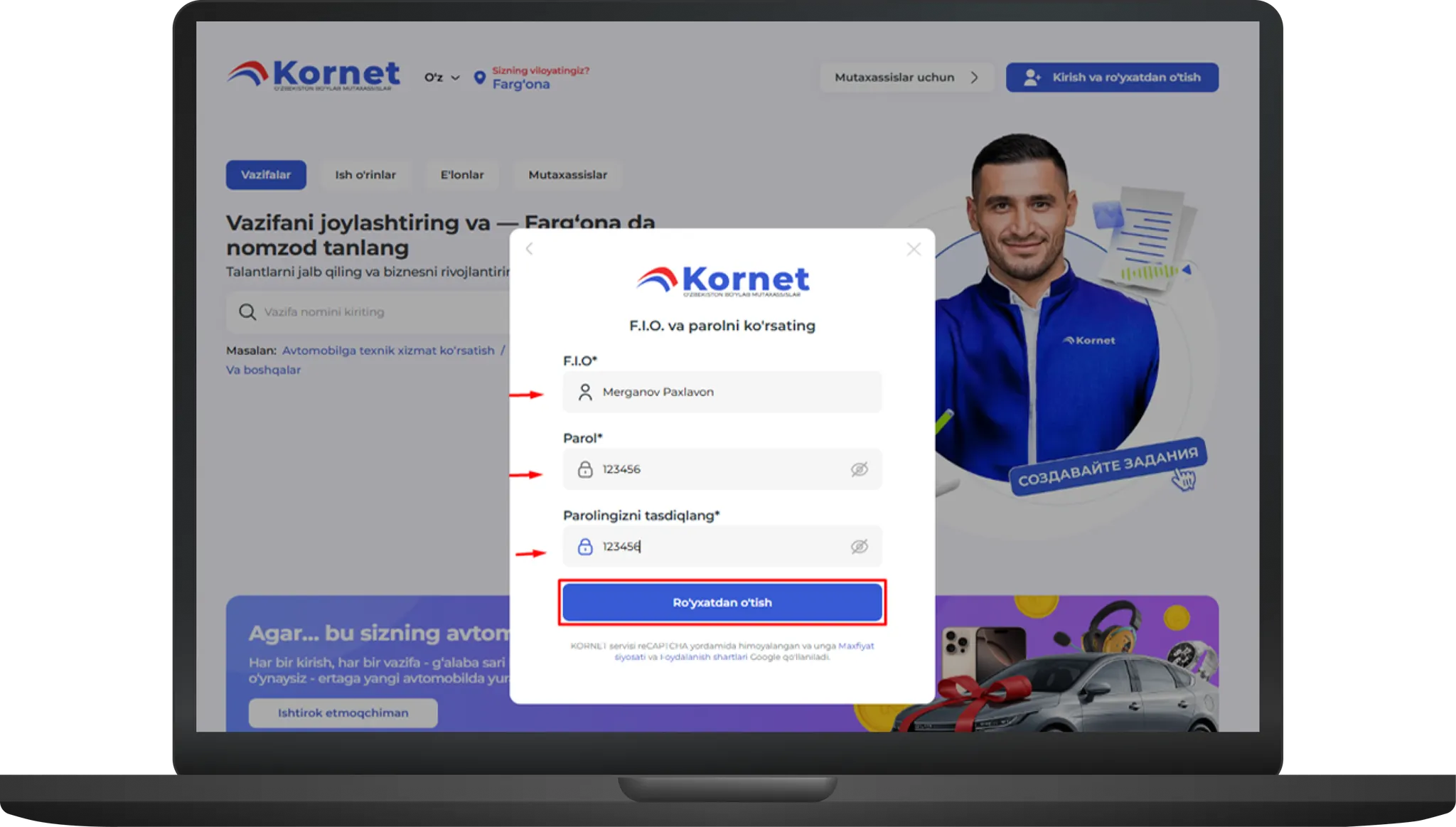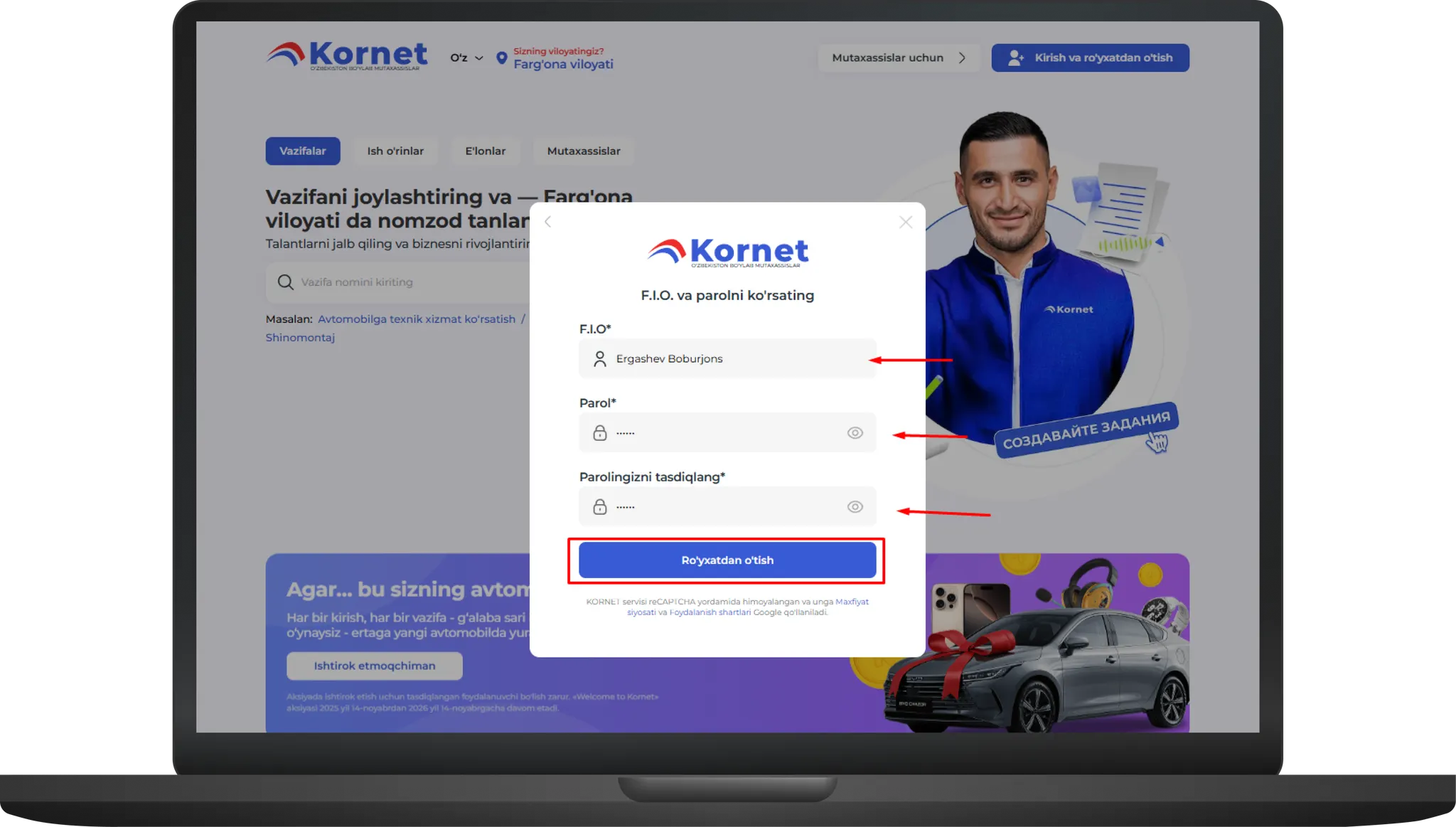 Barcha maydonlarni to‘ldirgandan keyin «Ro‘yxatdan o‘tish» tugmasini bosing.image.png1.05 MB