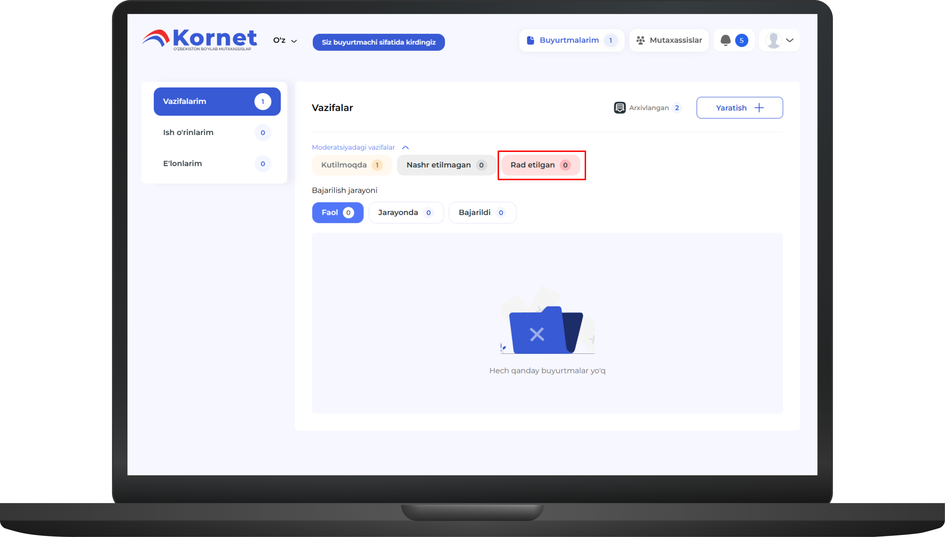 Izoh qoldirganingizdan so‘ng, topshiriq yakunlanadi va u «Yakunlangan» bo‘limida ko‘rsatiladi. Shaxsiy kabinetdagi tartib Sizning ishchi ro‘yxatingiz tozalanadi. «Faol» bo‘limida faqat hozirgi vaqtda dolzarb bo‘lgan vazifalar qoladi, bajarilgan topshiriq esa tarixga o‘tkaziladi. Agar siz platformadan tez-tez foydalansangiz, bu buyurtmalar ichida chalkashib ketmaslikka yordam beradi.