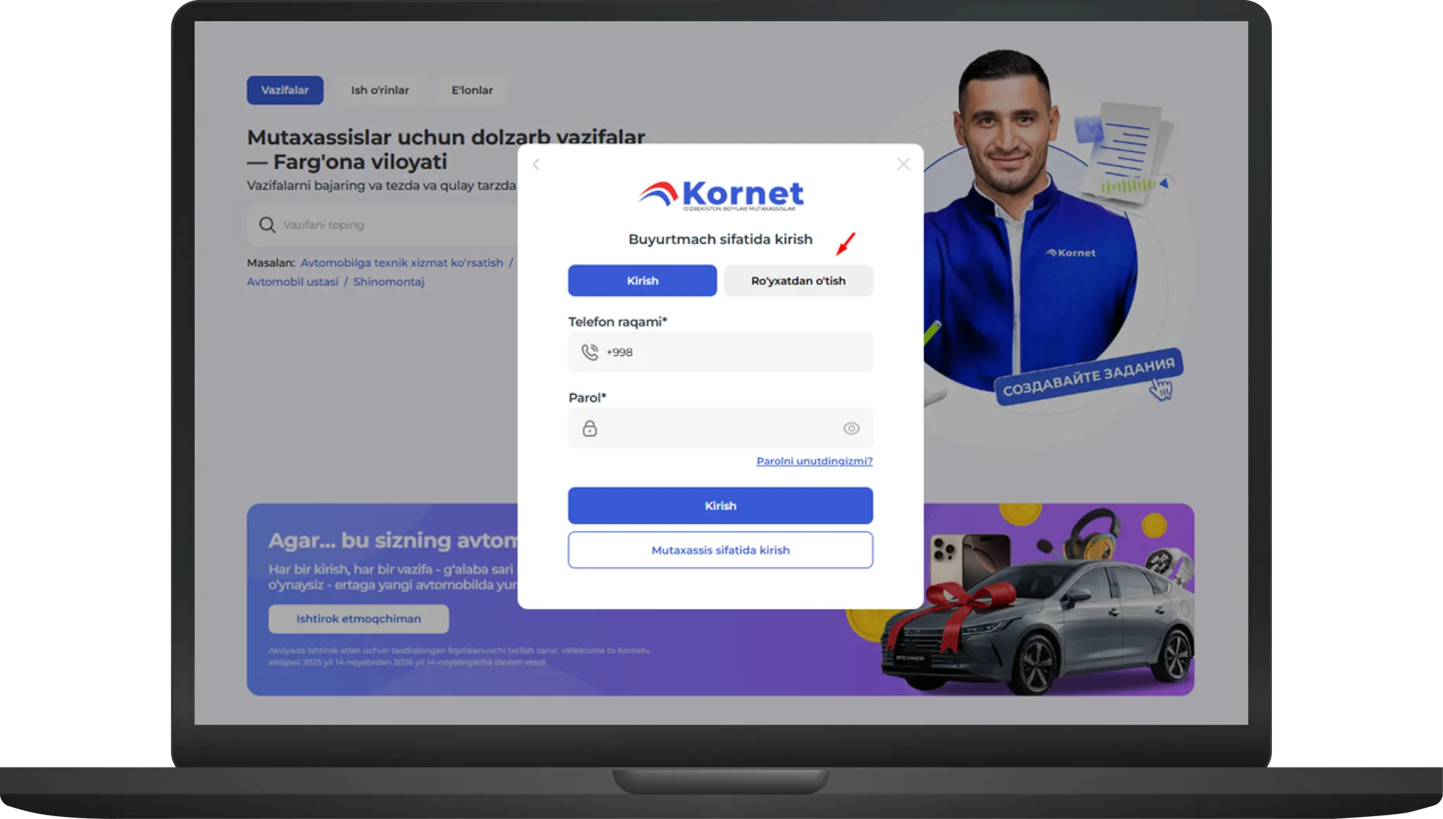 Veb-saytning asosiy sahifasida "Kirish" yoki "Ro'yxatdan o'tish" tugmasini toping. Ikkala tugma ham bir xil oynaga - kirish va rol tanlash oynasiga olib boradi.image.png1.18 MBRolingizni tanlang — "Mijoz" Oyna ochilgandan so'ng, rol tanlovi paydo bo'ladi. Bu yerda siz mijozmi yoki mutaxassismisiz, ko'rsatish muhim. Bizning holatda, biz "Mijoz" ni tanlashimiz kerak.image.png1.11 MB Ikki yorliqli oynada "Ro'yxatdan o'tish" yorlig'ini tanlang. image.png1.04 MBKeyin, siz ikki yorliqli interfeysni ko'rasiz: