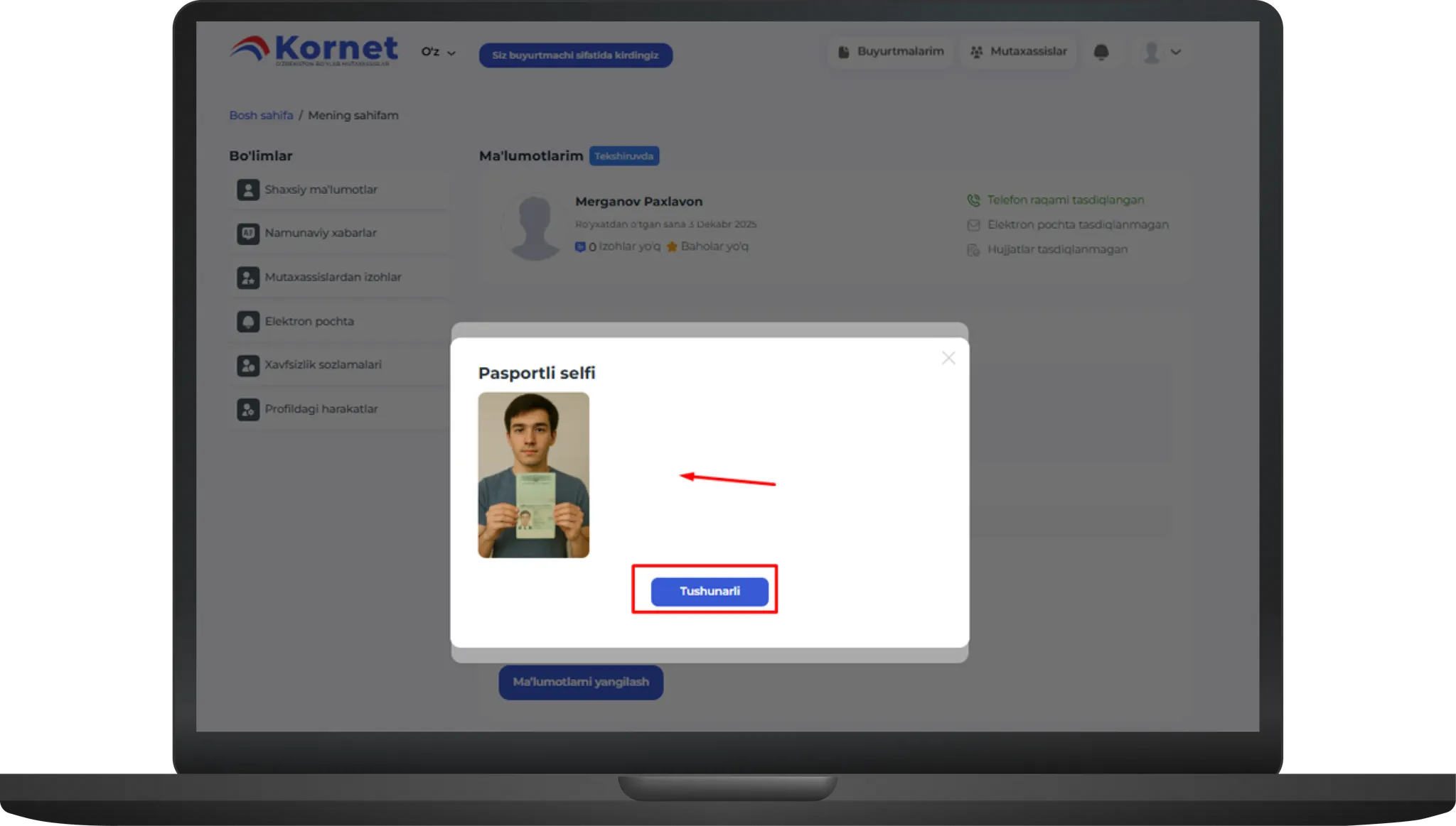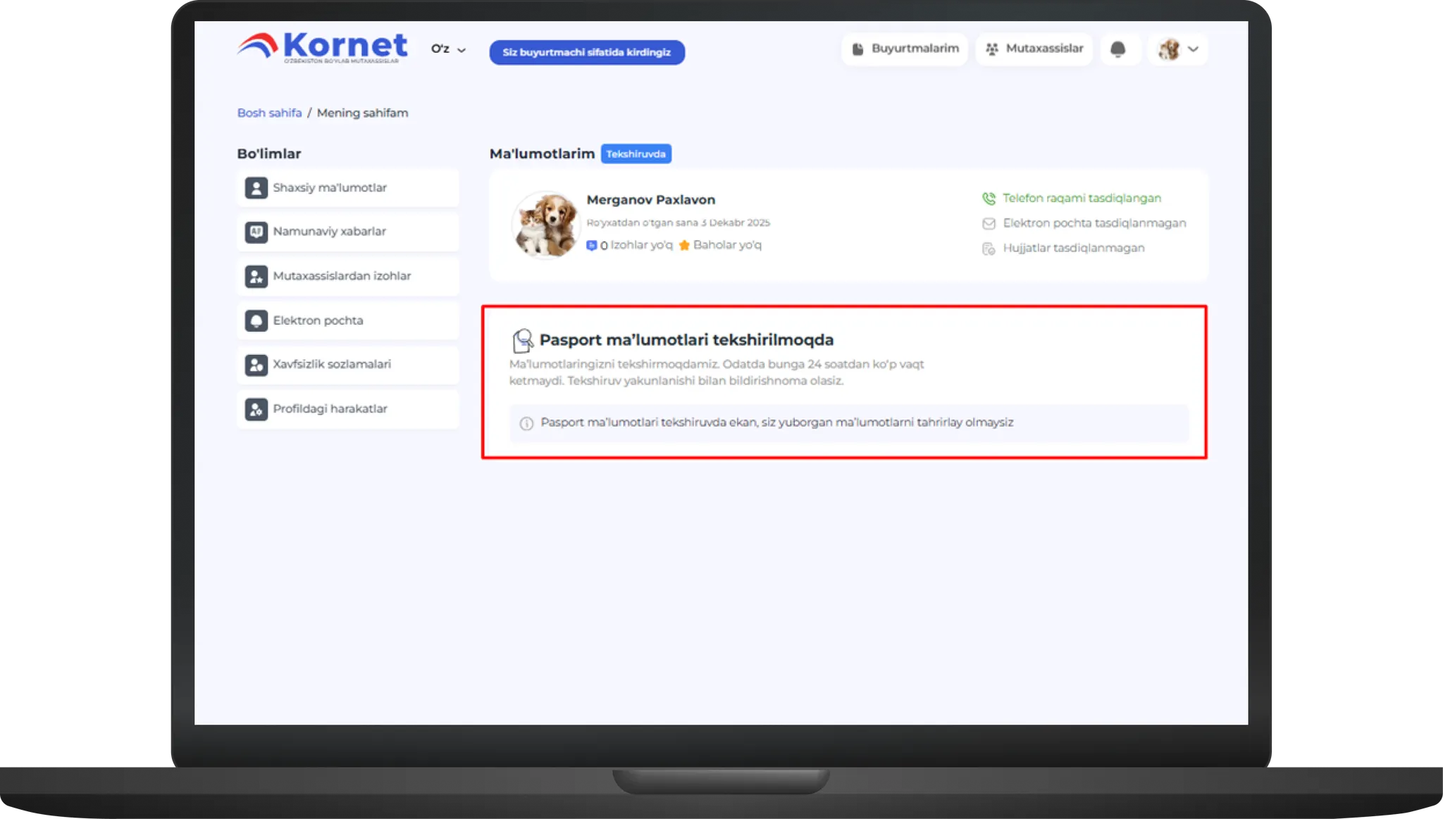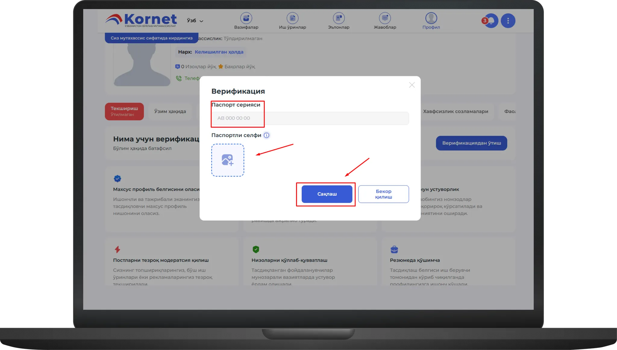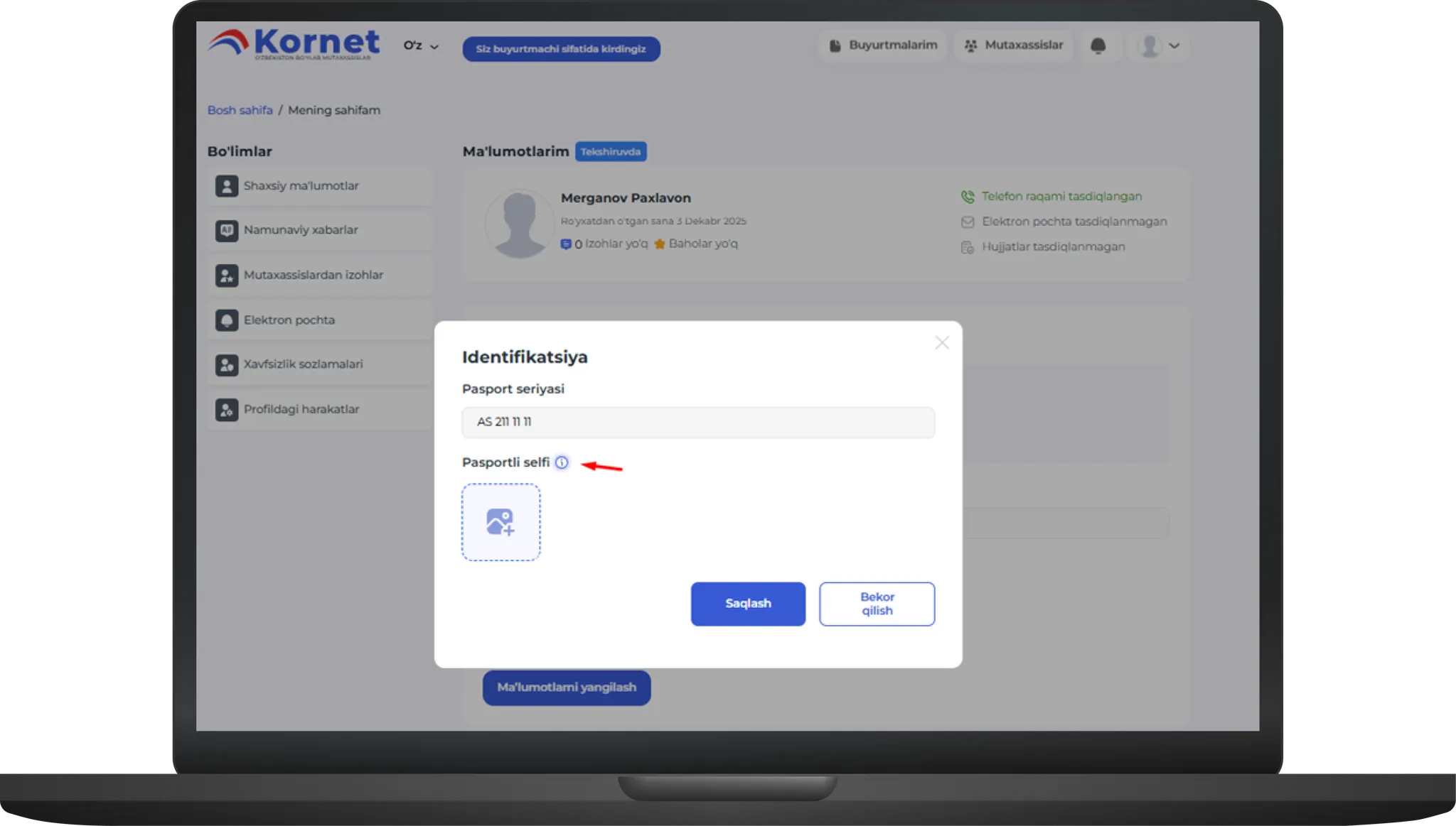 Sizning ma`lumotlaringiz tekshirish uchun yuboriladi va maxsus identifikatsiya belgisini olish imkoniyatini paydo bo`ladi. Ma’lumotlar to`liq to`ldirilgandan keyin tekshiruvga kelib tushadi va moderatorlarimiz tomonidan tekshiriladi, akkaunt muvaffaqiyatli tekshiruvdan o`tsa xabarnoma yuboriladi yoki profilda tekshirildi xolatiga o`zgaradi image.png765.78 KB Tasdiqlash - Pasportni seriyasini kiriting: “Passport seriyasi” maydoniga hujjatingiz ma’lumotlarini kiriting. - Pasport Bilan Selfini Yuklang: “Passport bilan selfie” bulimidagi “+” belgisiga bosing va rasmni kurilmadan yuklang. - Ma'lumotlar yuboring: "Ma'lumotlarni saqlashni" bosing.