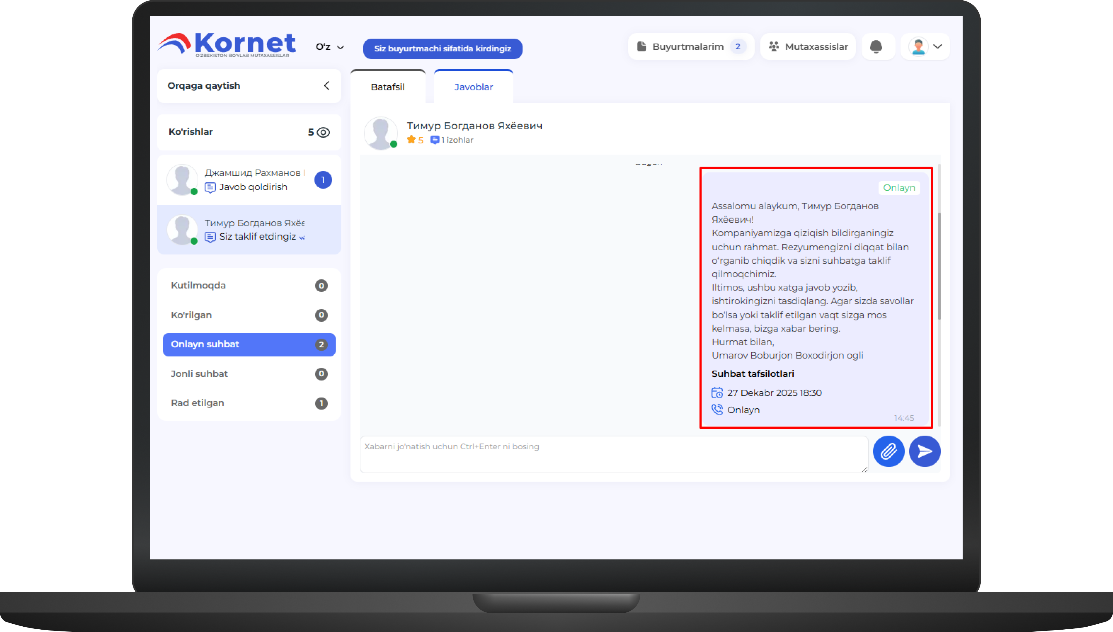 Yozish tugmasini bosing Bosilgandan keyin chat avtomatik ochiladi. Xabarlar yuboring Chatda quyidagilar mumkin: matnli xabarlar yozish savol bermoq tafsilotlar, muddatlar va narxni muhokama qilish Javoblarni oling Javoblar chatda real vaqtda ko‘rsatiladi. Barcha suhbatlarni ko‘rib chiqing Barcha yozishmalar shaxsiy kabinetdagi "Xabarlar" bo‘limida mavjud. Istalgan vaqtda muloqotni davom ettiring Xabarlar tarixi saqlanadi va istalgan vaqtda ochiladi.image.png1.79 MB