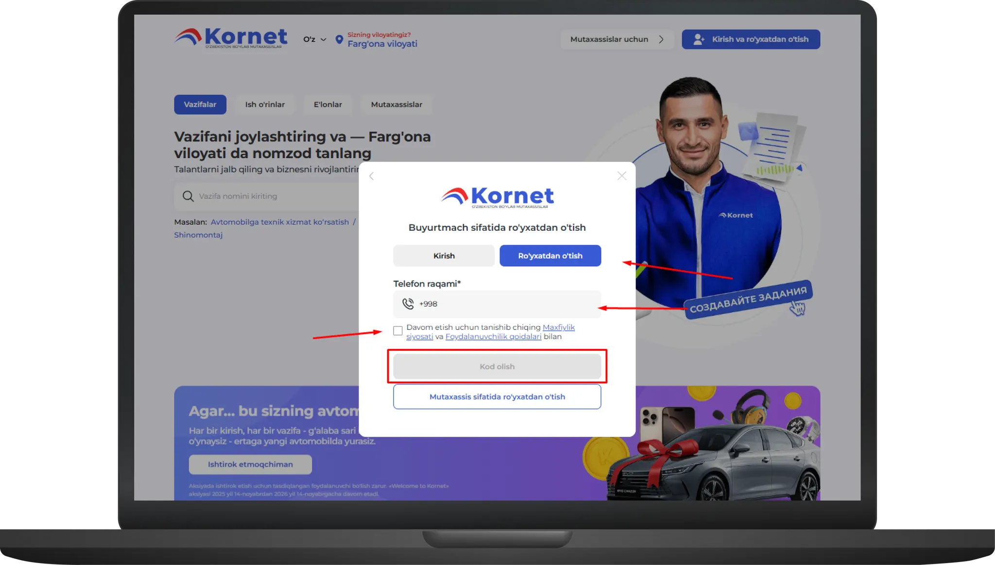 «Ro‘yxatdan o‘tish» vkladkasiga o‘ting.image.png1.01 MBTelefon raqamingizni kiriting Telefon uchun mo‘ljallangan maydonga akkauntga kirish va shaxsni tasdiqlash uchun ishlatiladigan amaldagi telefon raqamingizni kiriting. Telefon maydoni ostida quyidagilarni belgilab qo‘ying: