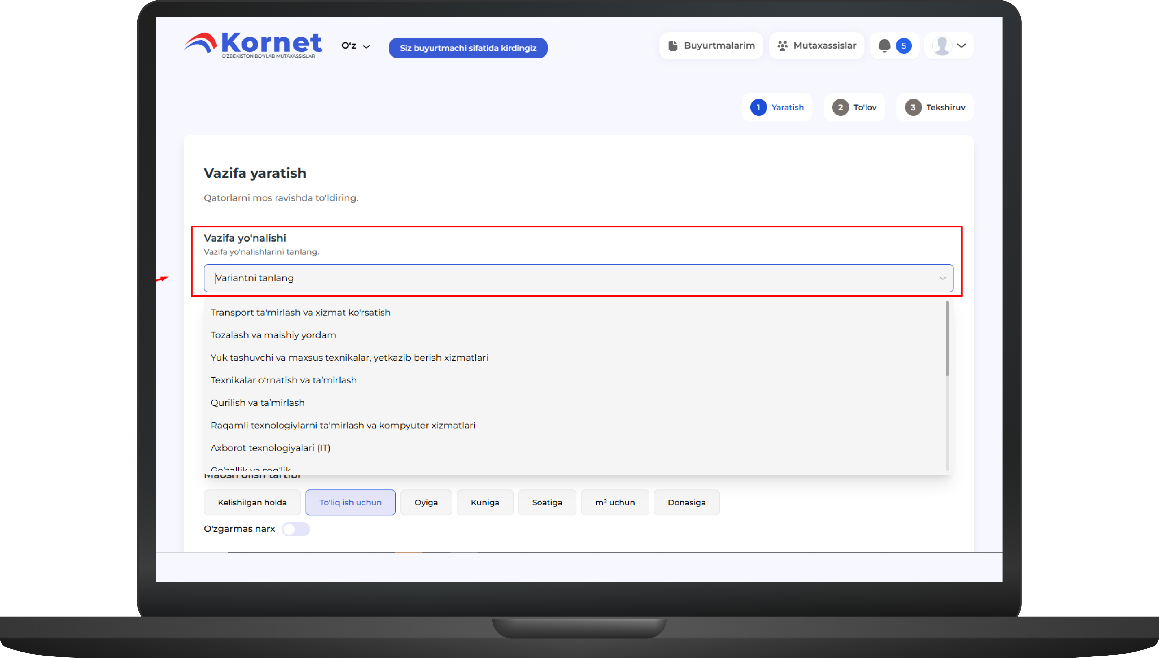 Qanday to‘ldiriladi: Ish to‘liq tayyor bo‘lishi kerak bo‘lgan eng so‘nggi sana va vaqtni ko‘rsating. Reallikka amal qiling Yakuniy muddatni (dedlayn) ko‘rsatayotganda, ishning murakkabligini hisobga oling.Misol: Agar sizga uch xonali uyning devorlarini bo‘yash kerak bo‘lsa, «ertaga soat 10:00 gacha» deb qo‘ymang. Kutilmagan holatlar (material sotib olish, bo‘yoqning qurishi) uchun qo‘shimcha vaqt qoldiring. «Xohishga ko‘ra» va «Juda muhim» formatlaridan foydalaning Topshiriq tavsifida quyidagicha aniqlik kiritish mumkin: «Oxirgi muddat — shanba, soat 18:00, chunki yakshanba kuni jo‘nab ketyapman». Bu kornet.uz mutaxassisiga vaqt hal qiluvchi omil ekanligini tushuntiradi va u agar tezlikka ishonchi komil bo‘lmasa, o‘z xizmatlarini taklif qilmaydi. Bosqichlarga bo‘lish (yirik buyurtmalar uchun) Agar ish ko‘lamli bo‘lsa (masalan, sayt yaratish yoki kapital ta’mirlash), «Tayyor bo‘lish sanasi» ustunida yakuniy muddatni ko‘rsating, tavsifda esa oraliq nazorat nuqtalarini qo‘shing. Nima uchun aniq vaqtni ko‘rsatish muhim? Logistika uchun: Agar bu yetkazib berish yoki ustaning uyga kelishi bo‘lsa, aniq vaqt sizga kun bo‘yi mutaxassisni kutib o‘tirmaslikka yordam beradi. Shoshilinch vazifalar uchun: Agar sizda favqulodda holat bo‘lsa (masalan, quvur yorilib ketgan), tayyor bo‘lish vaqtini «Iloji boricha tezroq» deb belgilang