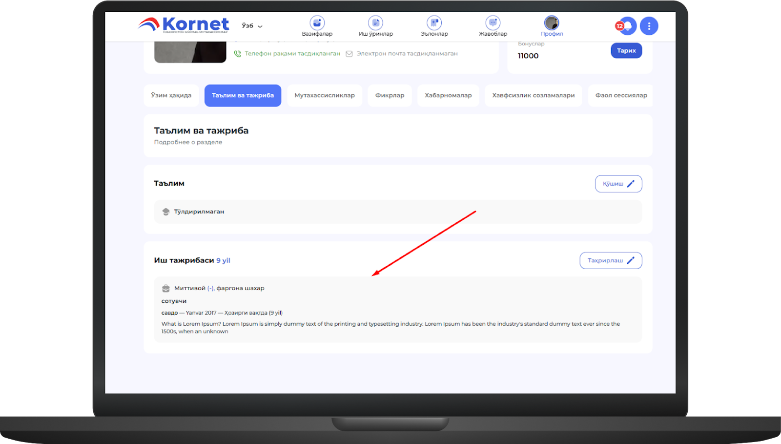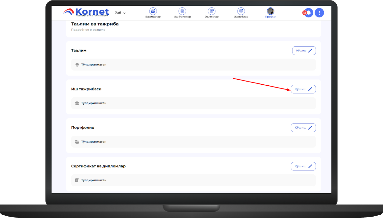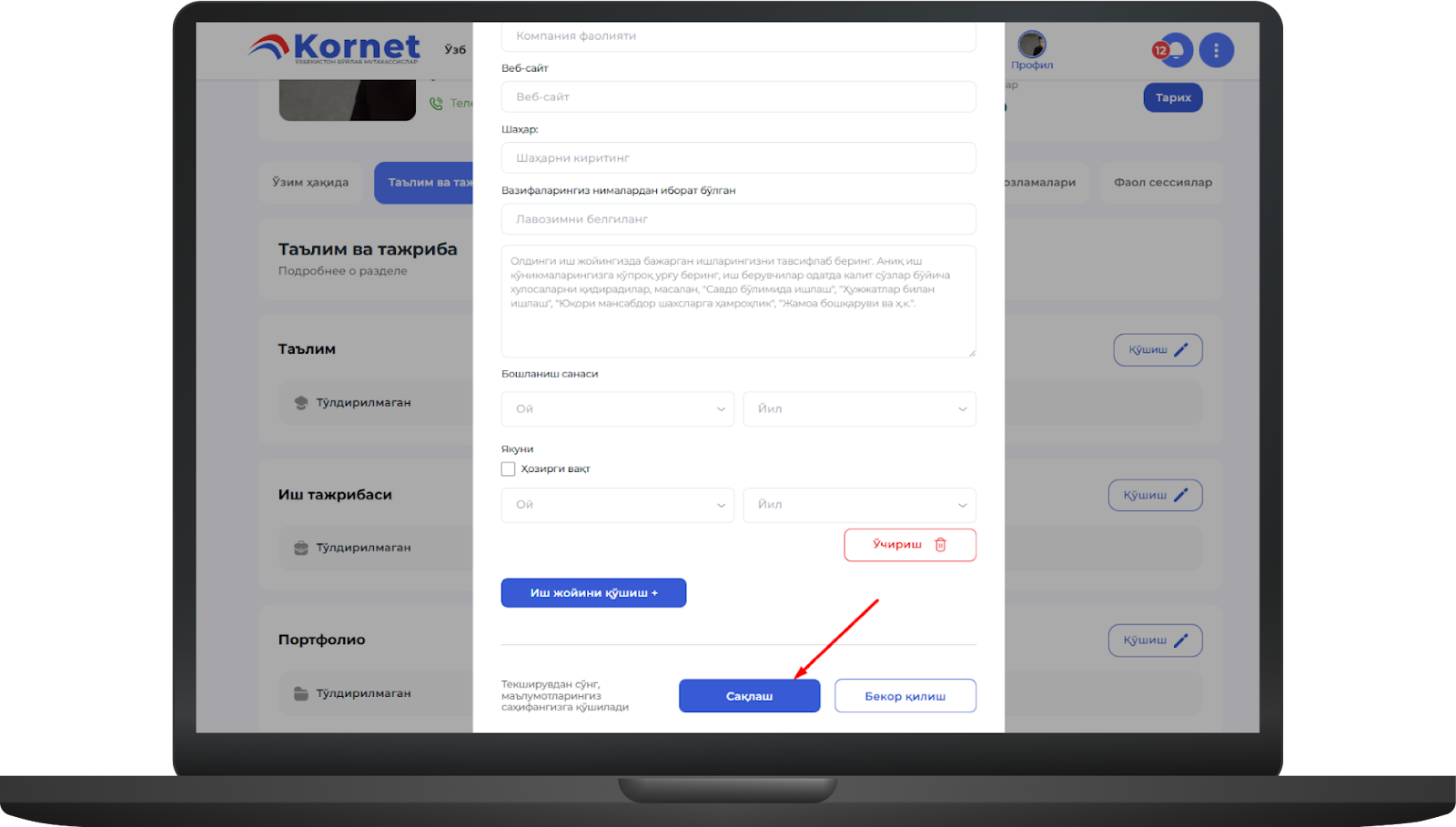 Агар бу саҳифада таълим, иш тажрибаси, портфолио, сертификат ва дипломлар бўлса, уларни шу ерда тўлдиришингиз мумкинimage.png415.23 KBБунинг учун иш тажрибаси мисолида "Қўшиш" тугмасини босингimage.png383.06 KB"Қўшиш" тугмаси босилгандан сўнг "Иш тажрибаси" ойнаси очилади, у ерда маълумотлар тўлдирилгандан сўнг "Сақлаш" тугмаси босиладиimage.png484.87 KBСақлаш тугмаси босилса, профилга тажриба муваффақиятли киритиладиimage.png457.09 KB