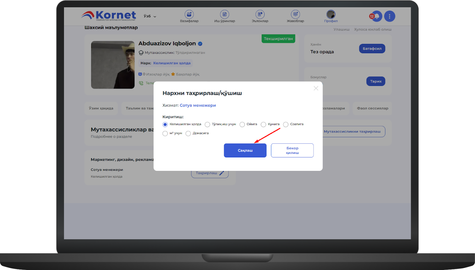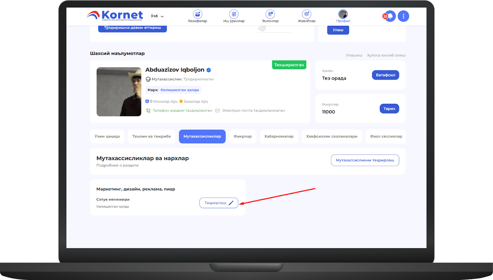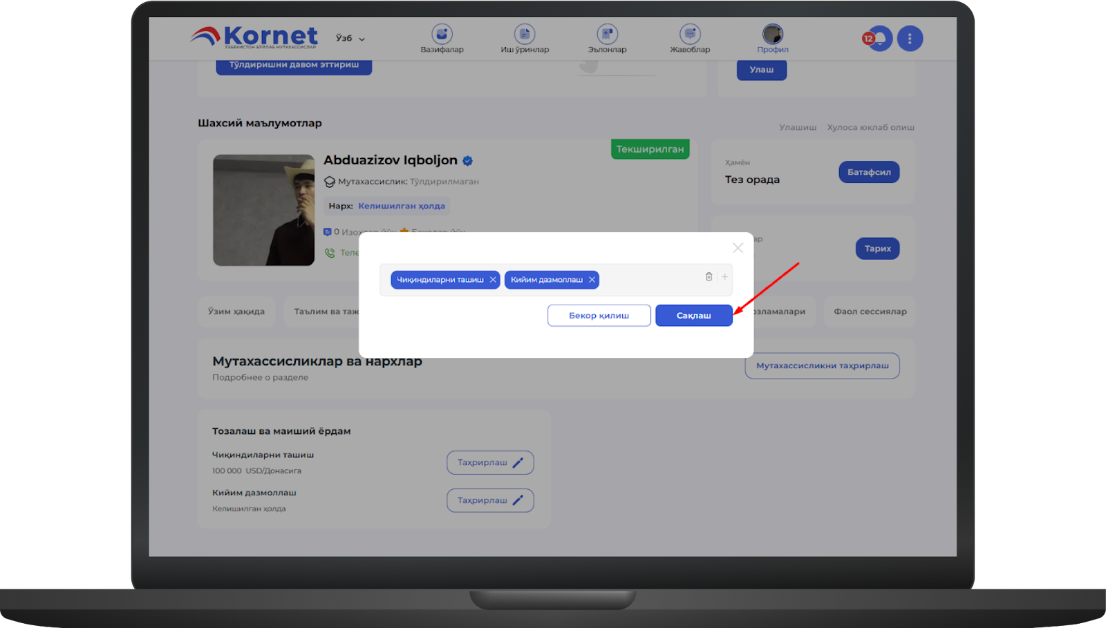 Агар бу саҳифада таълим, иш тажрибаси, портфолио, сертификат ва дипломлар бўлса, уларни шу ерда тўлдиришингиз мумкинimage.png415.23 KBБунинг учун иш тажрибаси мисолида "Қўшиш" тугмасини босингimage.png383.06 KB"Қўшиш" тугмаси босилгандан сўнг "Иш тажрибаси" ойнаси очилади, у ерда маълумотлар тўлдирилгандан сўнг "Сақлаш" тугмаси босиладиimage.png484.87 KBСақлаш тугмаси босилса, профилга тажриба муваффақиятли киритиладиimage.png457.09 KB