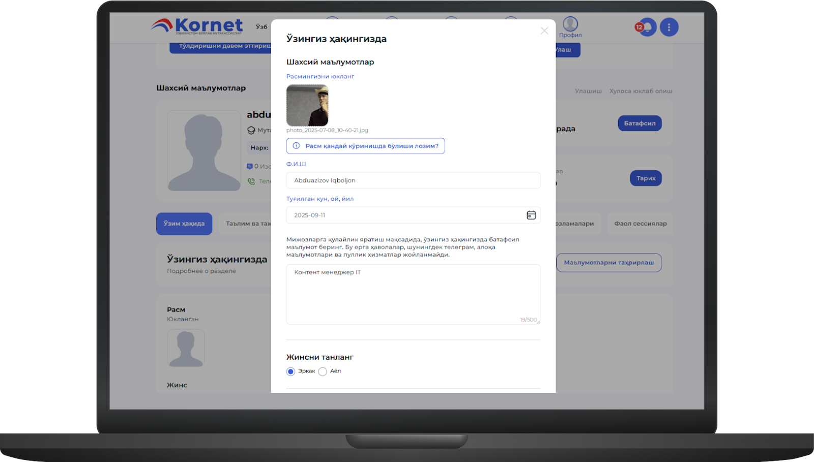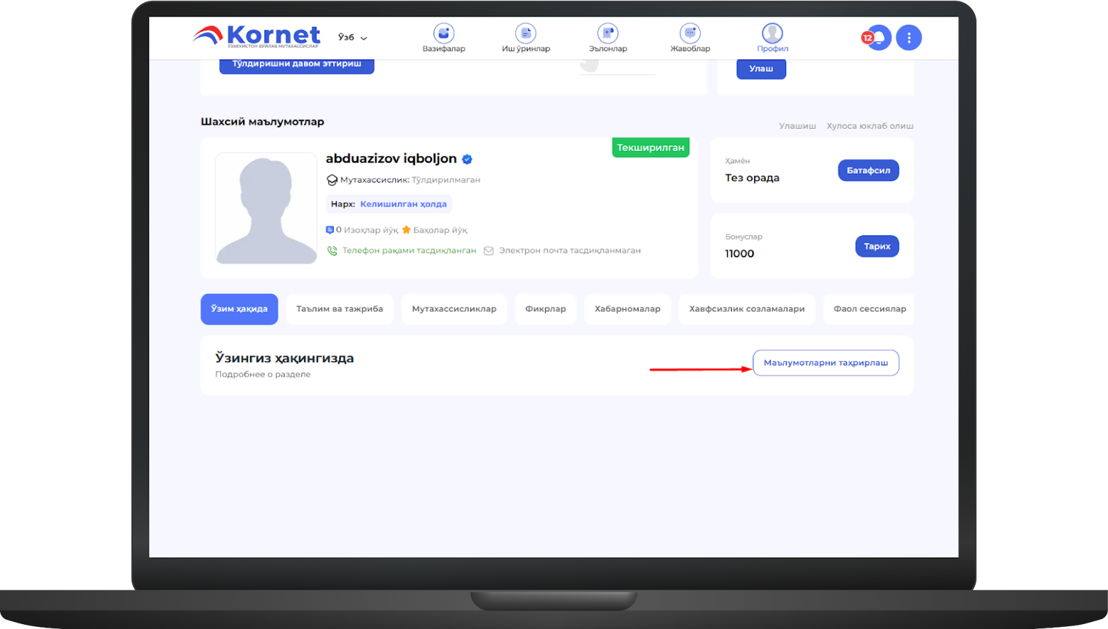 -Ўзингиз ҳақингиздаги маълумотларни киритиш ёки ўзгартириш учун "Маълумотларни таҳрирлаш" тугмасини босингimage.png448.47 KBМаълумотларни тўлдириб ва таҳрирлаб бўлгач, "Сақлаш" тугмасини босинг