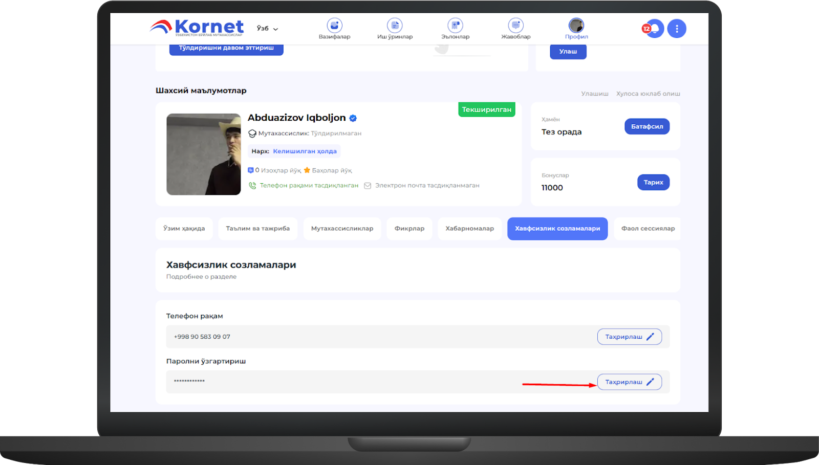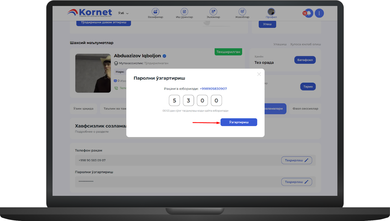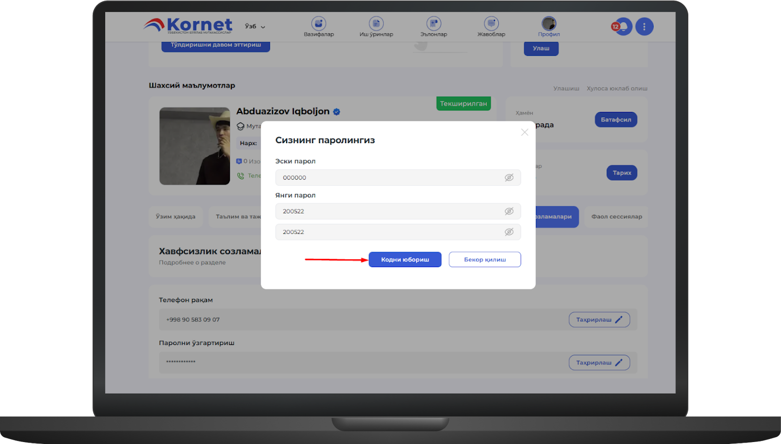 Телефон рақами ёки паролни бу ерда ўзгартиришингиз мумкин масалан, паролни ўзгартириш учун таҳрирлаш тугмасини босингimage.png493.14 KBТаҳрирлаш тугмасини босгандан сўнг, эски пароль ва янги паролни киритинг, сўнгра кодни юбориш тугмасини босингimage.png475.69 KBКодни юбориш тугмаси босилгандан сўнг телефон рақамига СМС-код юборилади ва ушбу ойнага киритилади, сўнгра ўзгартириш тугмаси босилади Шундан кейин пароль муваффақиятли ўзгартириладиimage.png486.54 KB