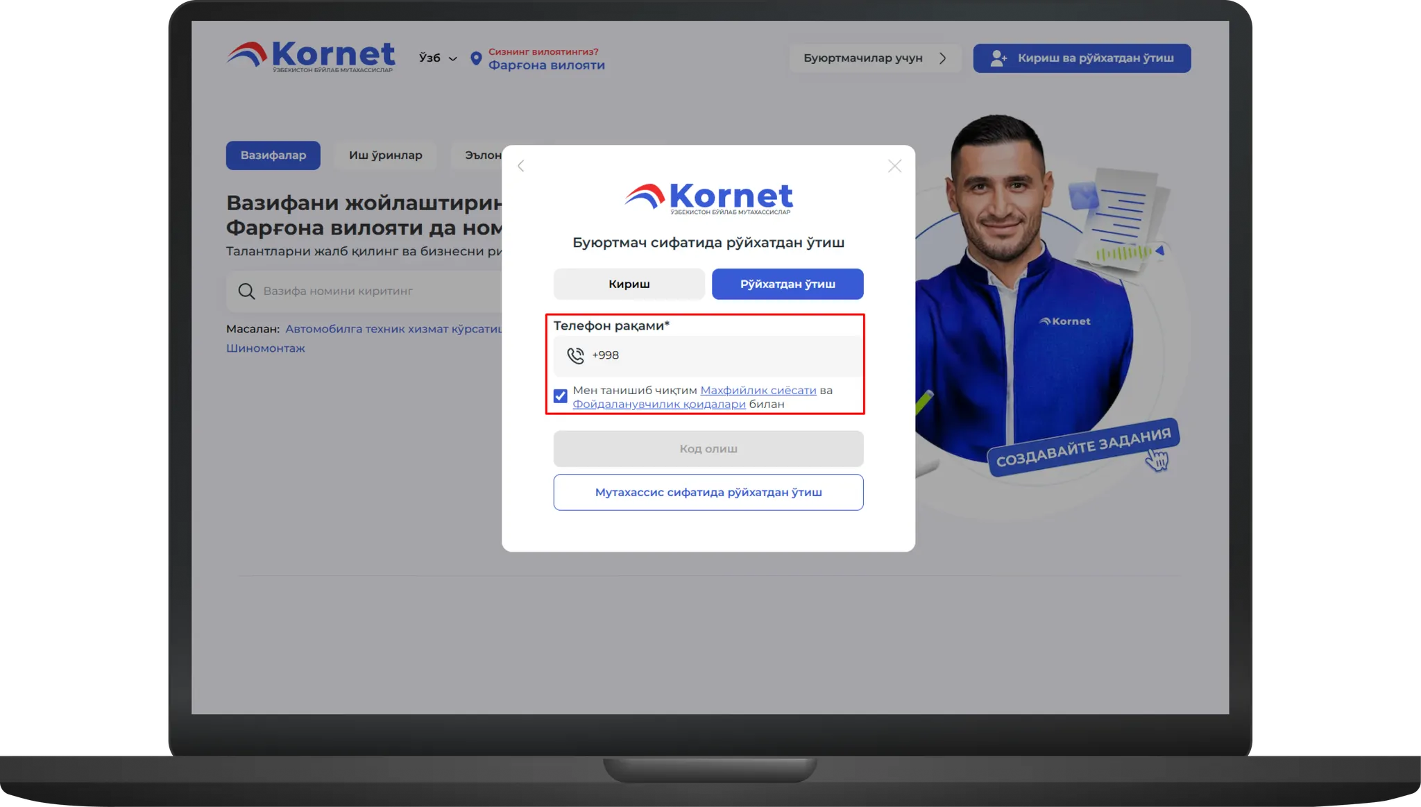 Телефон учун мўлжалланган майдонга аккаунтга кириш ва шахсни тасдиқлаш учун ишлатиладиган амалдаги телефон рақамингизни киритинг. Телефон майдони остида қуйидагиларни белгилаб қўйинг: Фойдаланиш шартларига розилик, Махфийлик сиёсати, Фойдаланувчи келишуви (агар кўрсатилган бўлса).