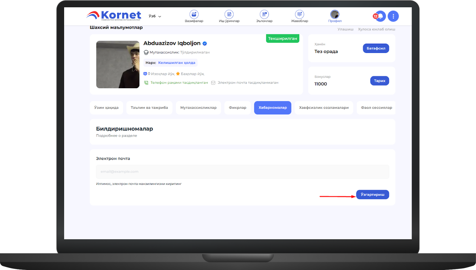 Бу саҳифада билдиришномаларни бошқариш ёки таҳрирлаш мумкин. - Бу ерда таҳрирлаш тугмасини босасиз ва электрон почта манзилингизни киритасизimage.png477.4 KB- Таҳрирлаш тугагандан сўнг сақлаш тугмасини босингimage.png480.2 KB