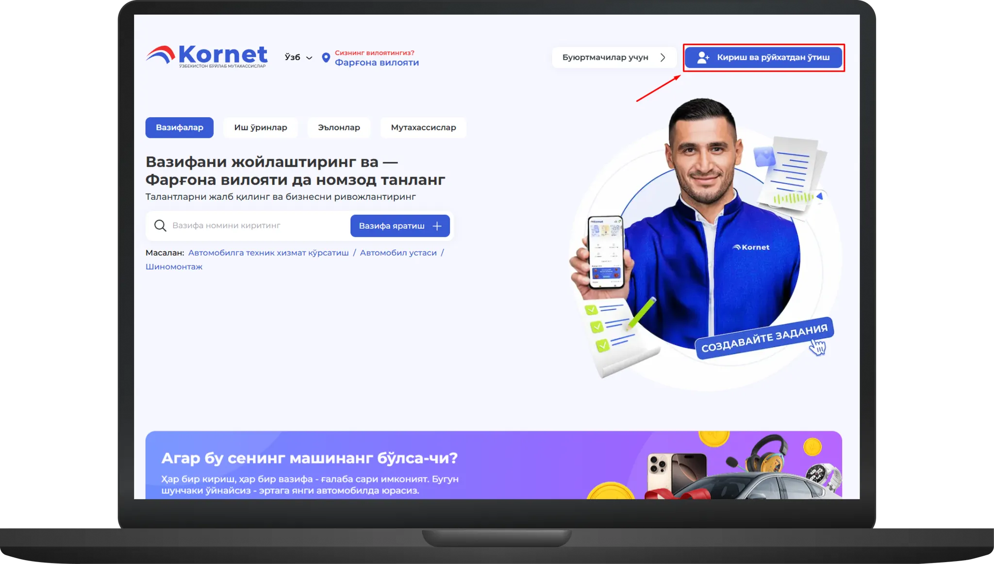 «Кириш» ёки «Рўйхатдан ўтиш» тугмасини босинг.