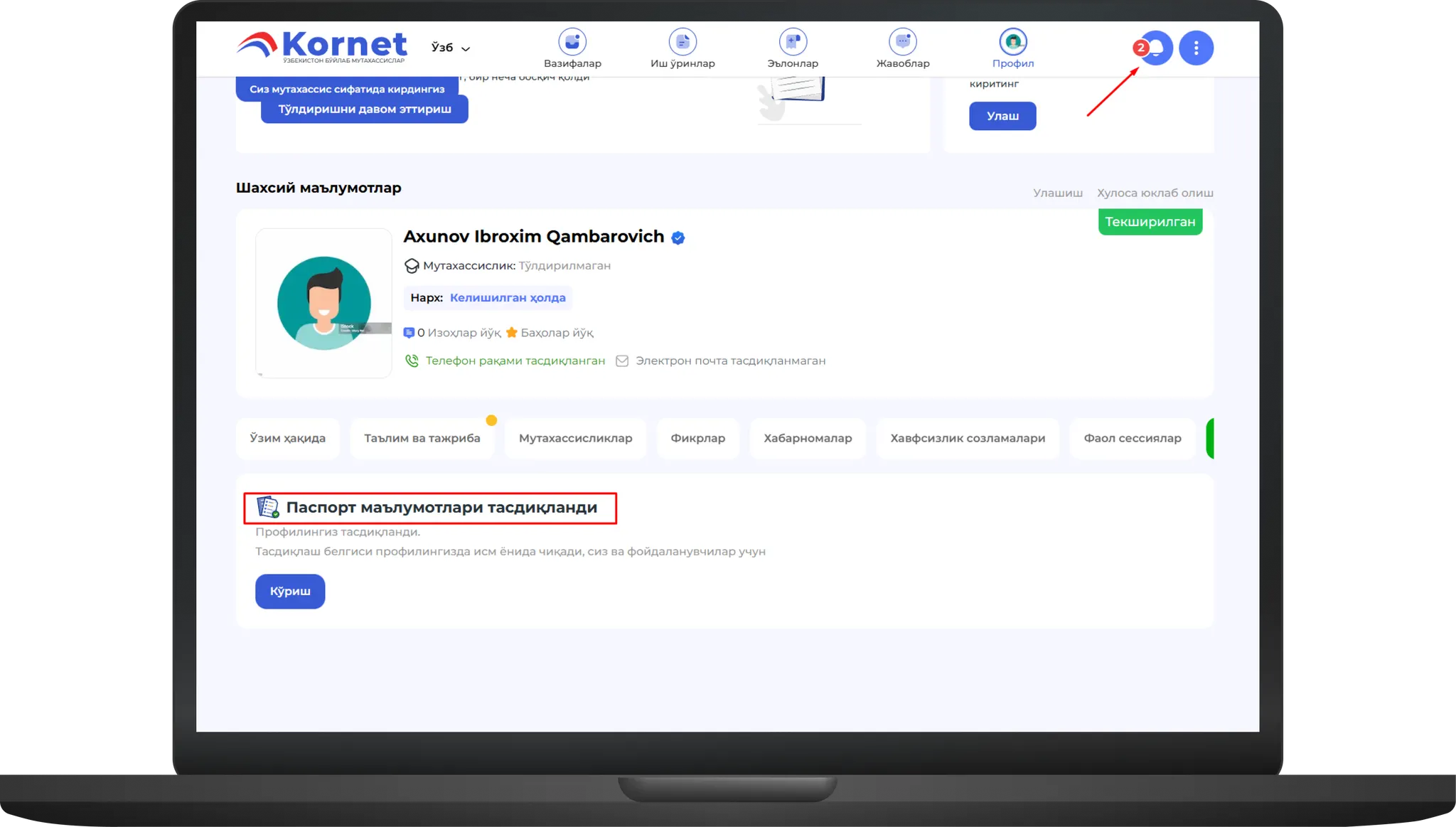 Статус: Блокда «Паспорт маълумотлари тасдиқланди» деган ёзув пайдо бўлди.