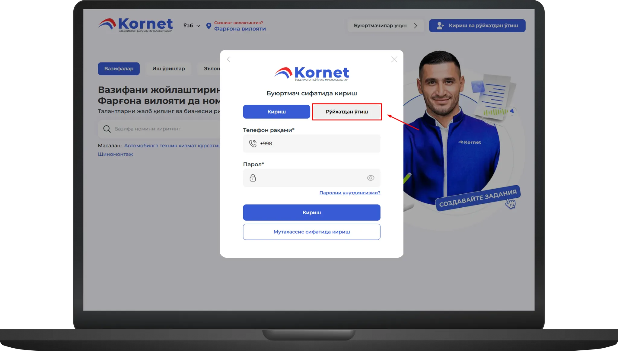 Ойна очилгандан кейин роль танлаш бўлими пайдо бўлади. Бу ерда сиз ким эканингизни кўрсатишингиз муҳим: буюртмачи ёки мутаҳассис. Бизнинг ҳолатимизда «Мутаҳассис»ни танлаш керак.image.png862.54 KBИккита вкладка мавжуд бўлган ойнадан «Рўйхатдан ўтиш» вкладкасини танланг