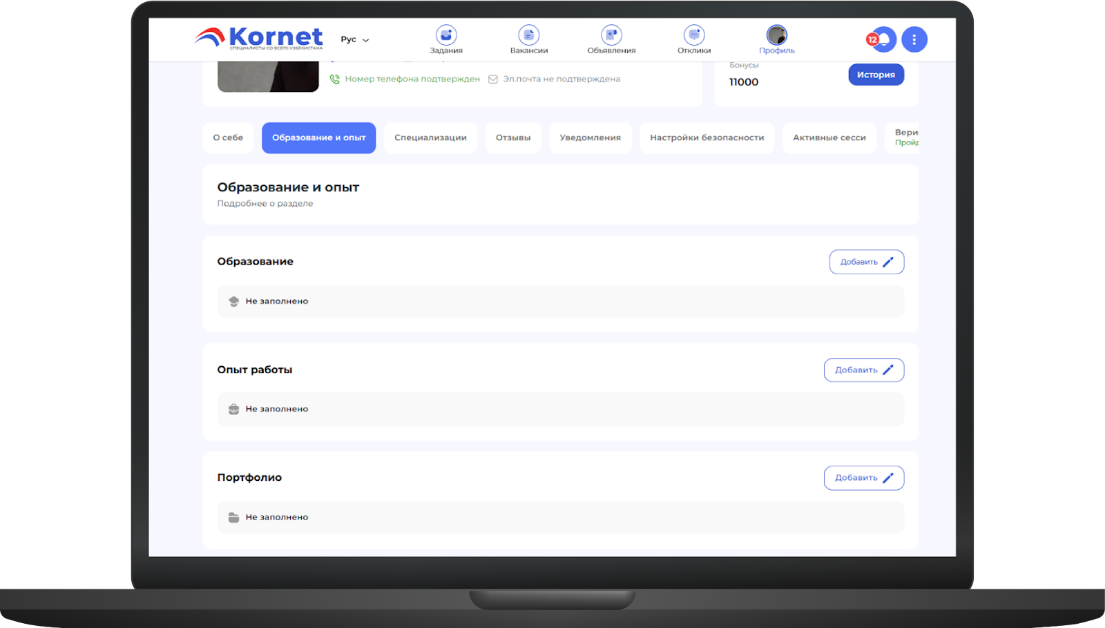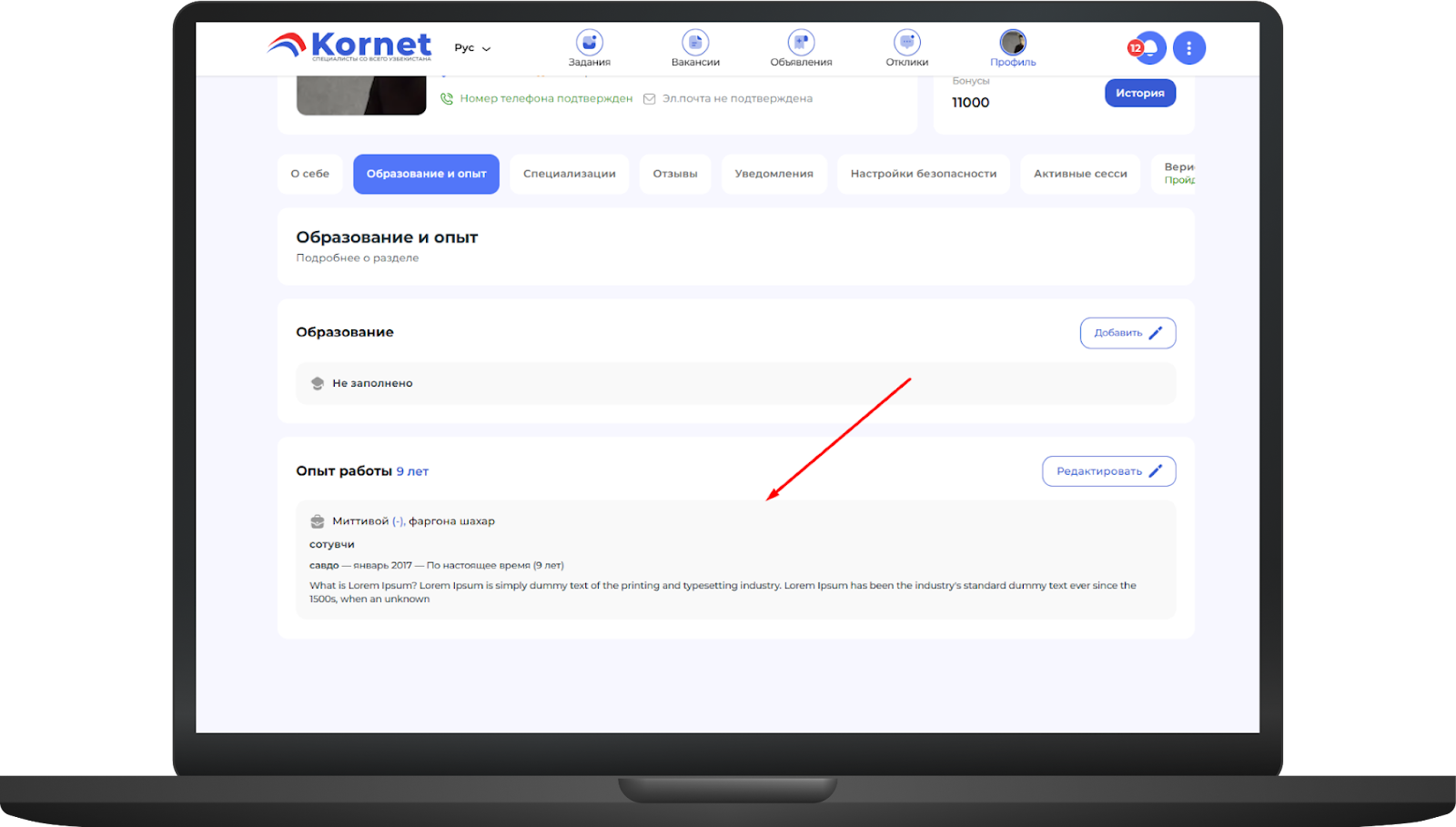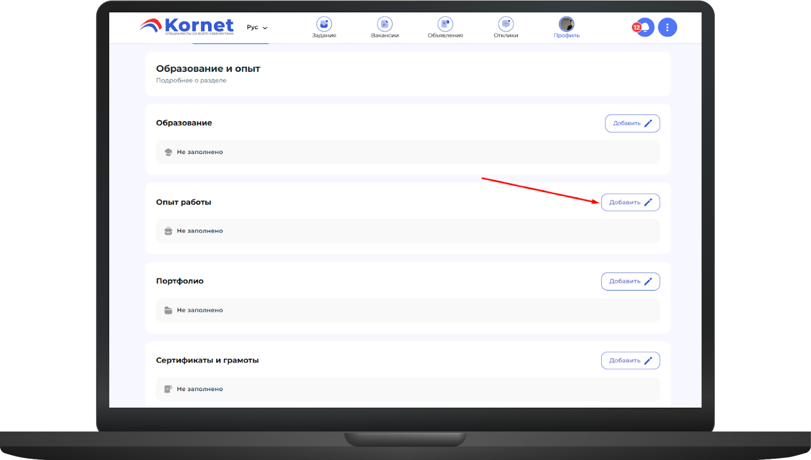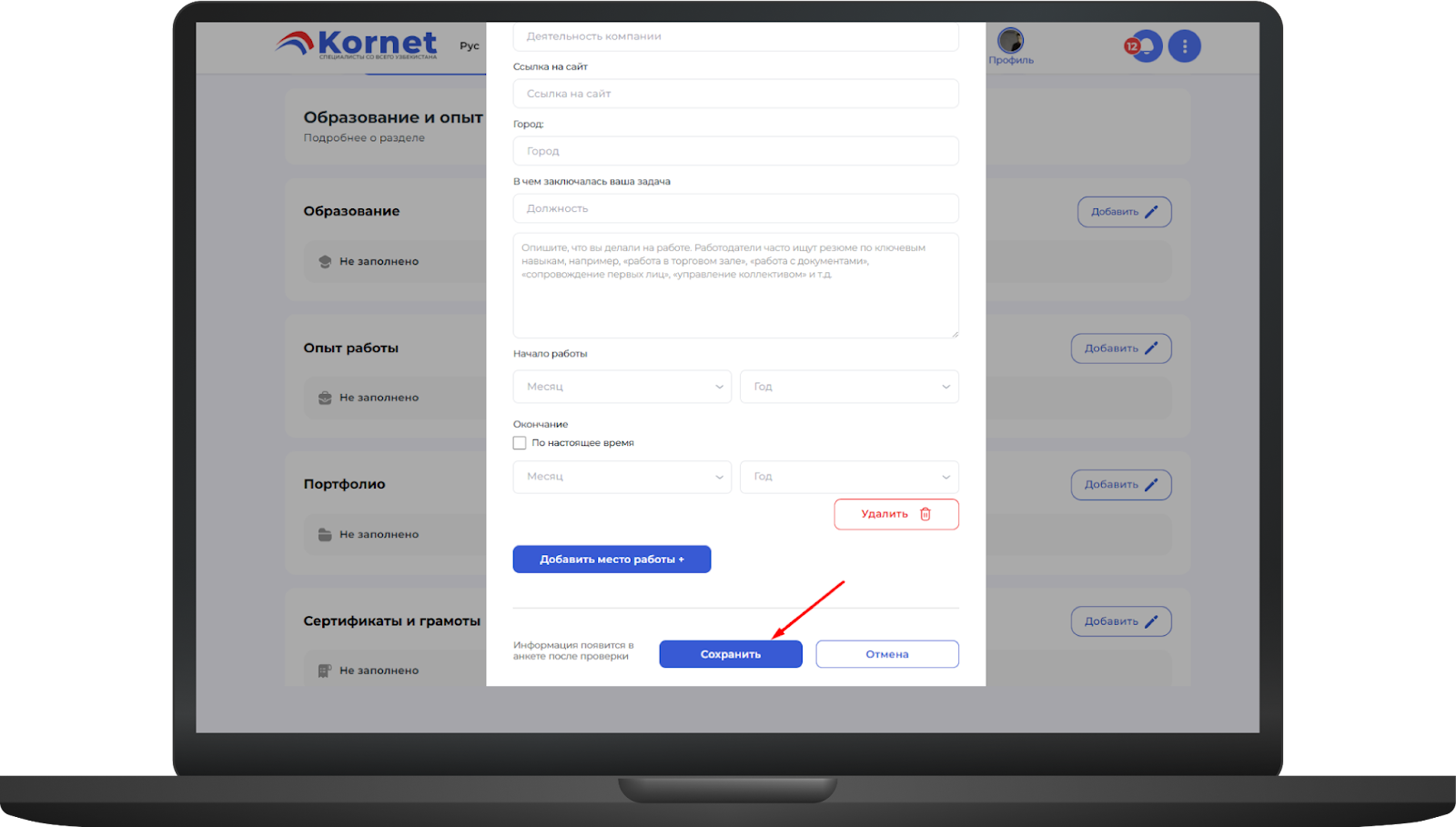 Если на этой странице есть образование, опыт работы, портфолио, сертификаты и дипломы, вы можете заполнить их здесьimage.png415.12 KBДля этого нажмите кнопку "Добавить" в примере опыта работыimage.png381.17 KBПосле нажатия кнопки "Добавить" открывается окно "Опыт работы," где после заполнения данных нажимается кнопка "Сохранить."image.png441.54 KBПосле нажатия кнопки "Сохранить" в профиль будет успешно добавлен опыт работыimage.png448.73 KB