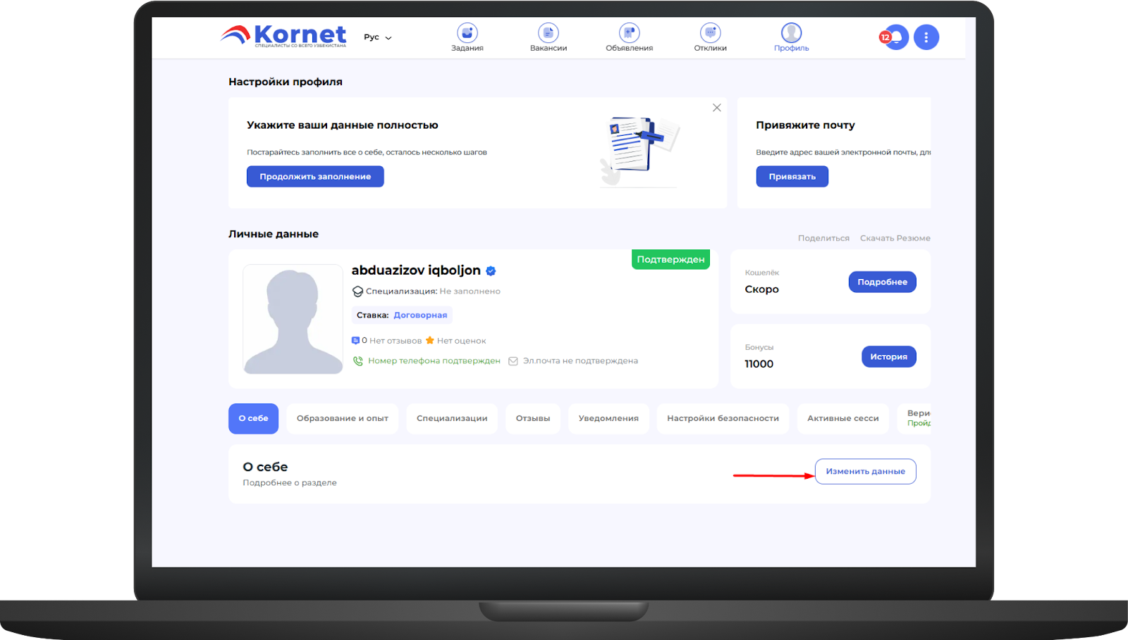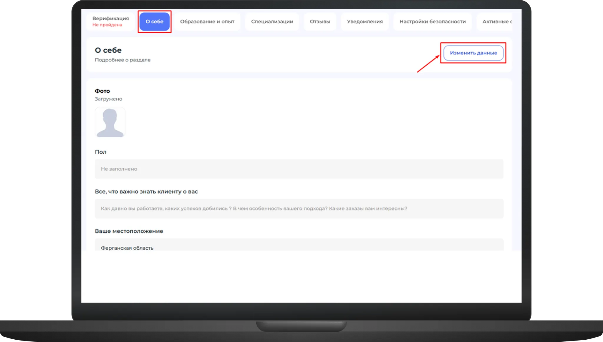 -Нажмите кнопку "Изменить данные," чтобы добавить или изменить информацию о себеimage.png467.57 KBПосле заполнения и редактирования данных нажмите кнопку "Сохранить"