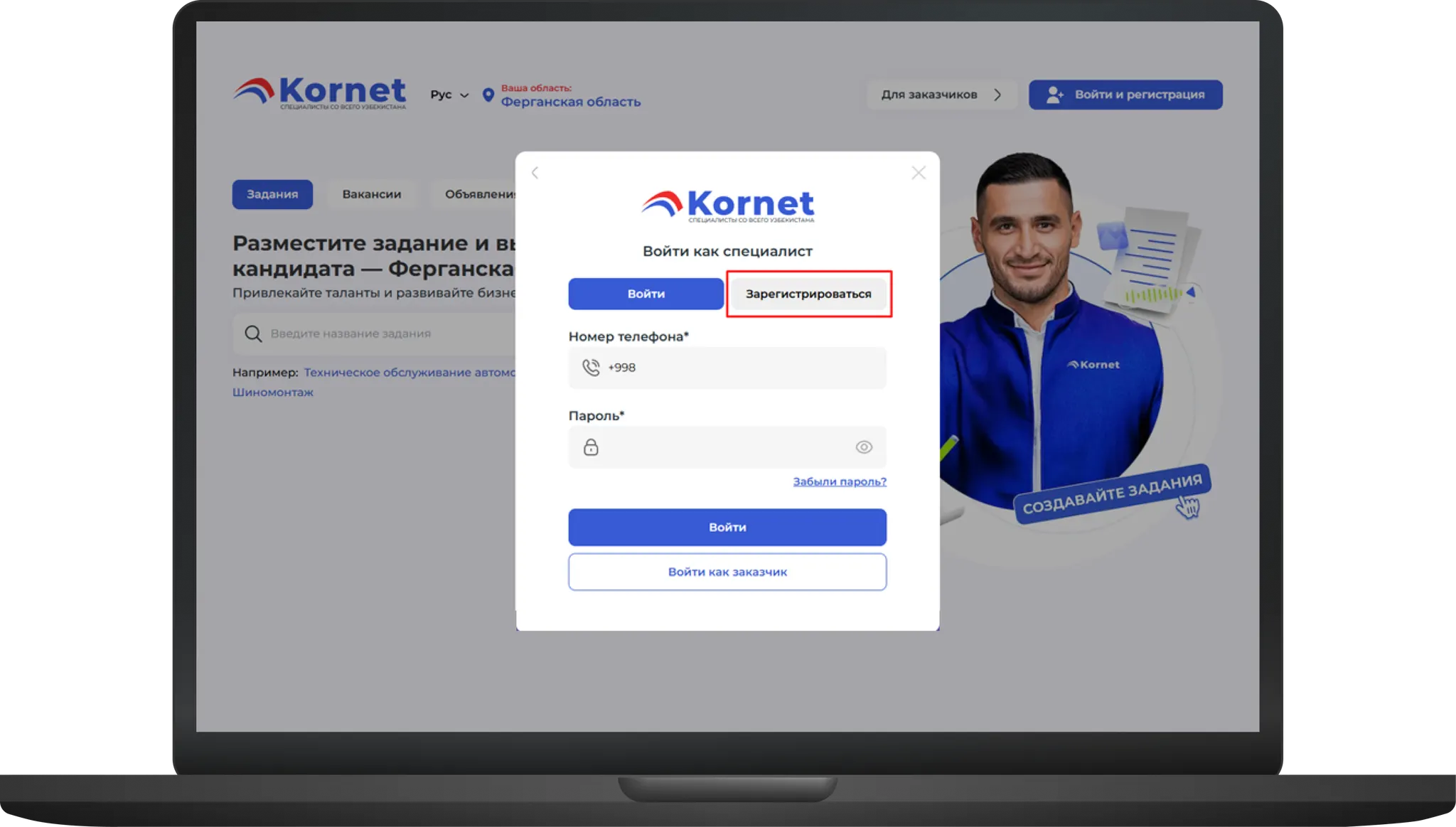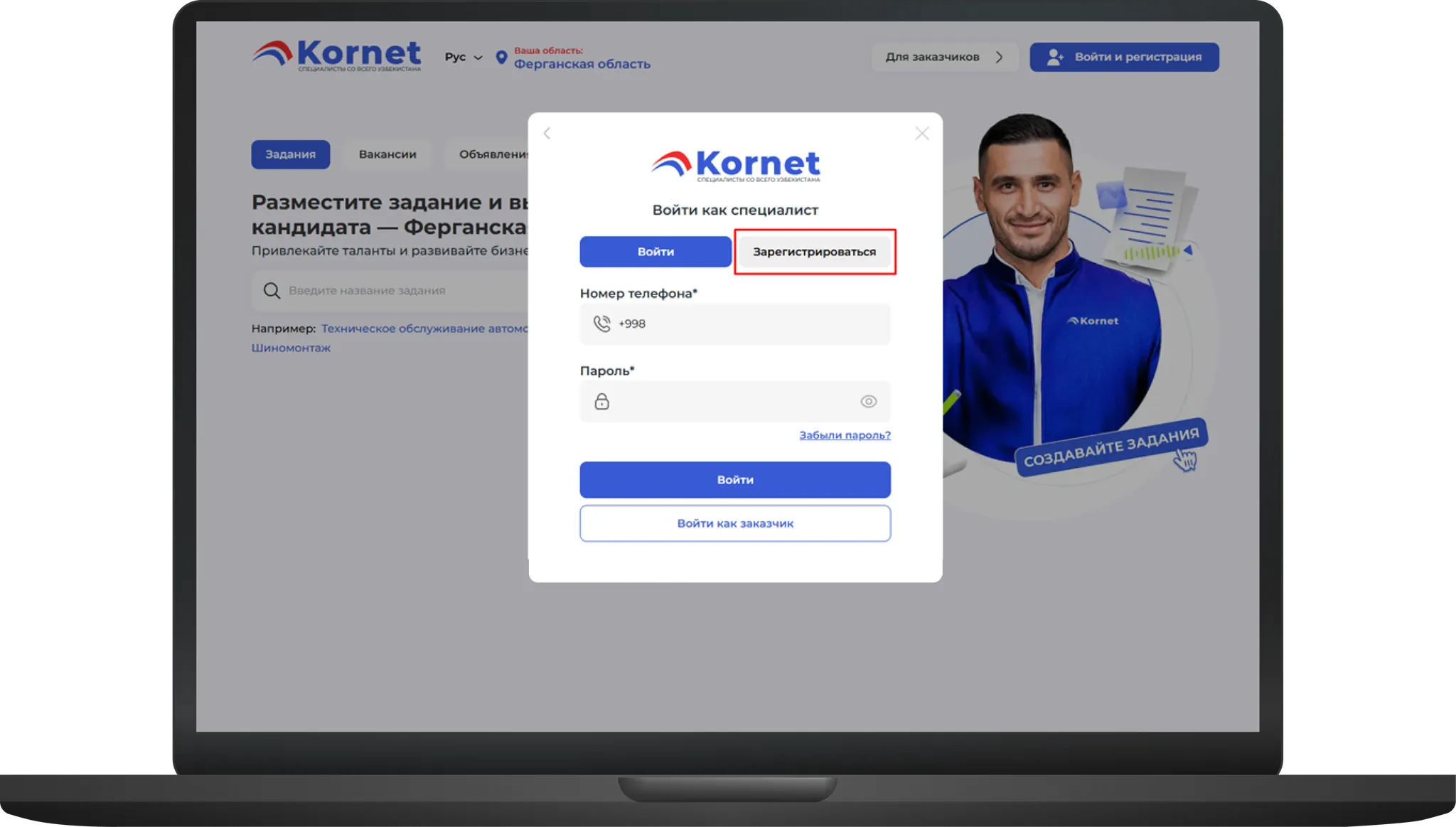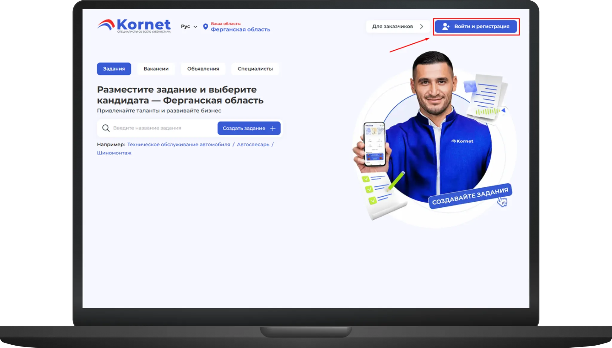 На главной странице сайта найдите кнопку «Войти» или «Регистрация». Обе кнопки ведут к одному и тому же окну — окну входа и выбора роли.image.png911.33 KBВыберите свою роль — «Специалист» После открытия окна появится выбор роли. Здесь важно указать, кто вы: заказчик или специалист. В нашем случае нужно выбрать «Специалист».image.png881 KBВ окне с двумя вкладками выберите вкладку «Регистрация» Далее вы увидите интерфейс из двух табов (вкладок):