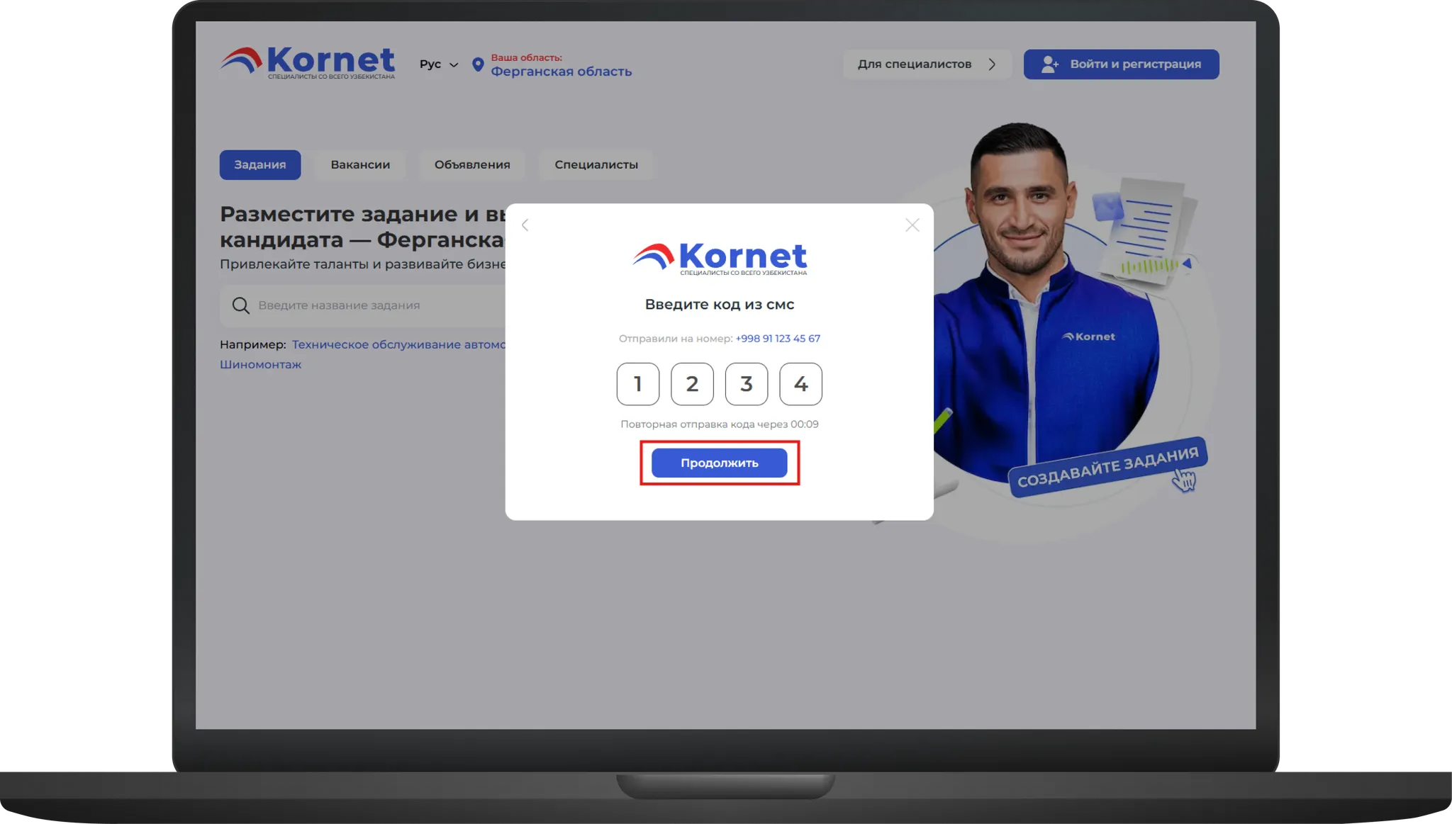 Введите код из SMS в поле, которое появится. Если код не пришёл через минуту — используйте кнопку «Отправить повторно». После ввода правильного кода нажмите «Продолжить»image.png878.07 KBЗаполните финальную форму регистрации