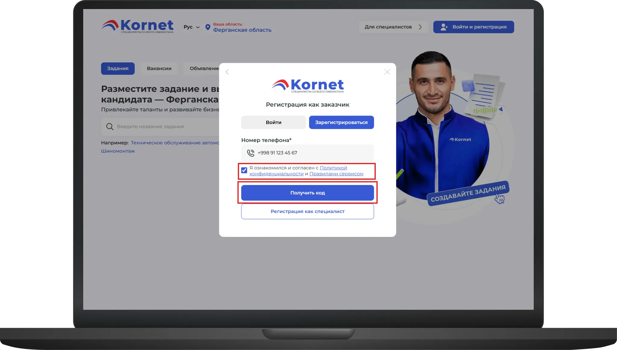 После открытия окна появится выбор роли. Здесь важно указать, кто вы: заказчик или специалист. В нашем случае нужно выбрать «Заказчик»image.png821.82 KBВ окне с двумя вкладками выберите вкладку «Регистрация»